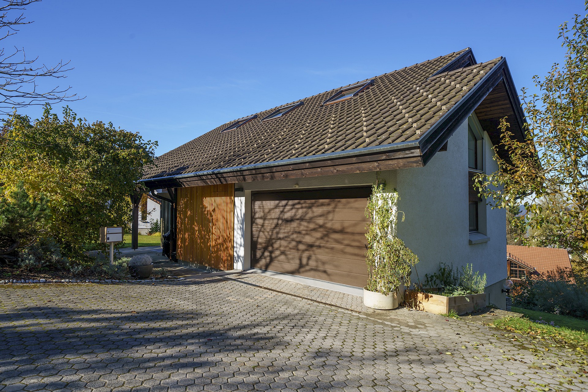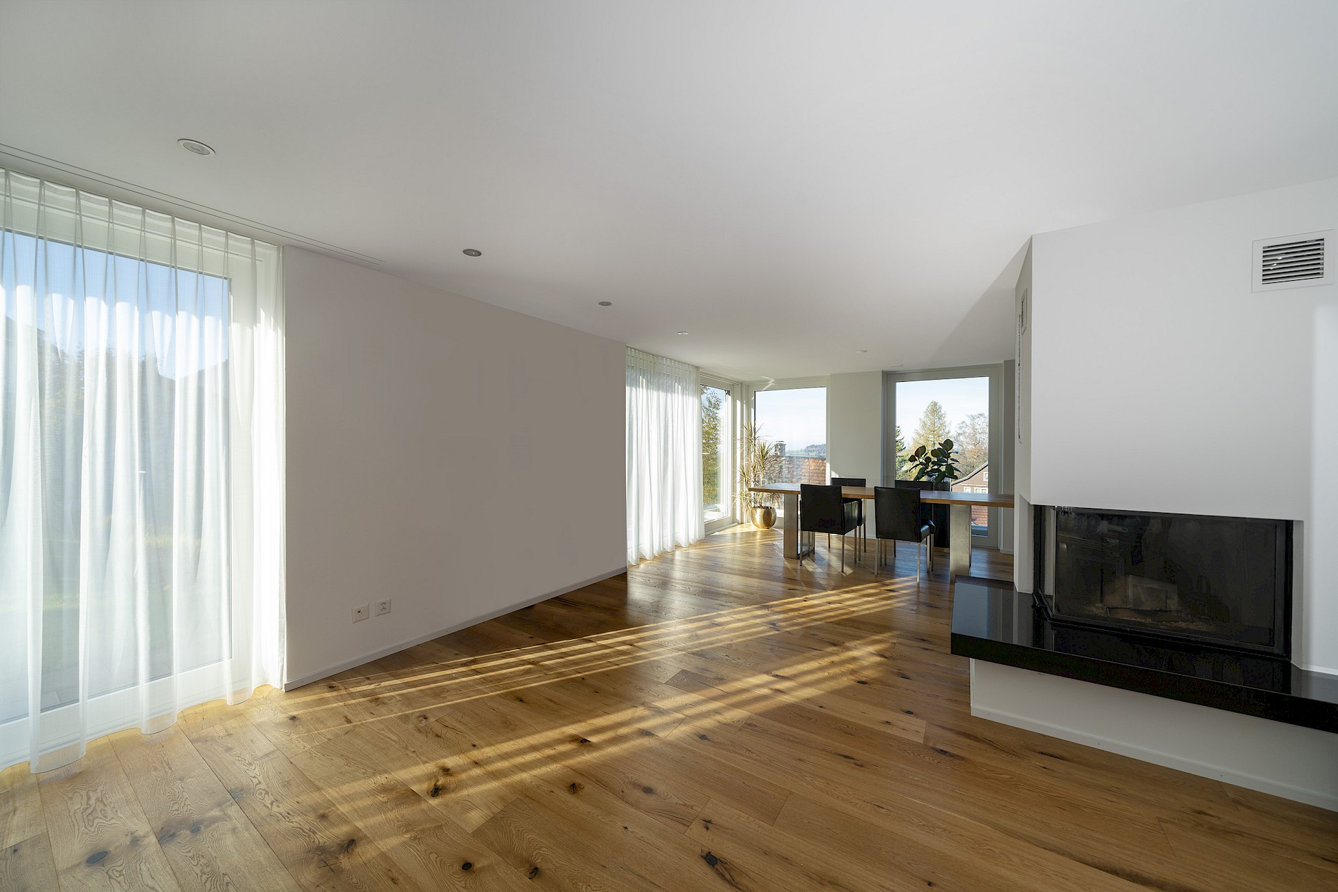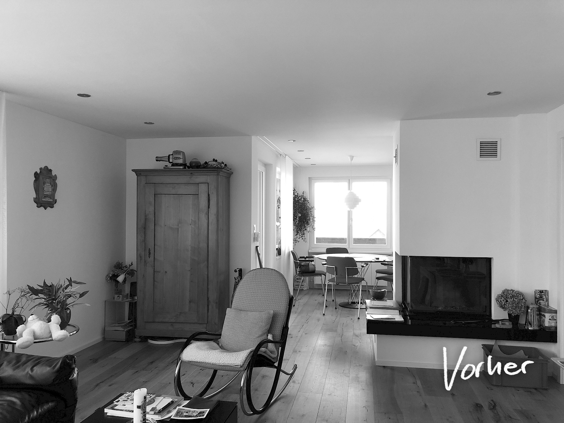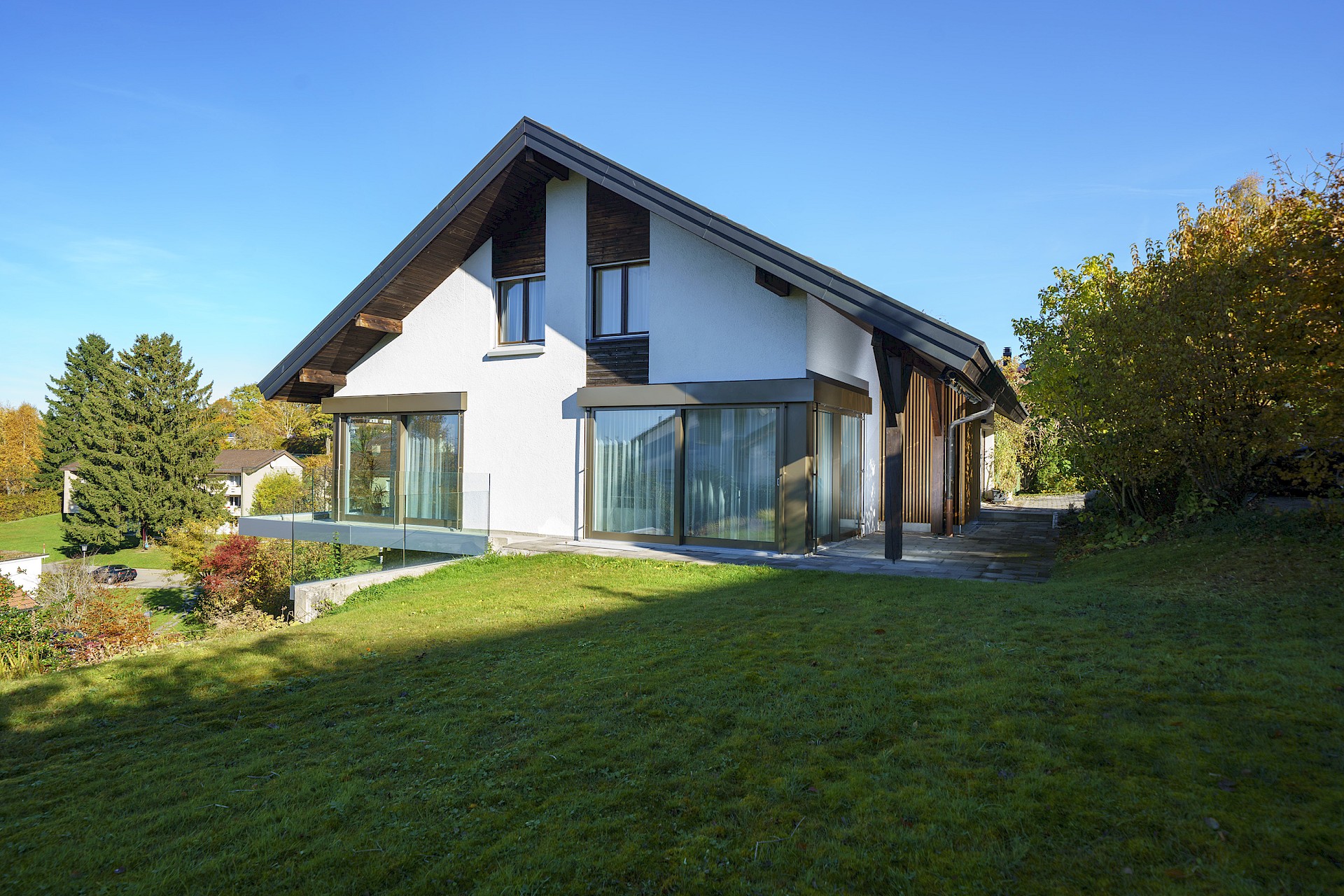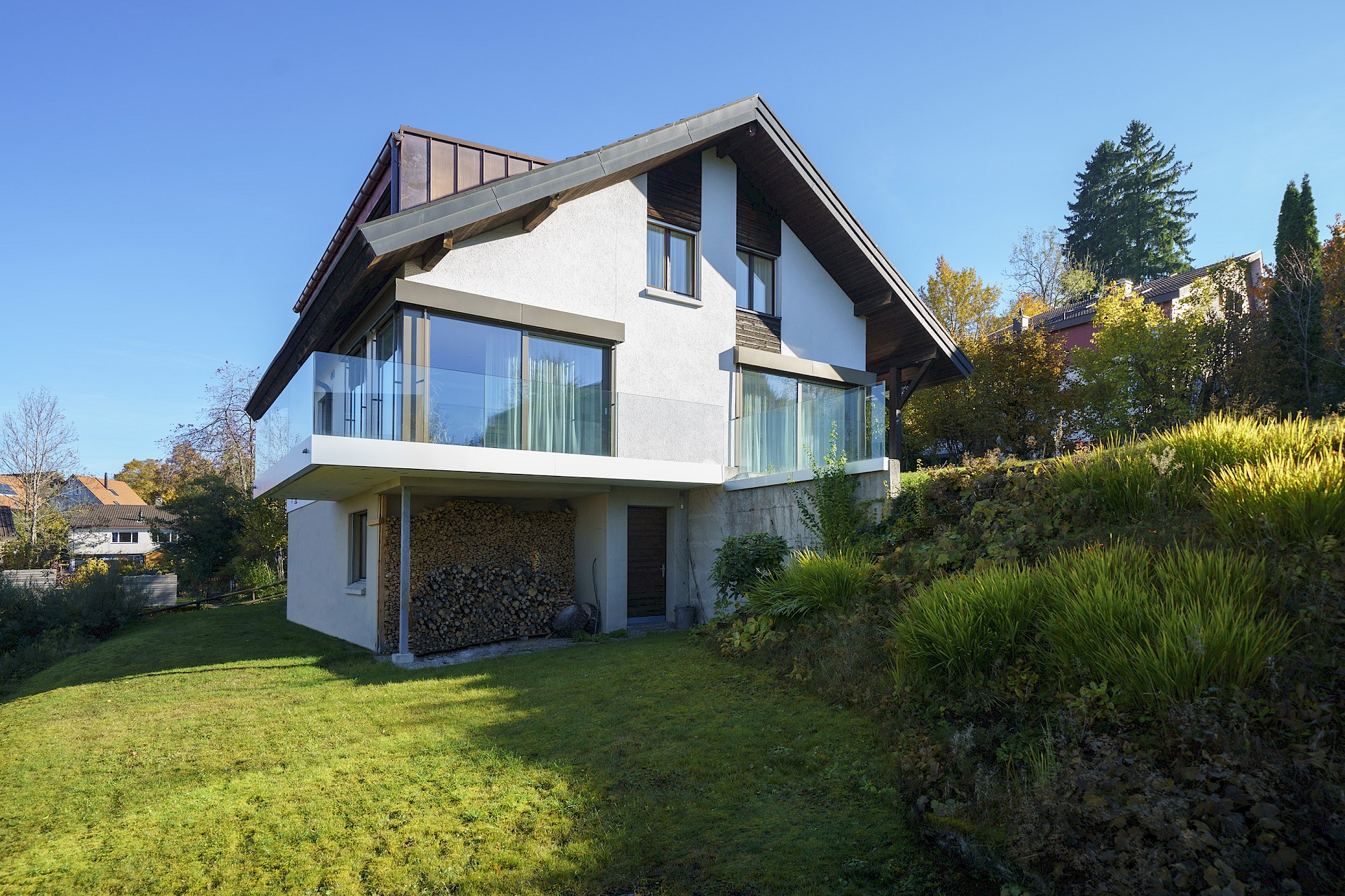 Durch einen Generationenwechsel änderten sich die Bedürfnisse an dieses in den achtziger Jahren erbaute Einfamilienhaus. Der Eingangsbereich wurde vergrössert und mit einer zeitgemässen Holzschalung versehen, hinter dieser sich fast unscheinbar ein Fenster und eine Türe versteckt. Auch sonst hat sich durch den Umbau an der Fassade einiges geändert: Eine Dachgaube vergrössert das Dachgeschoss mit Zimmer und Bad, zwei Dachflächenfenster erhellen zwei Schlafzimmer, ein Raumeck im Esszimmer wurde entfernt und – wie auch im Wohnzimmer – die bestehenden Fenster mit raumhohen Hebeschiebefenster ersetzt. Auch das hölzerne Balkongeländer musste einem schlichten Glasgeländer weichen. Neben den Wand- Decken und Bodenbeläge wurde auch das Bad im Dachgeschoss von Grund auf neu gestaltet. Die alten asbesthaltigen Elektrospeicherkästen wurden im ganzen Haus ausgebaut und durch eine neue Bodenheizung mit einer Erdsonde-Wärmepumpe ersetzt. Der energetischen Sanierung wurde grundsätzlich grosse Bedeutung geschenkt: Das ganze Dach und verschiedene Wandelemente wurden neu gedämmt und Türen zu Kalträumen mit besseren Dämmeigenschaften verbaut. Dadurch konnten Fördergelder vom Gebäudeprogramm beansprucht werden. Die verschiedenen Eingriffe sorgen nun für eine wohnliche Grosszügigkeit in der sich die ganze Familie wie gewünscht entfalten kann.