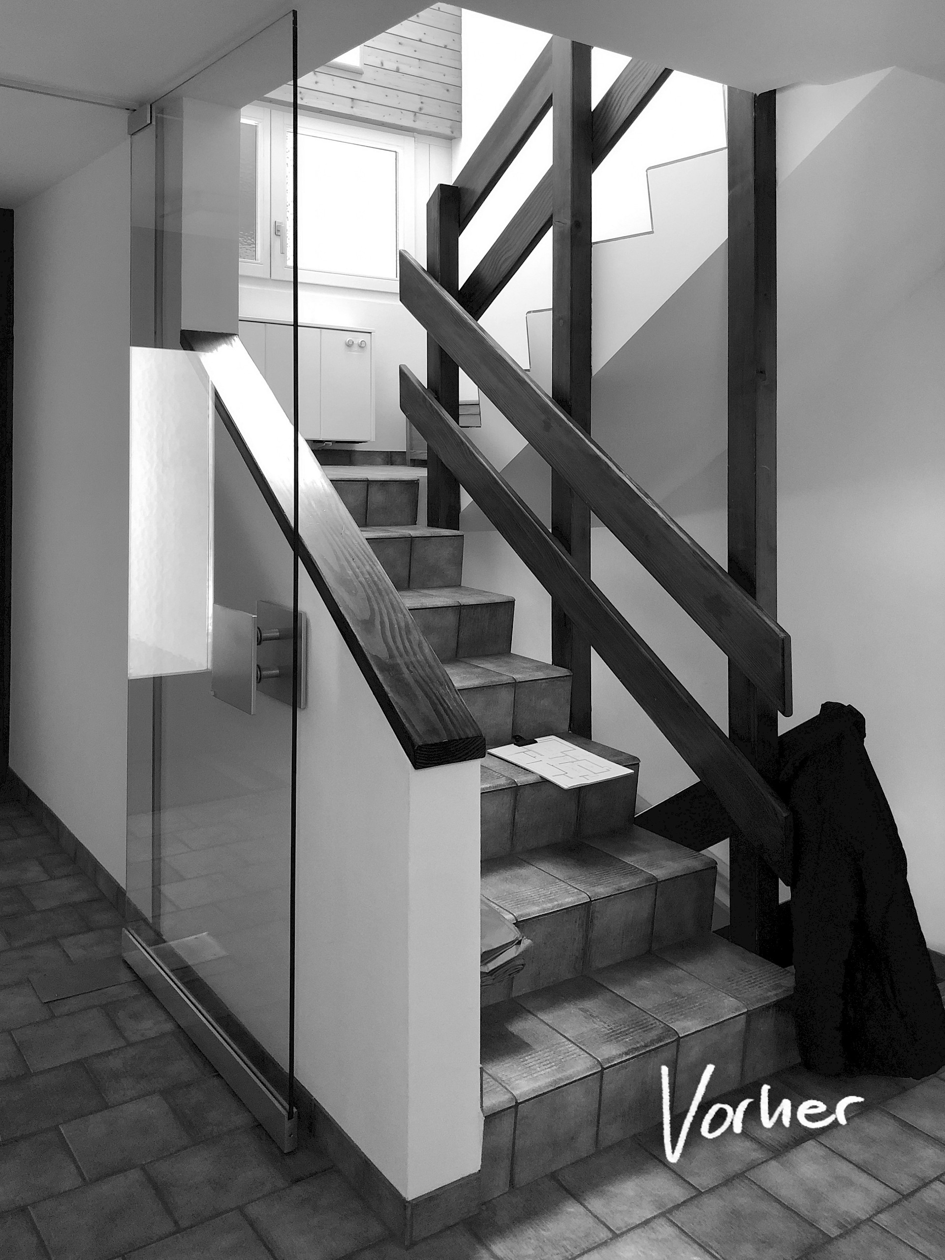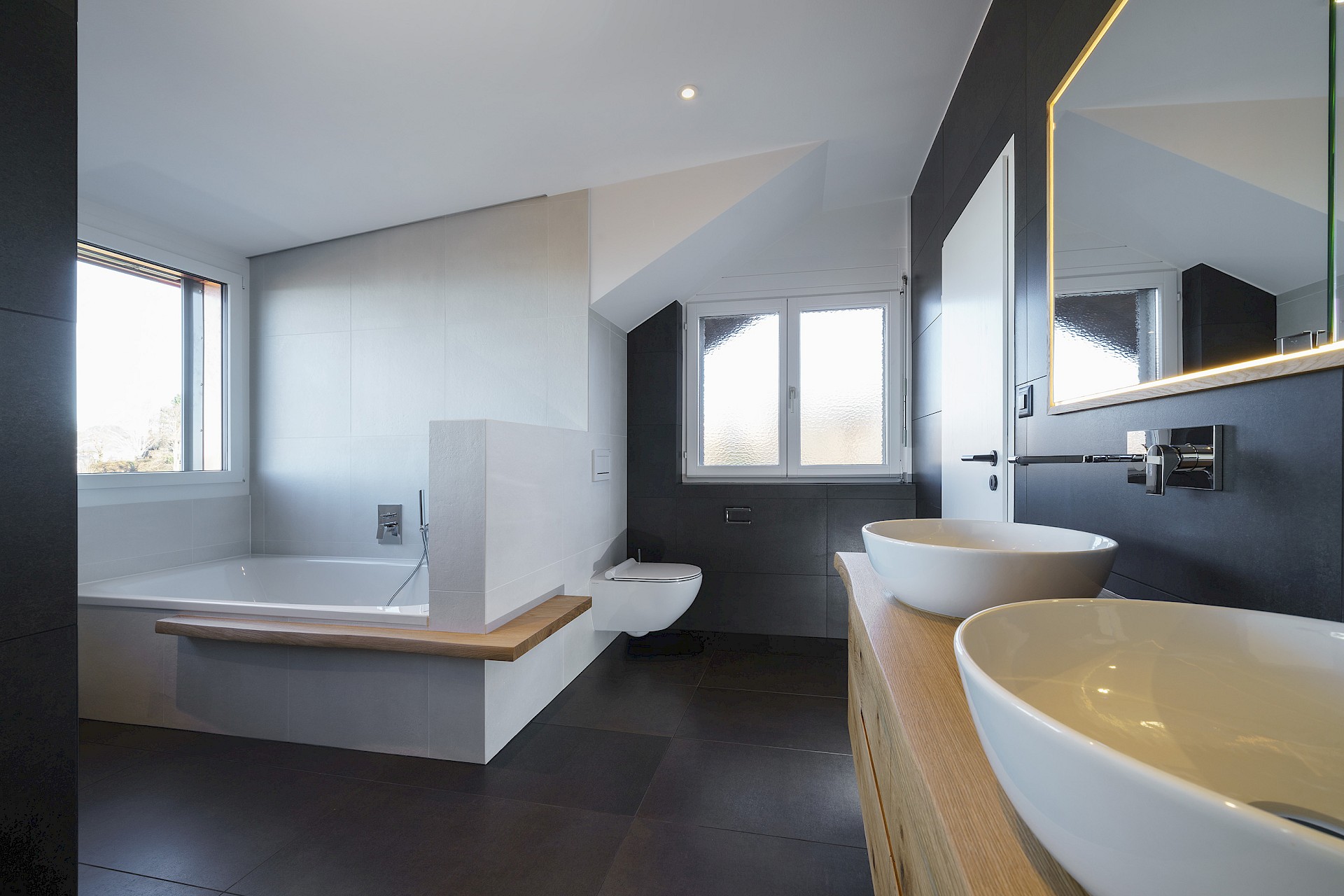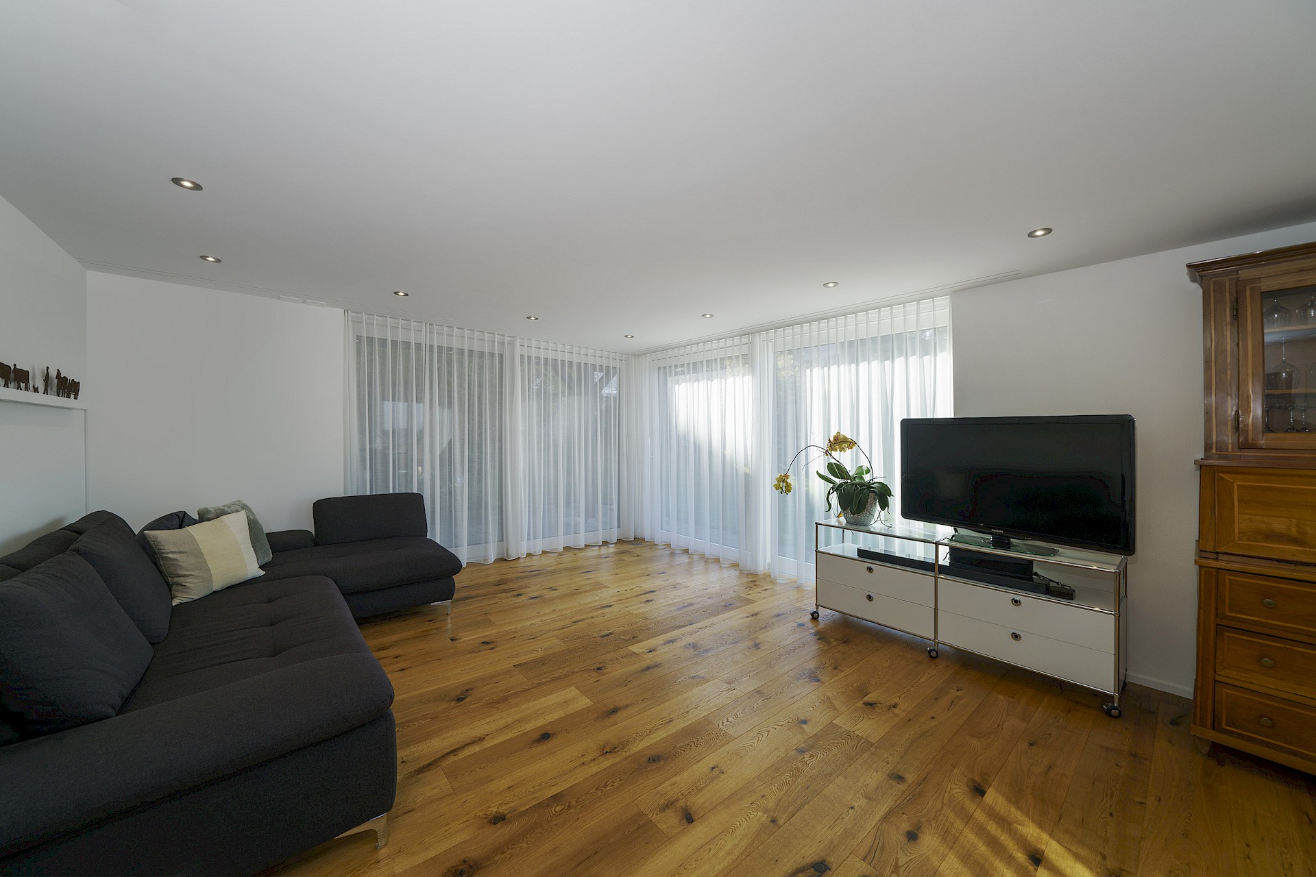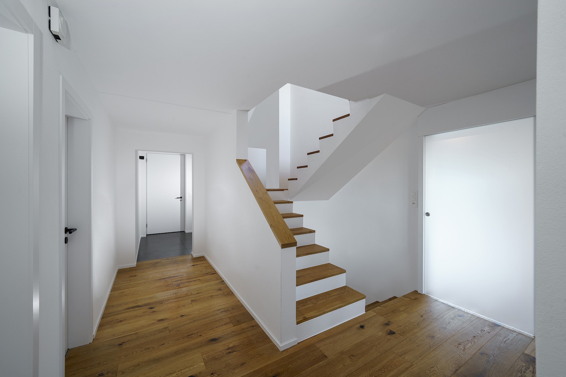 Durch einen Generationenwechsel änderten sich die Bedürfnisse an dieses in den achtziger Jahren erbaute Einfamilienhaus. Der Eingangsbereich wurde vergrössert und mit einer zeitgemässen Holzschalung versehen, hinter dieser sich fast unscheinbar ein Fenster und eine Türe versteckt. Auch sonst hat sich durch den Umbau an der Fassade einiges geändert: Eine Dachgaube vergrössert das Dachgeschoss mit Zimmer und Bad, zwei Dachflächenfenster erhellen zwei Schlafzimmer, ein Raumeck im Esszimmer wurde entfernt und – wie auch im Wohnzimmer – die bestehenden Fenster mit raumhohen Hebeschiebefenster ersetzt. Auch das hölzerne Balkongeländer musste einem schlichten Glasgeländer weichen. Neben den Wand- Decken und Bodenbeläge wurde auch das Bad im Dachgeschoss von Grund auf neu gestaltet. Die alten asbesthaltigen Elektrospeicherkästen wurden im ganzen Haus ausgebaut und durch eine neue Bodenheizung mit einer Erdsonde-Wärmepumpe ersetzt. Der energetischen Sanierung wurde grundsätzlich grosse Bedeutung geschenkt: Das ganze Dach und verschiedene Wandelemente wurden neu gedämmt und Türen zu Kalträumen mit besseren Dämmeigenschaften verbaut. Dadurch konnten Fördergelder vom Gebäudeprogramm beansprucht werden. Die verschiedenen Eingriffe sorgen nun für eine wohnliche Grosszügigkeit in der sich die ganze Familie wie gewünscht entfalten kann.