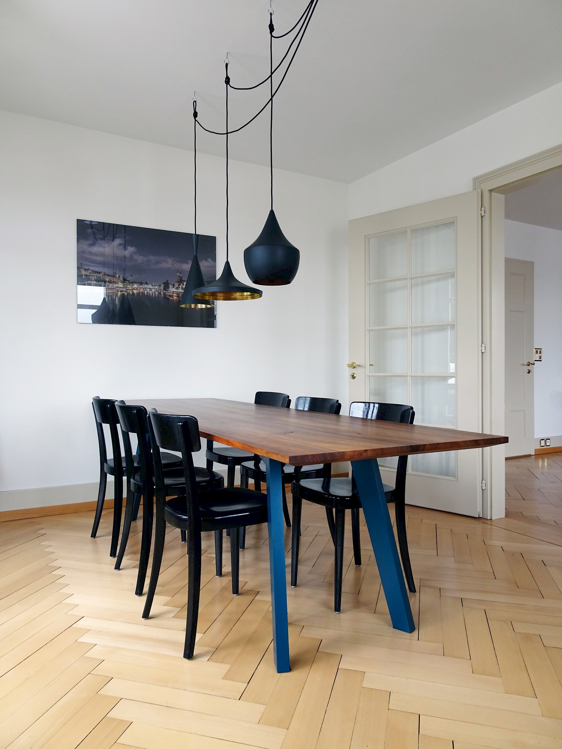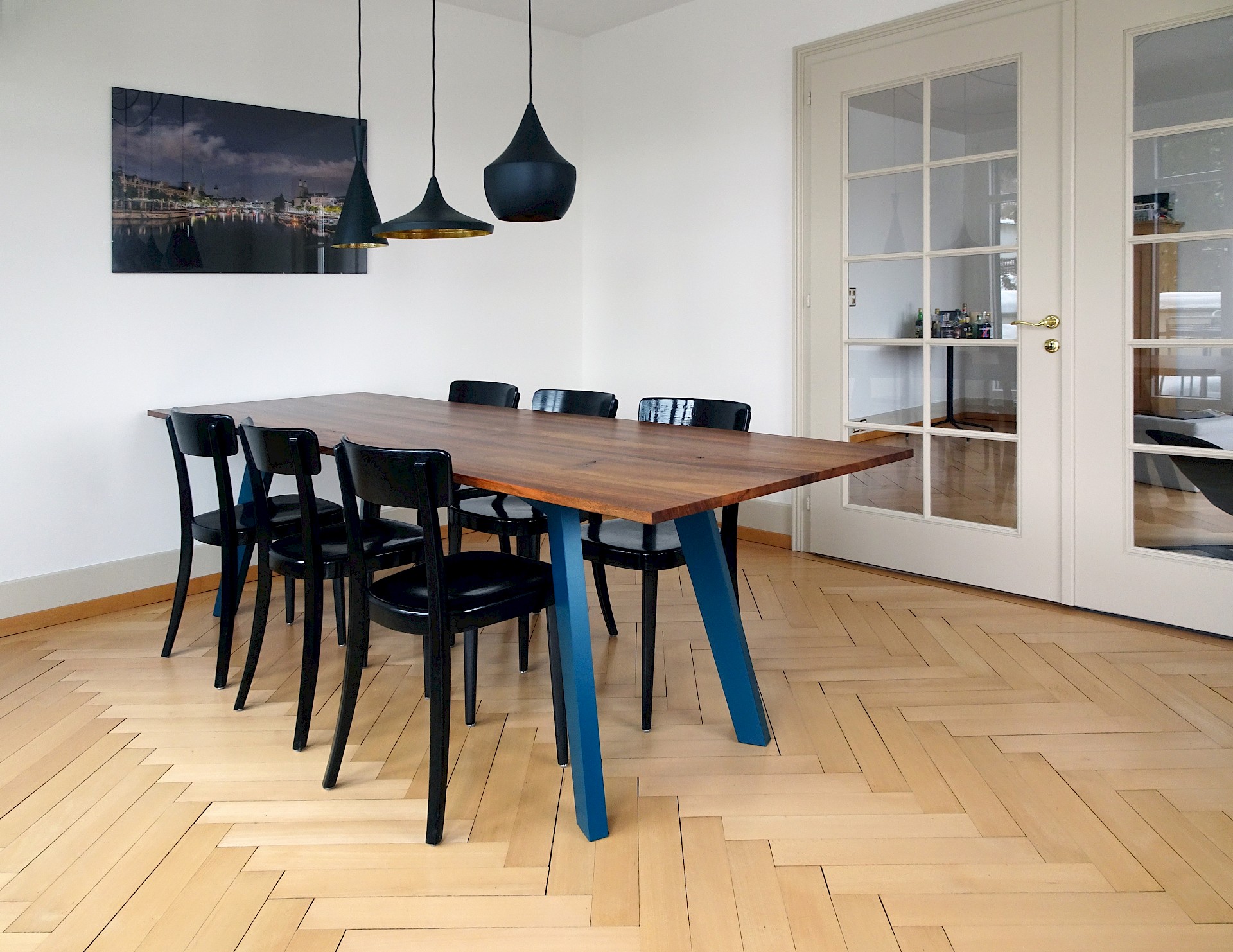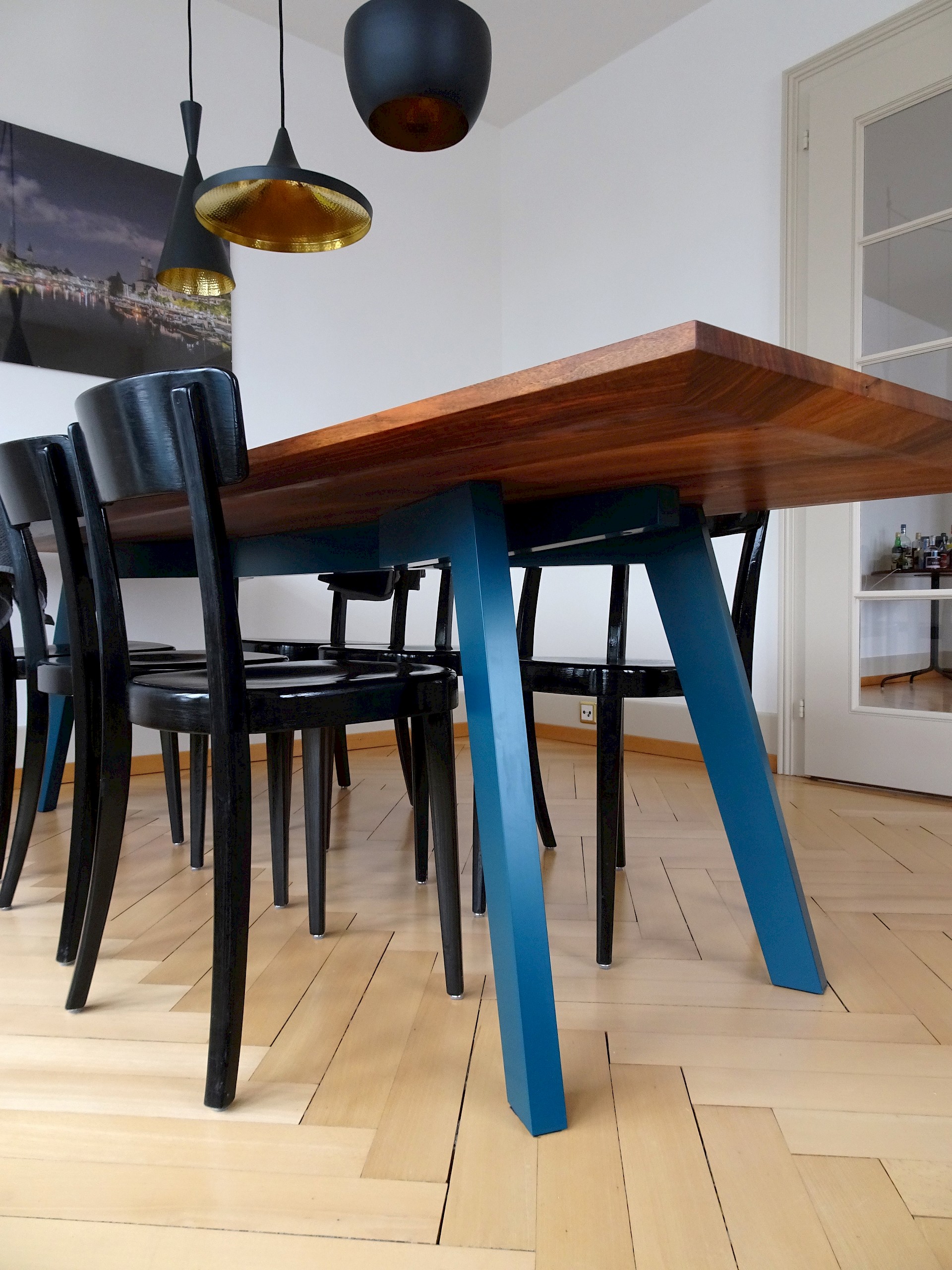 Durch das lebendige Nussbaum-Holz und die konischen Füsse sorgt dieser Tisch für einen spannenden Kontrast in dieser Altbauwohnung. Der Tisch fügt sich harmonisch in das historische Ambiente ein und setzt gleichzeitig moderne Akzente.