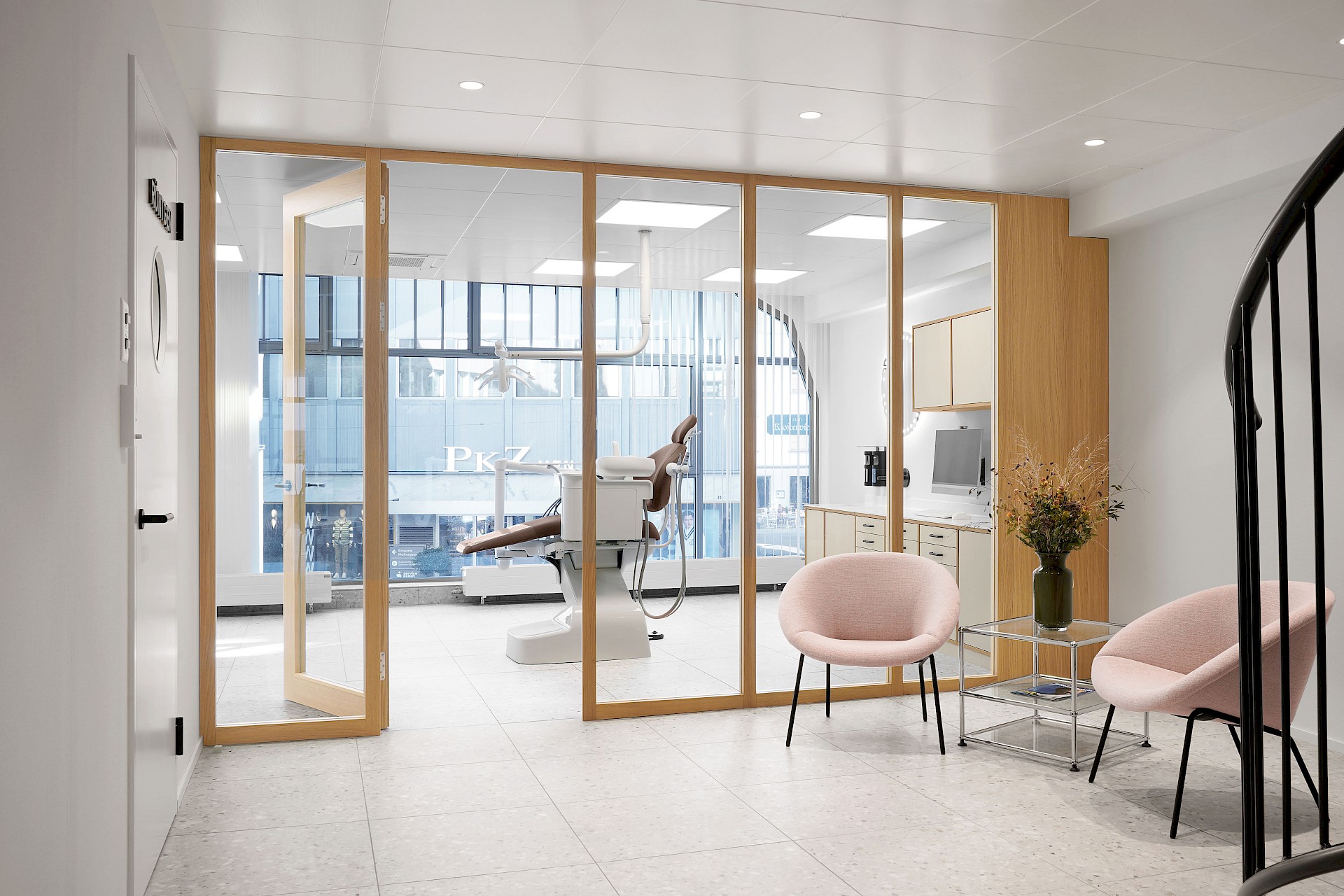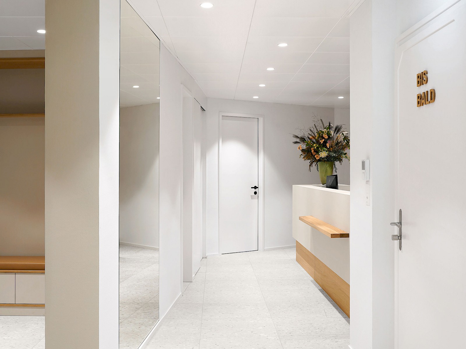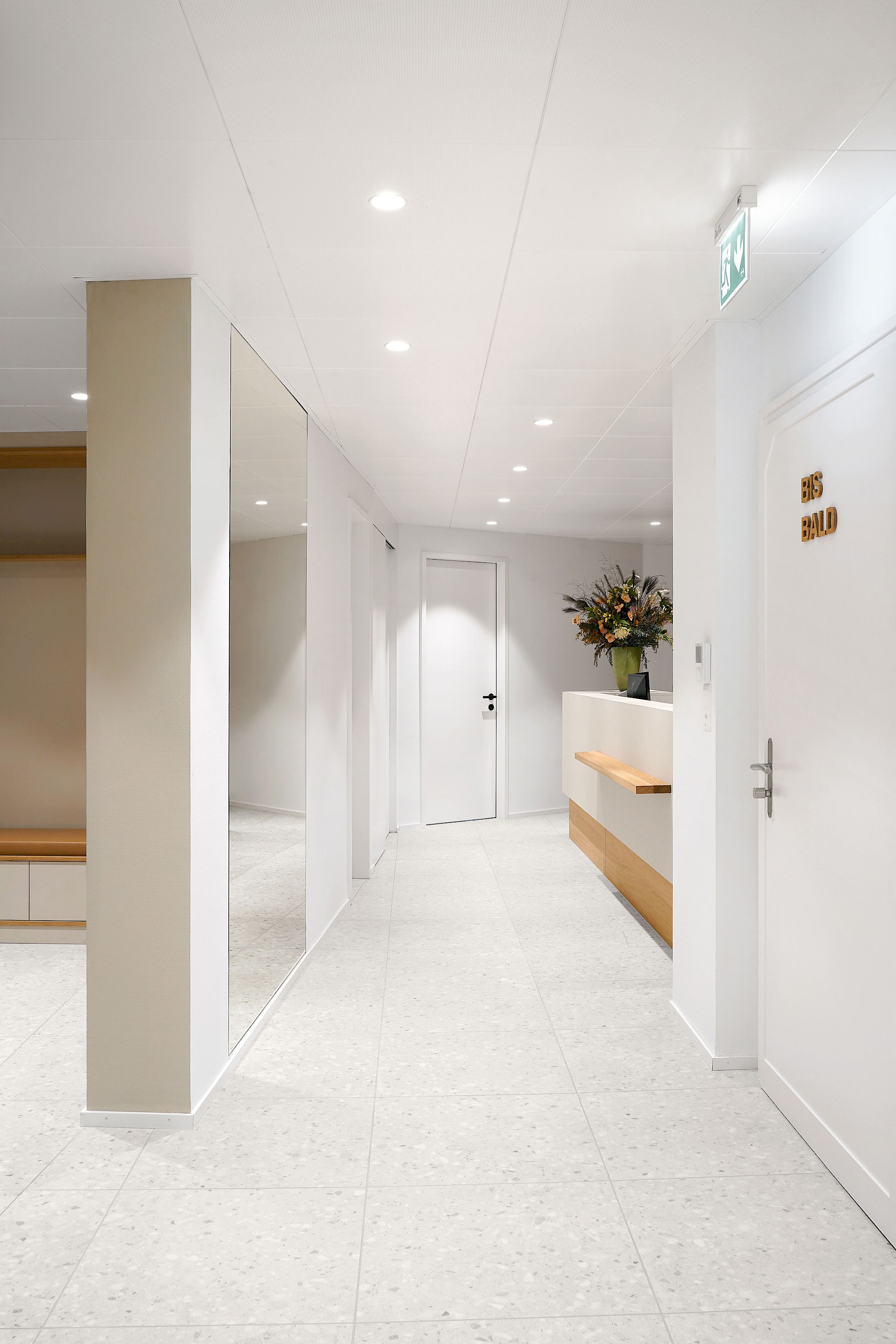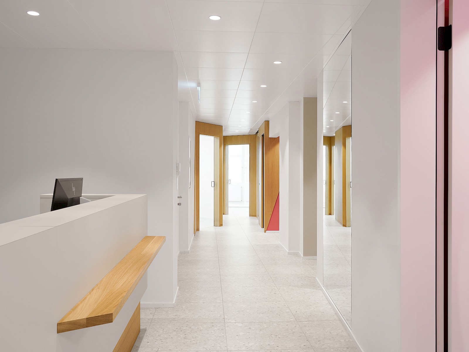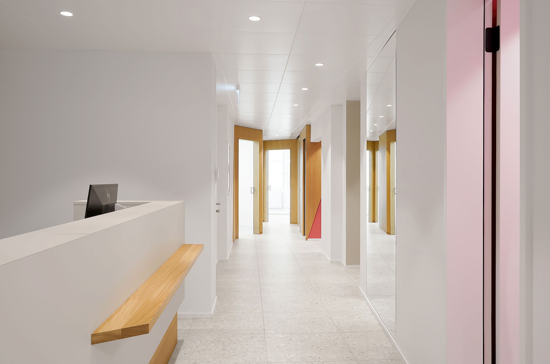 Schräge Linien, Elemente aus Holz sowie farbliche Akzente in der Mitarbeiterküche, der Gästetoilette und der vertikalen Erschliessung begleiten die Besucher durch die Praxis und verleihen den Korridoren eine eigene Dynamik. Ein grosszügiger Spiegel im Eingangsbereich erweitert die schmalen Raumverhältnisse optisch und ermöglicht dem Empfang den direkten Blick zur Eingangstüre.