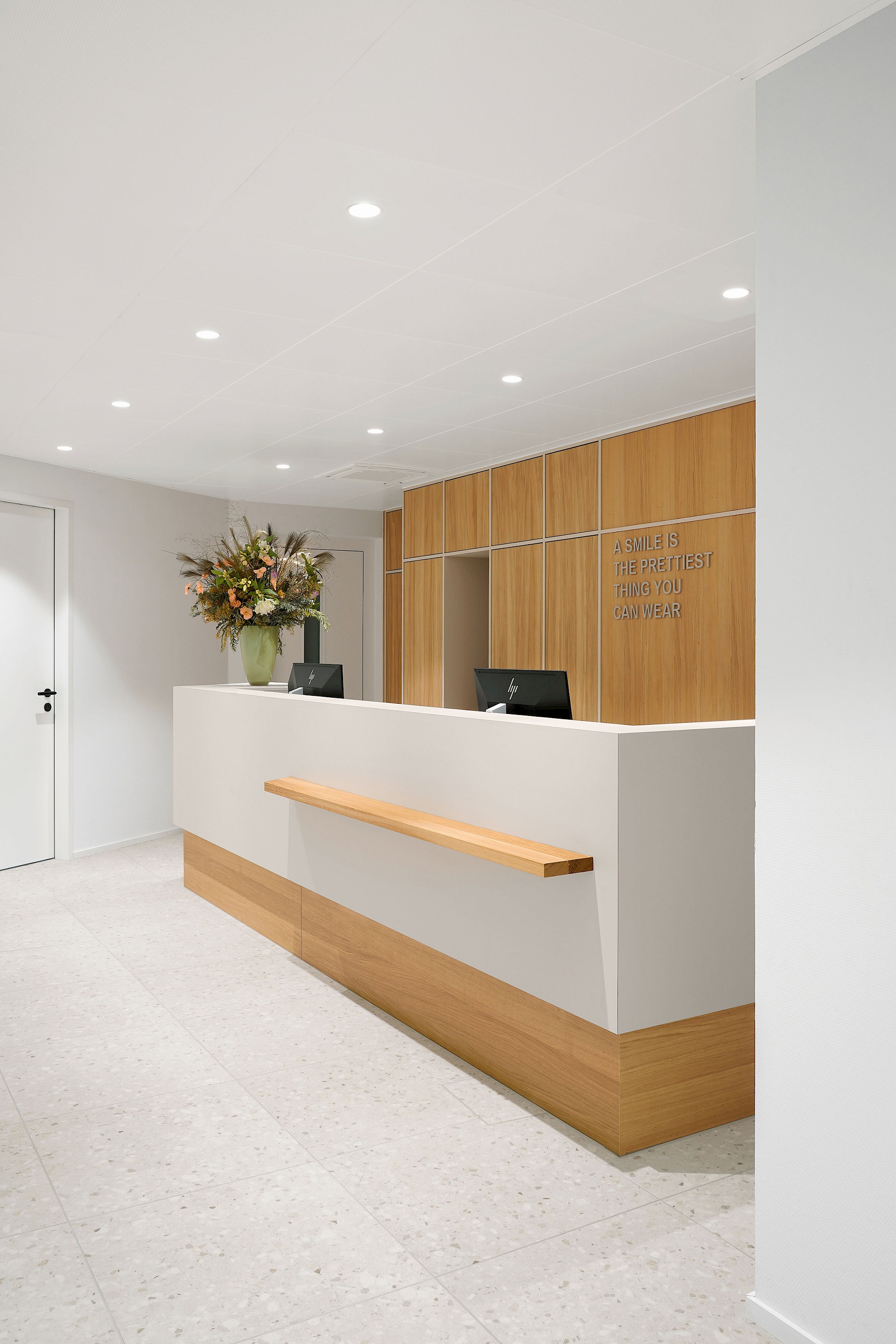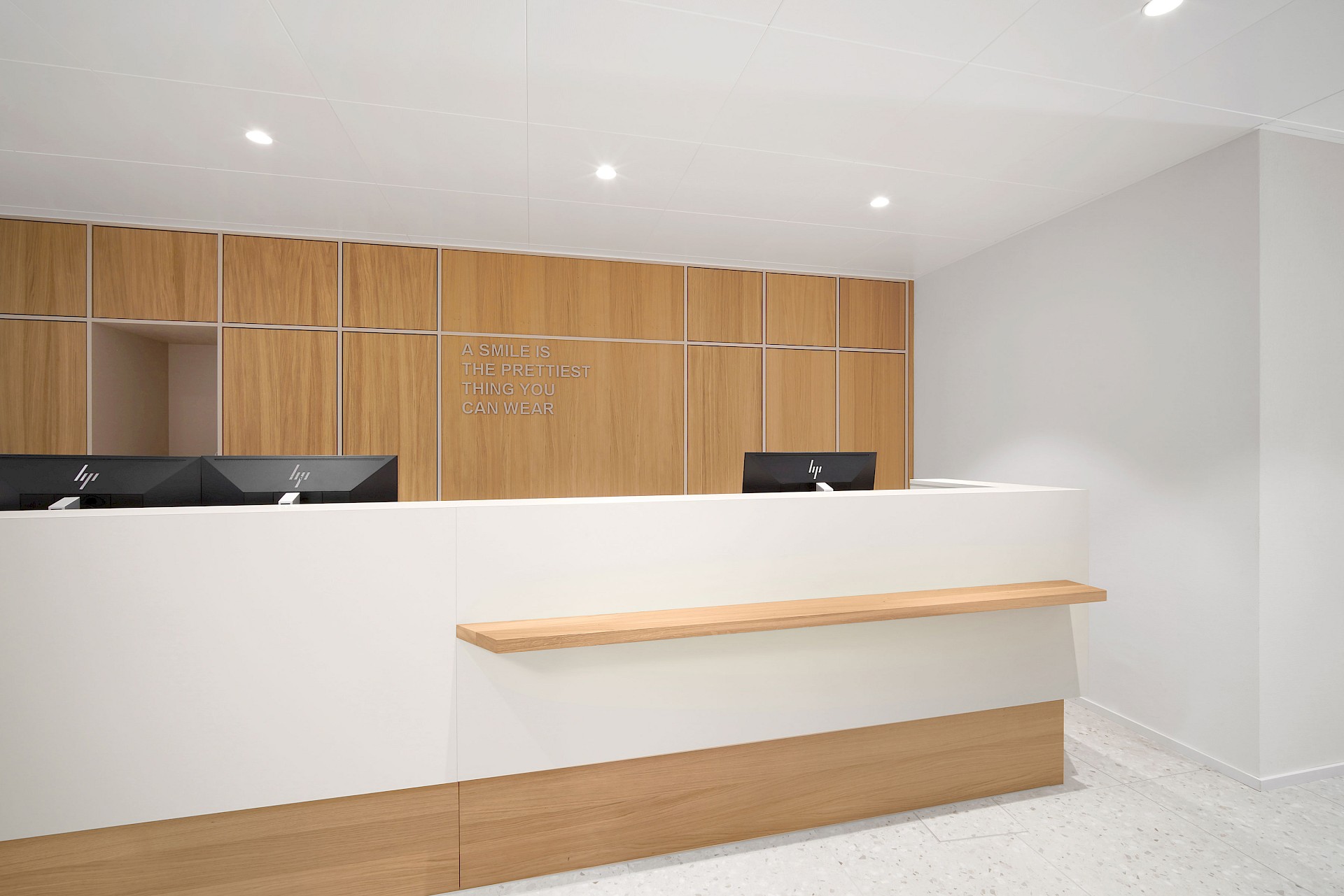 Das Empfangsmöbel ist klarlinig gestaltet und bildet einen ruhigen Ankerpunkt im Raum. Hinter dem Tresen wird man vom Personal mit einem Lächeln empfangen – unterstützt durch den Schriftzug «A smile is the prettiest thing you can wear», der als Holzlettern in die Rückwand integriert ist. Auch die weitere Signaletik wurde konsequent mit Holzbuchstaben umgesetzt.