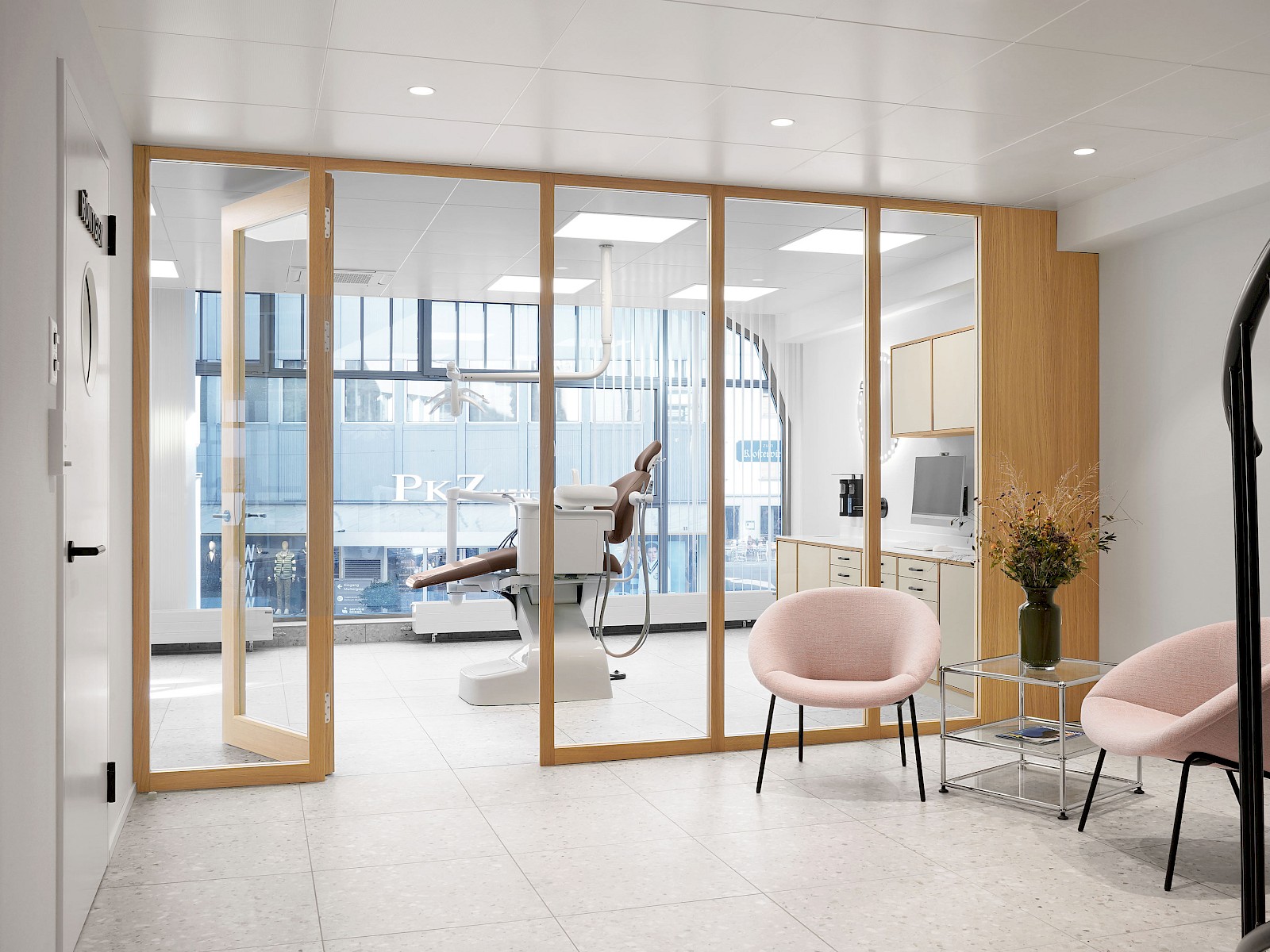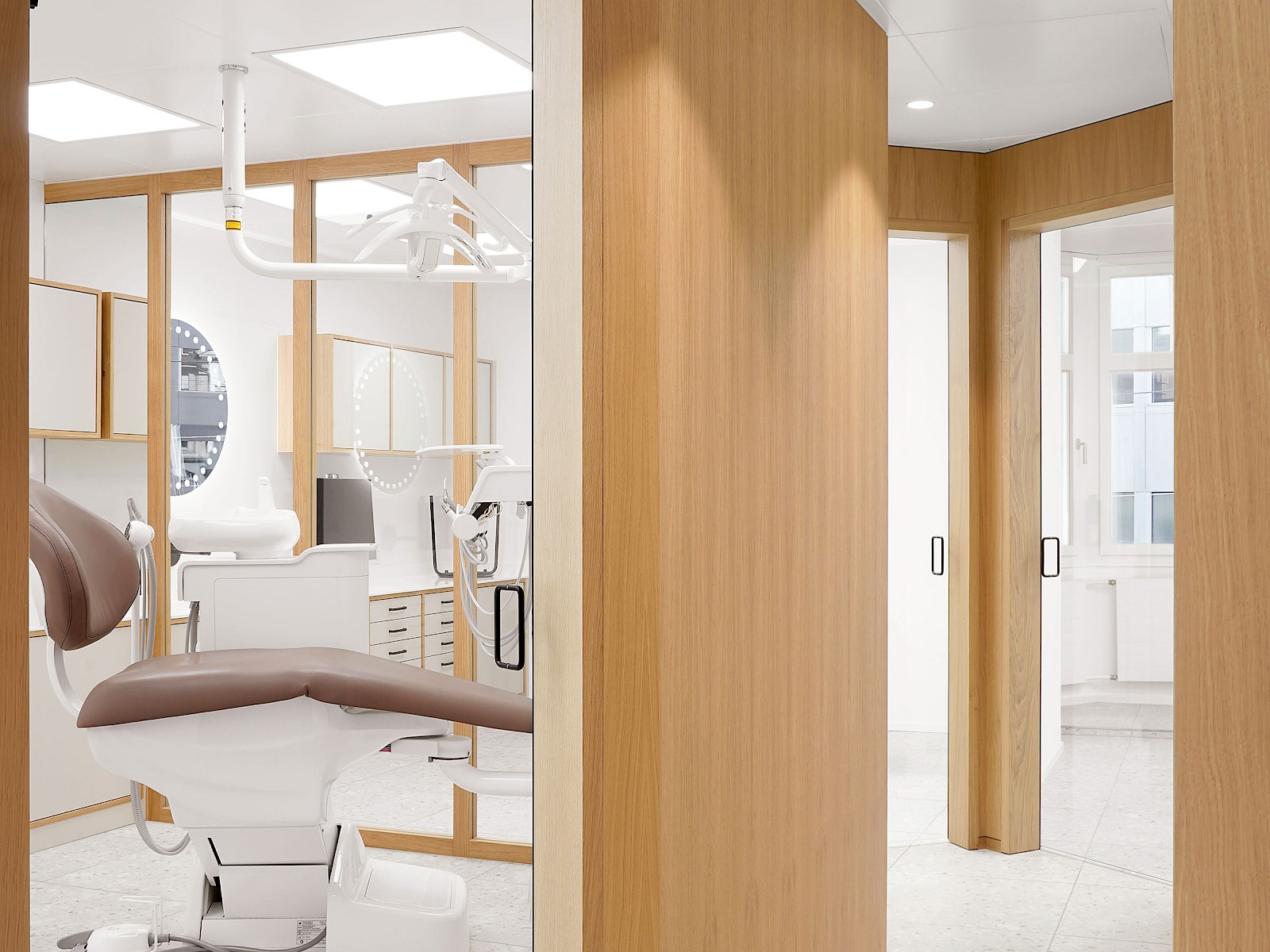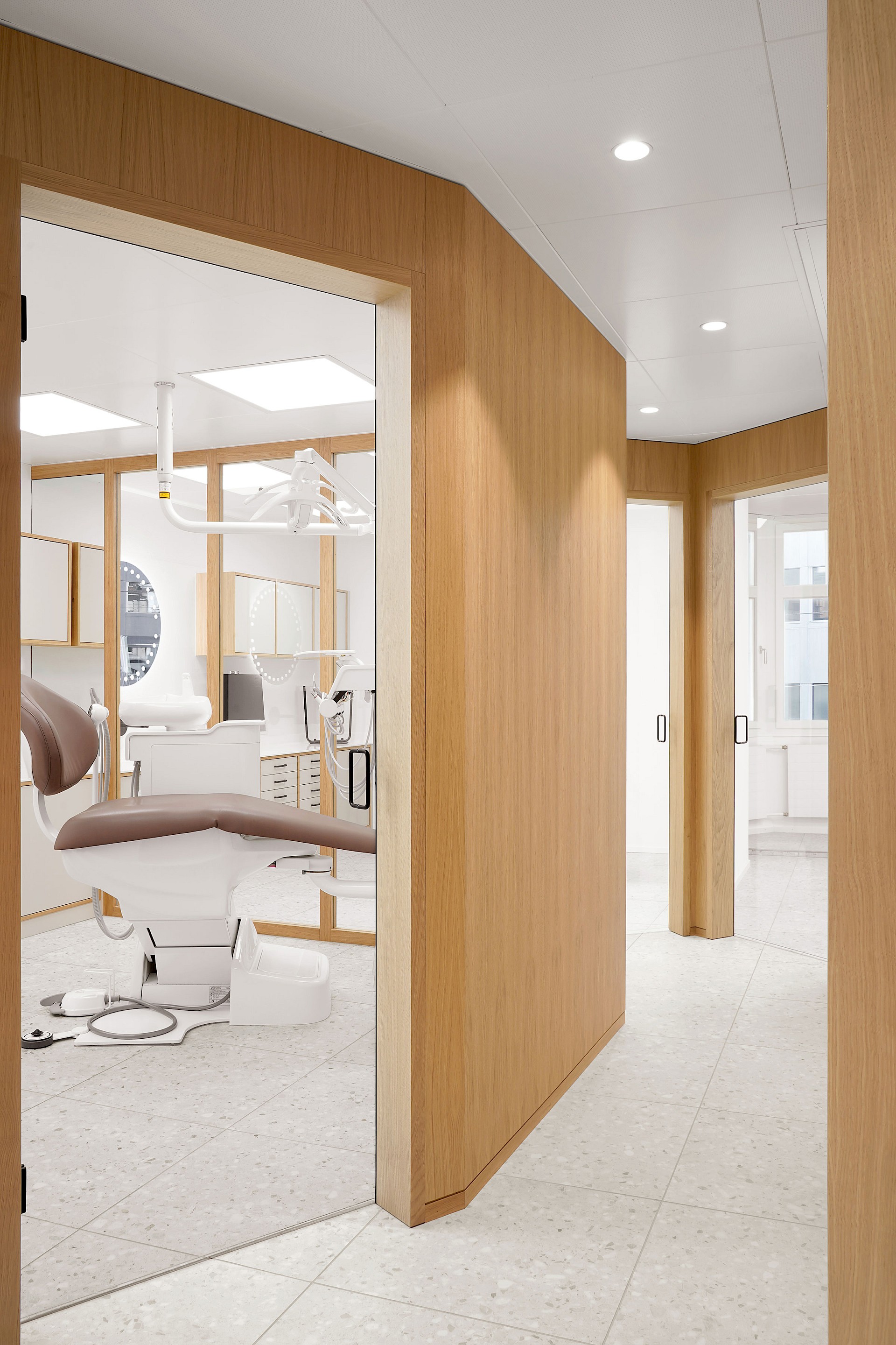 Insgesamt verkörpern die hellen und klar gestalteten Räume die zentralen Werte einer Praxis: Hygiene und Präzision. Die eingesetzten Holzelemente verleihen den Räumen zudem eine angenehme Wärme und schaffen eine vertraute Atmosphäre. So entstand eine Praxis, die modernes Arbeiten, Klarheit und ein warmes Raumgefühl harmonisch vereint.