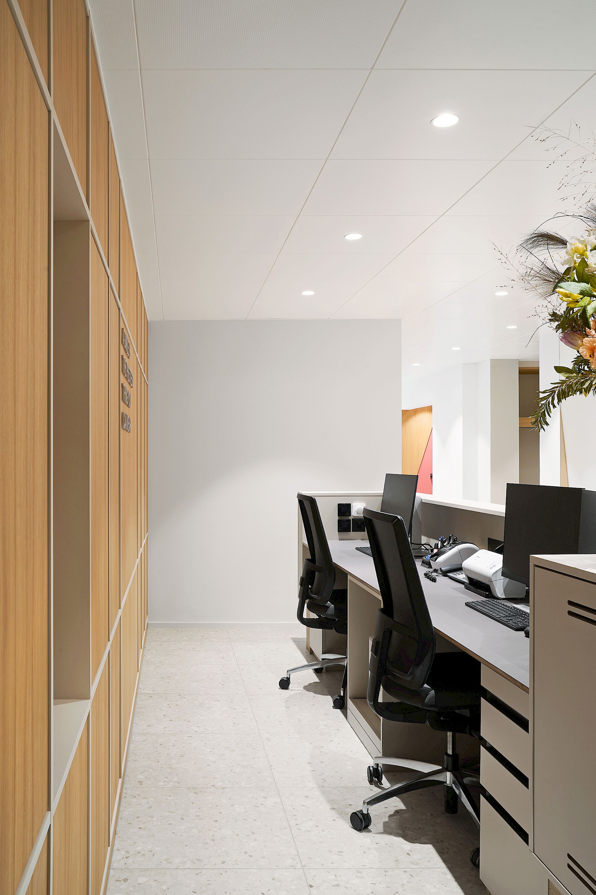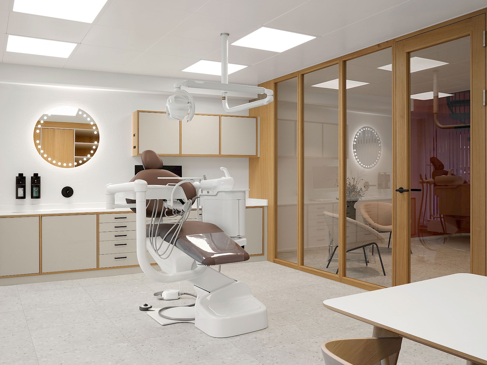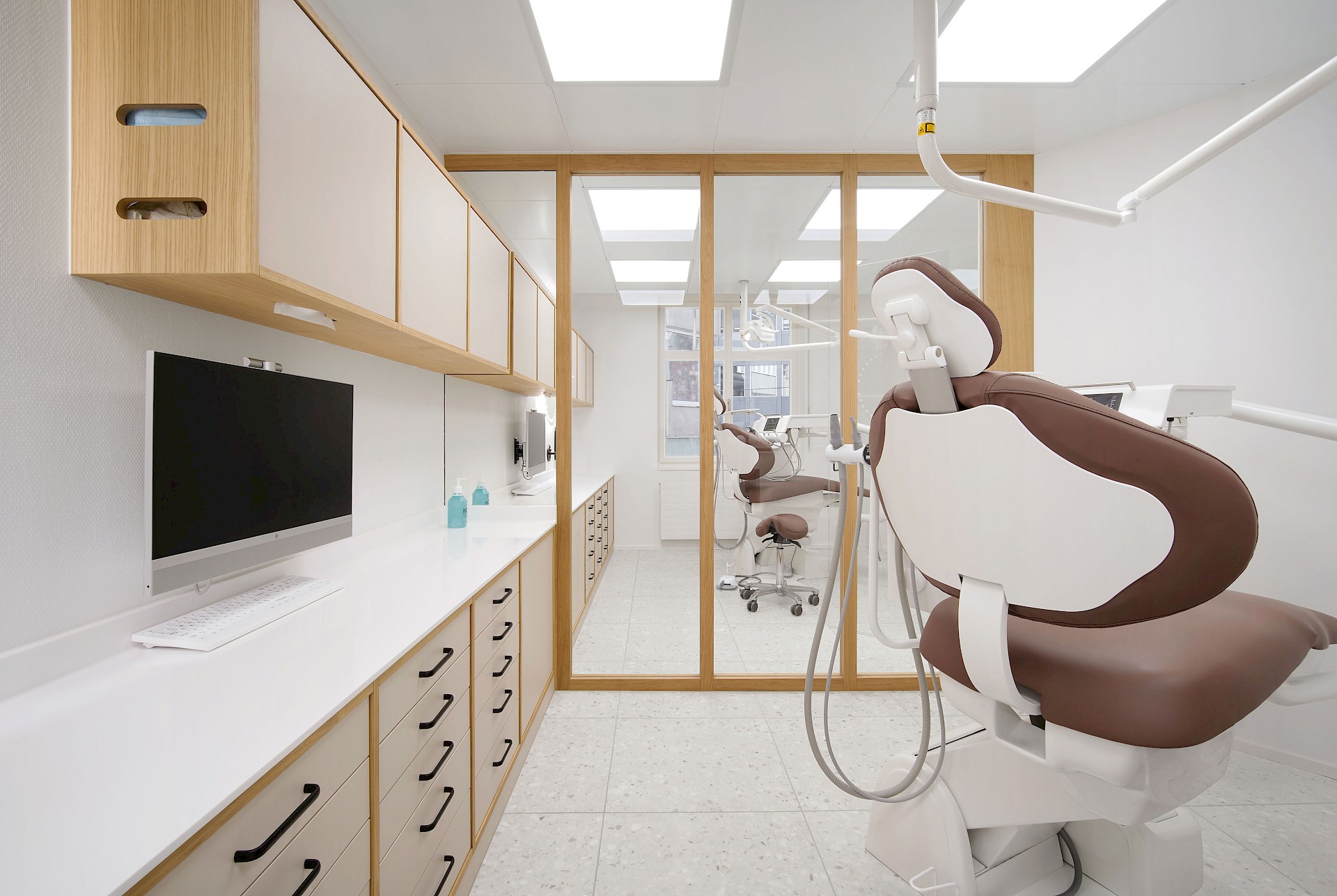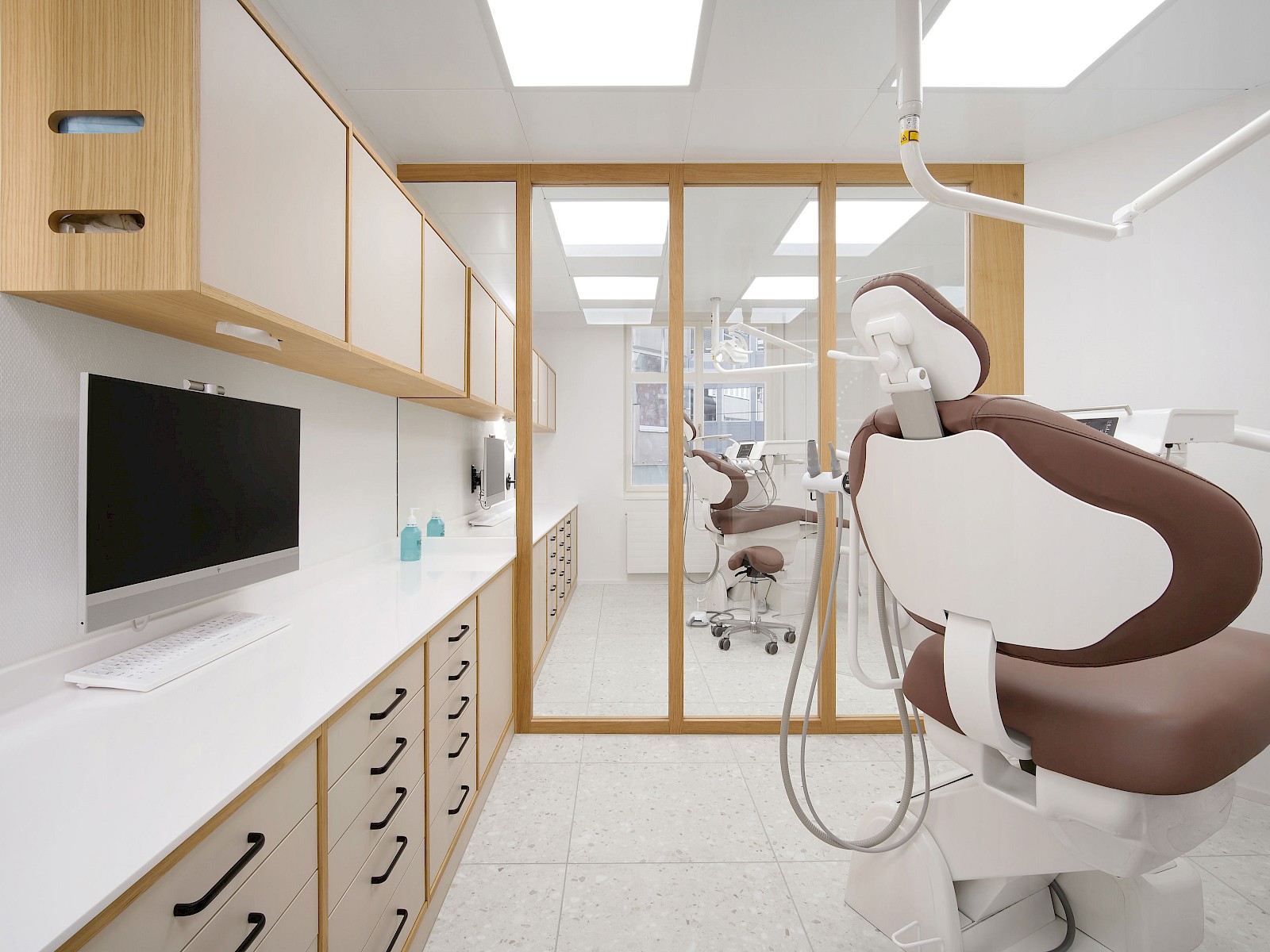 Insgesamt verkörpern die hellen und klar gestalteten Räume die zentralen Werte einer Praxis: Hygiene und Präzision. Die eingesetzten Holzelemente verleihen den Räumen zudem eine angenehme Wärme und schaffen eine vertraute Atmosphäre. So entstand eine Praxis, die modernes Arbeiten, Klarheit und ein warmes Raumgefühl harmonisch vereint.