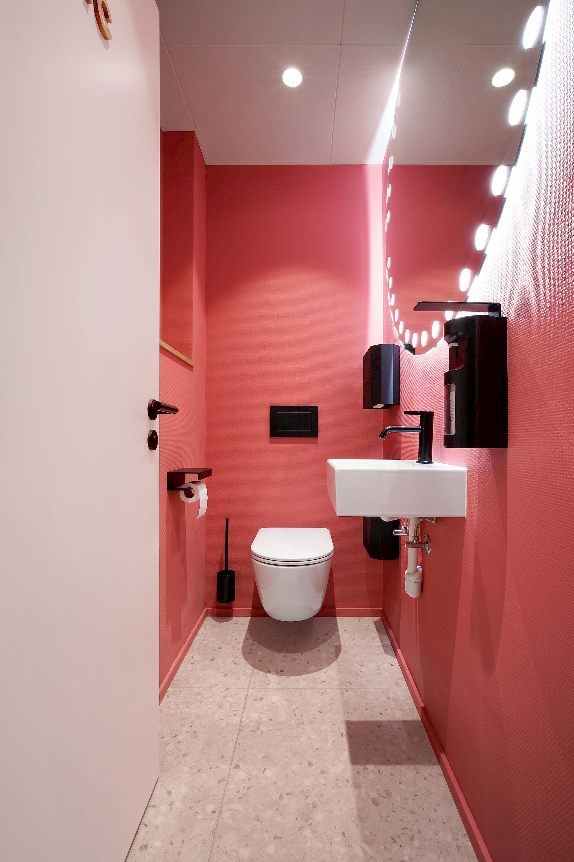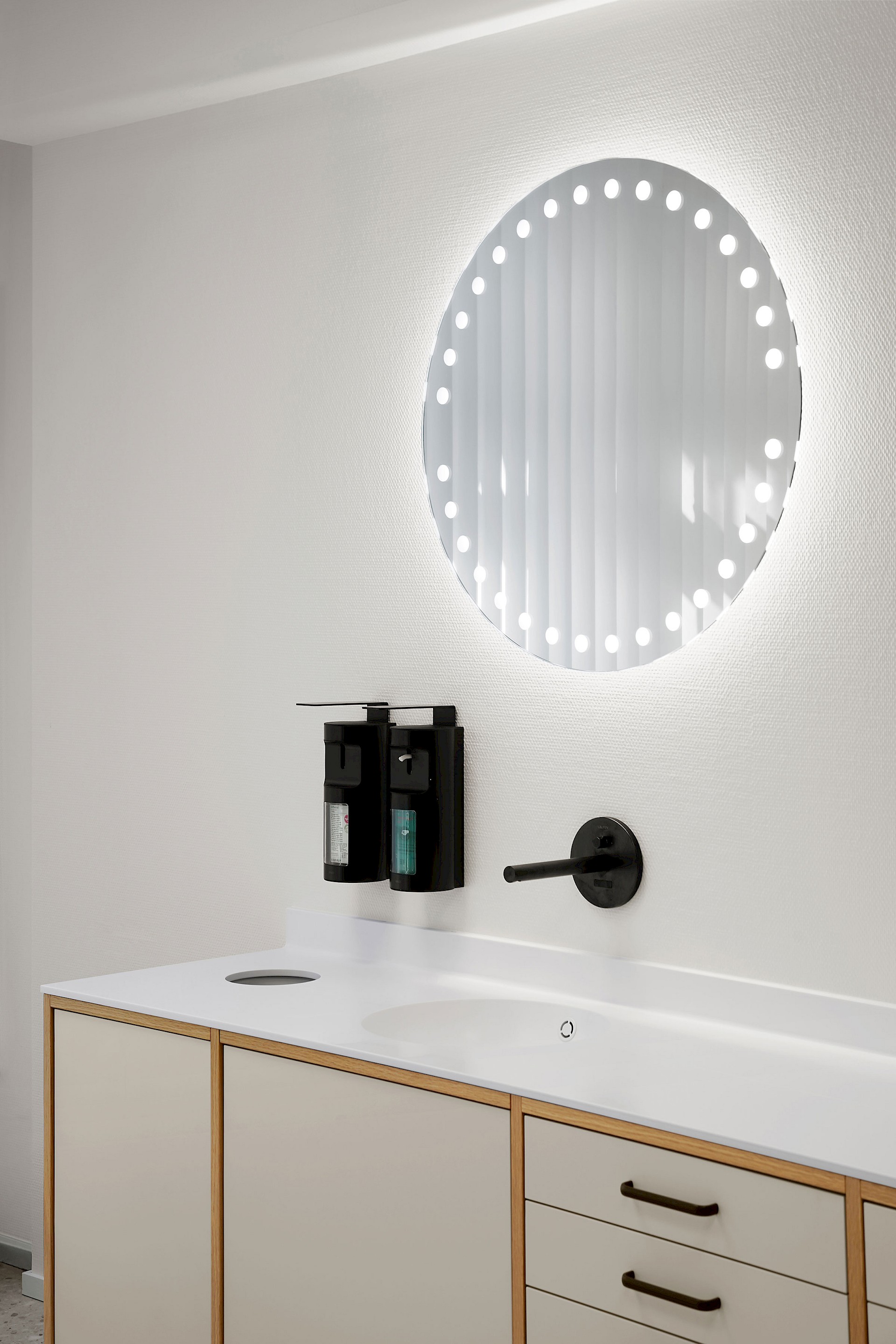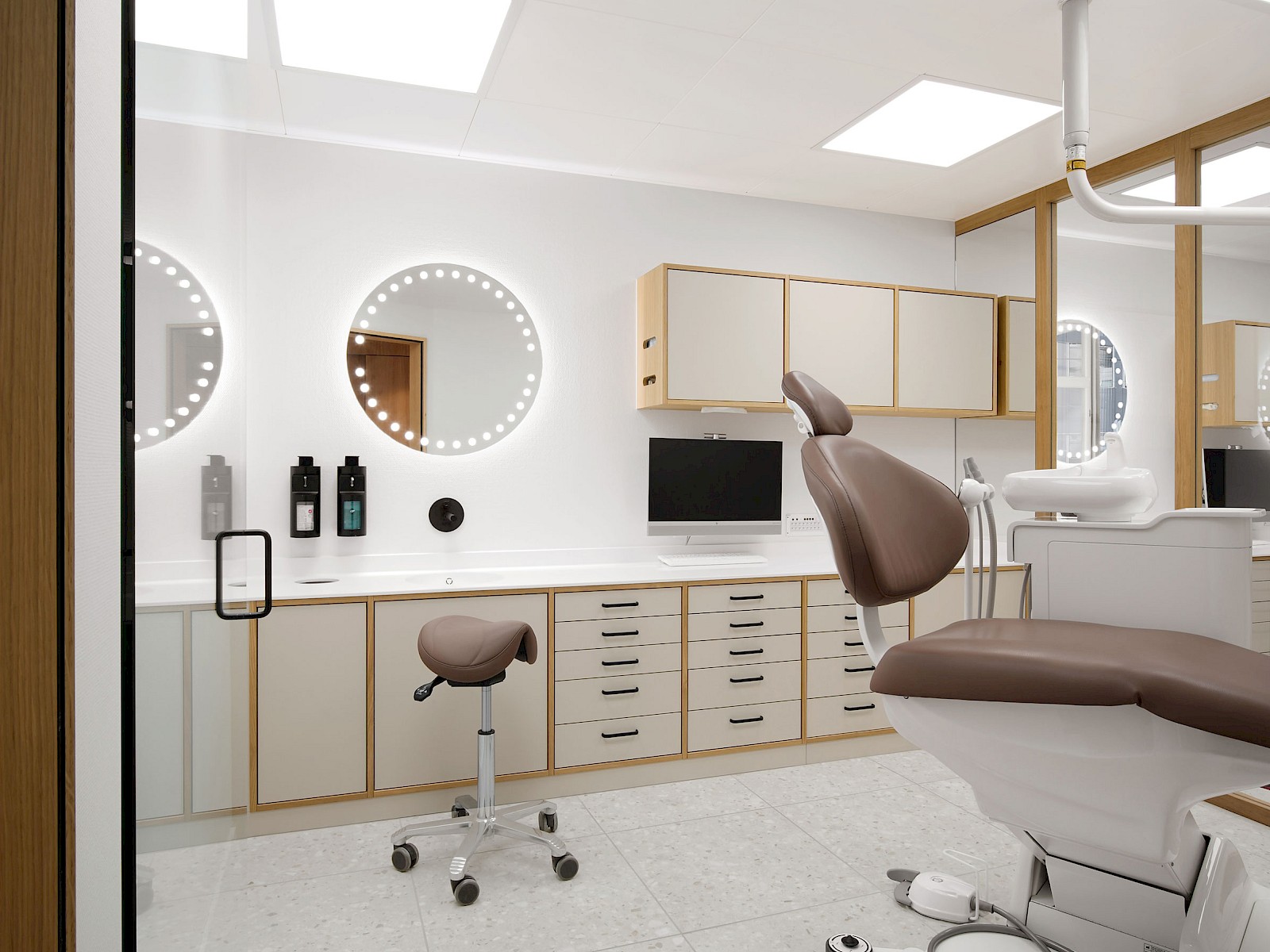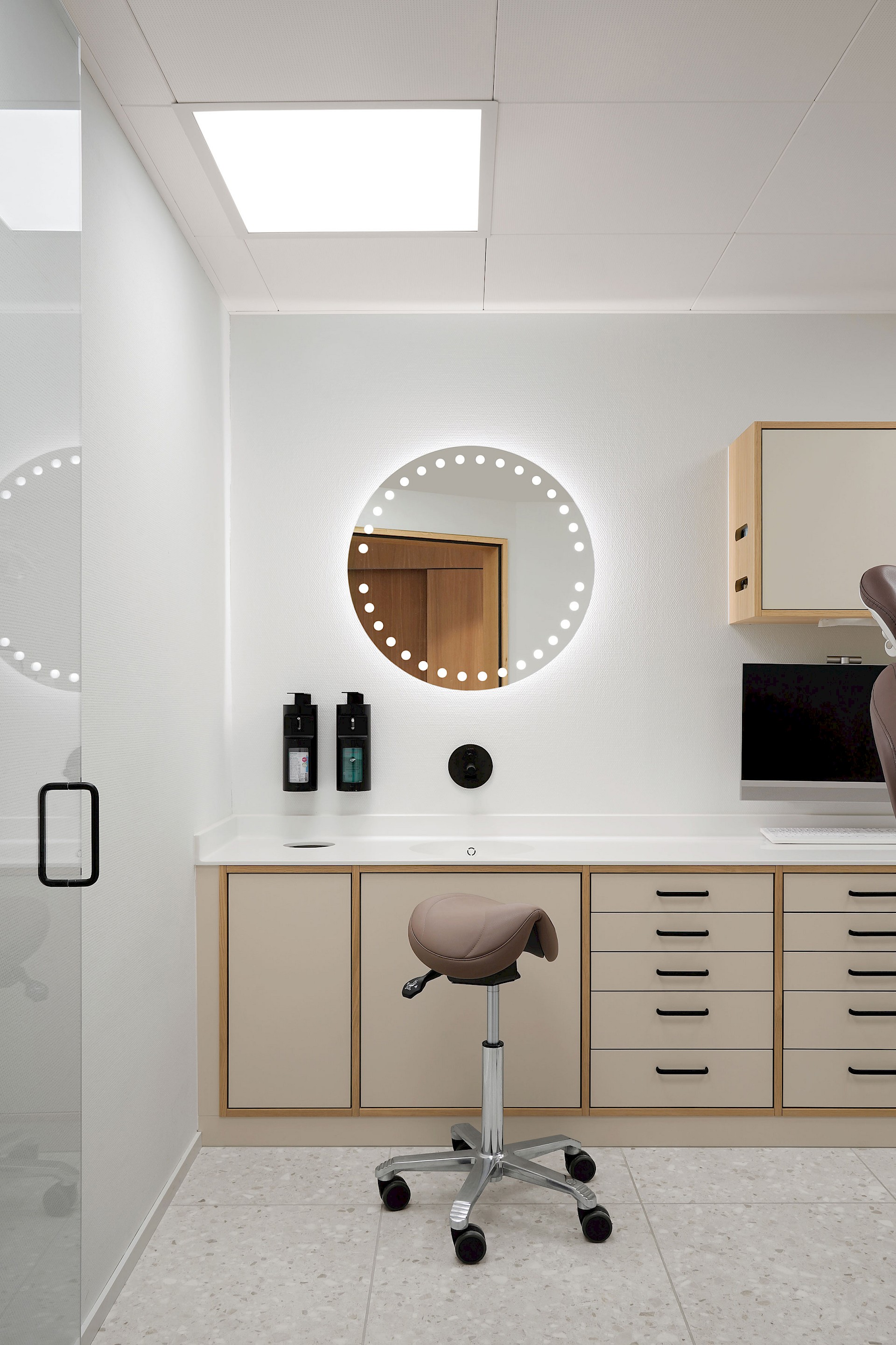 Ein besonderes Highlight sind die Spiegel in der Gästetoilette und in den Behandlungszimmern: Mit ihren leuchtenden Punkten greifen sie das Erscheinungsbild des Praxislogos auf und setzen einen subtilen gestalterischen Akzent.