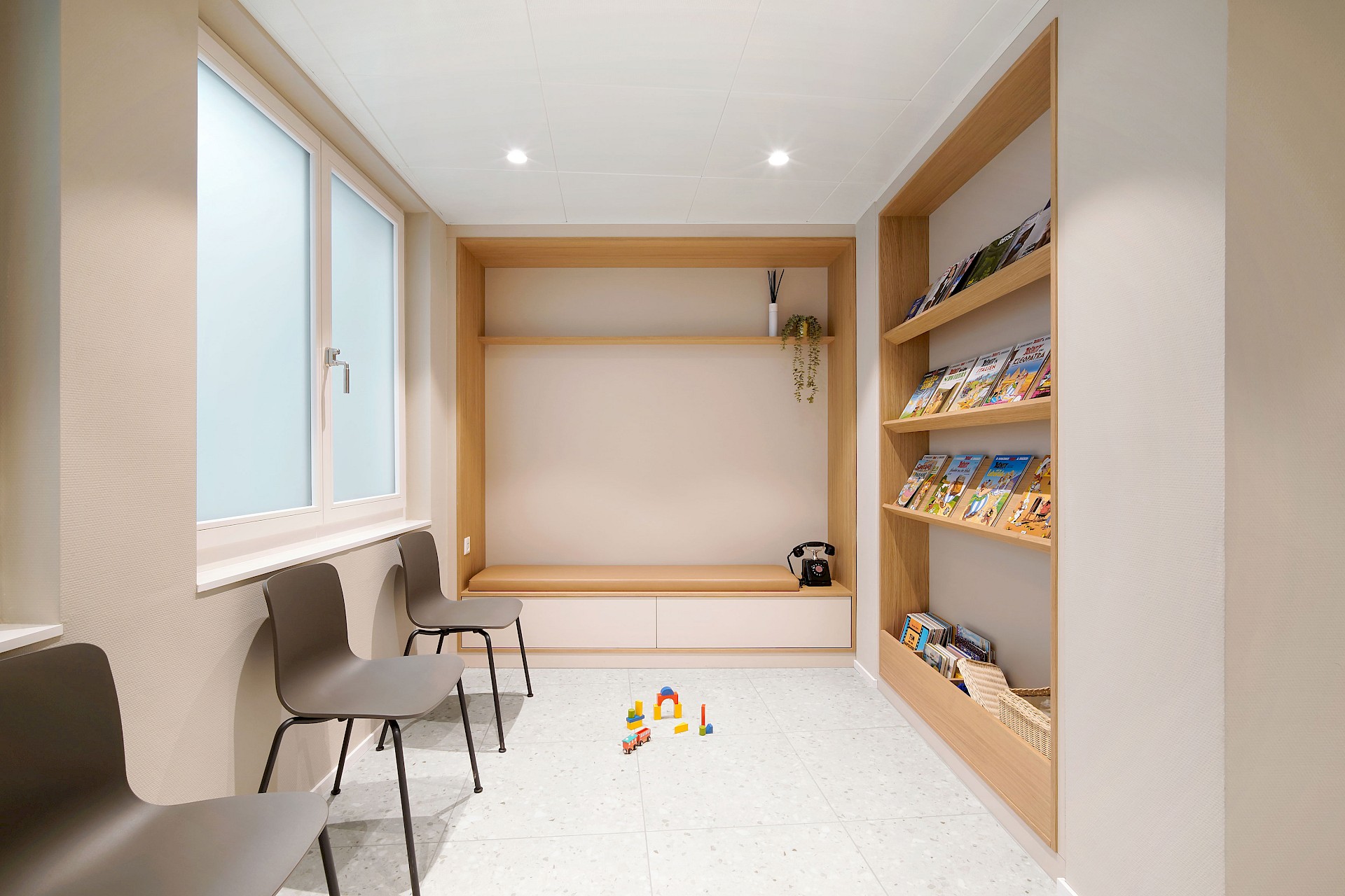 Auch der Wartebereich wurde mit Sorgfalt gestaltet: Magazine für Erwachsene, Kinderbücher und Comics sowie ein nostalgisches Telefon als «Geschichtentelefon» für die Kleinen bieten eine abwechslungsreiche Möglichkeit, die Wartezeit angenehm zu überbrücken.
