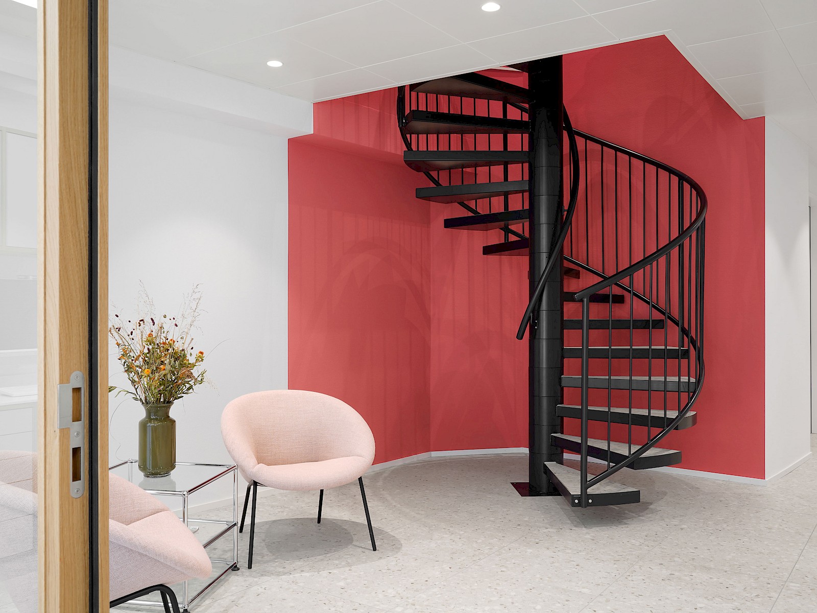 Die vom Architekten entwickelte Grundrissstruktur stellte durch ihre verwinkelte Geometrie und die schmalen Räume eine besondere Herausforderung dar. Die Korridorräume unterstützten wir bewusst in ihrer Form – mit gezielter Formensprache, Materialisierung und Farbgebung. So entstand ein spannendes Raumkonzept, das die vorhandenen Strukturen stärkt und ihnen eine klare Ordnung verleiht.