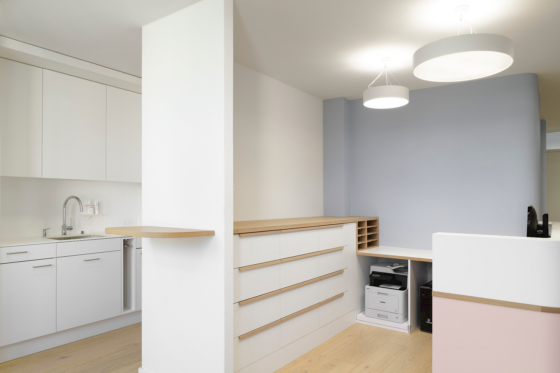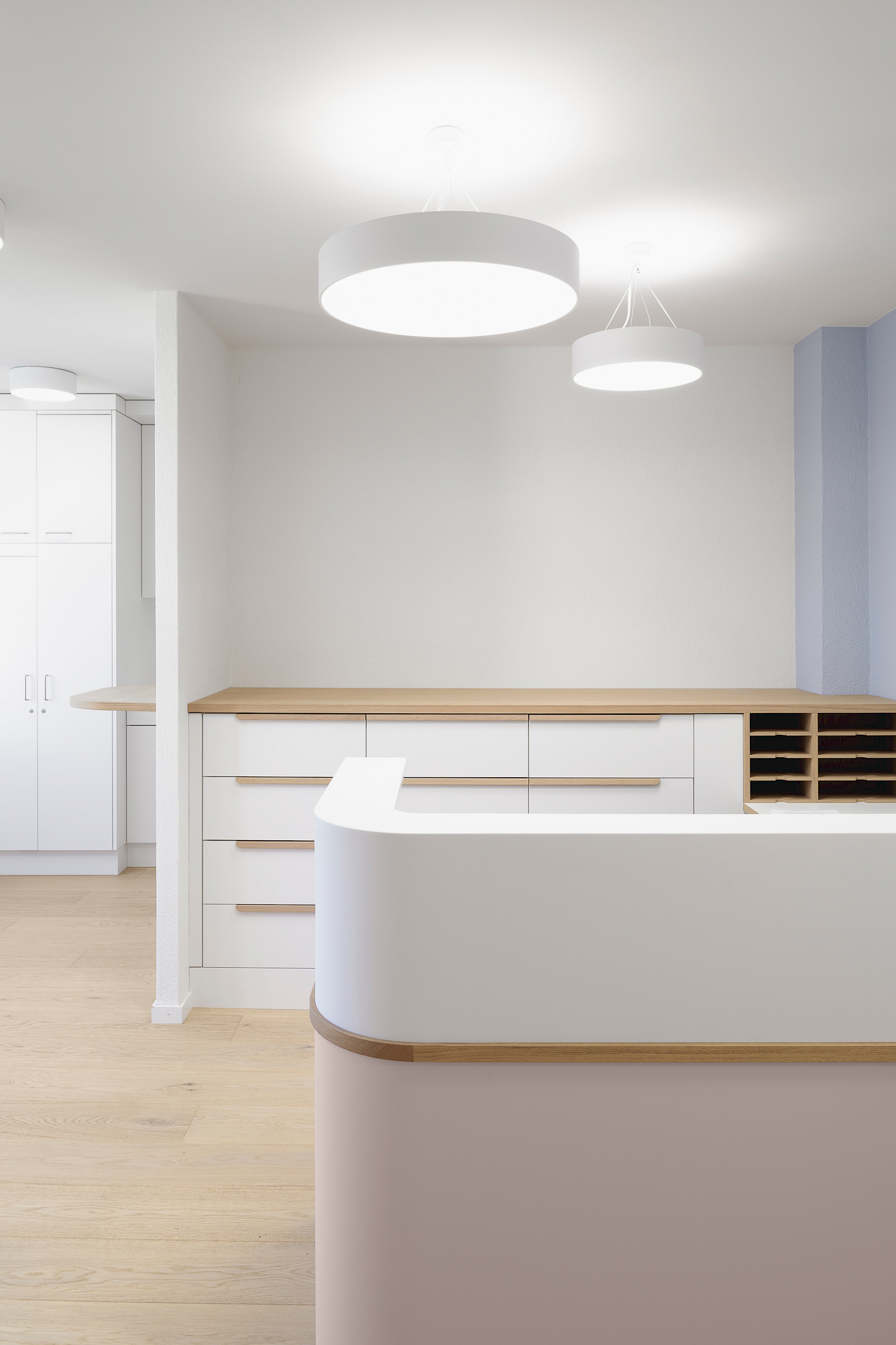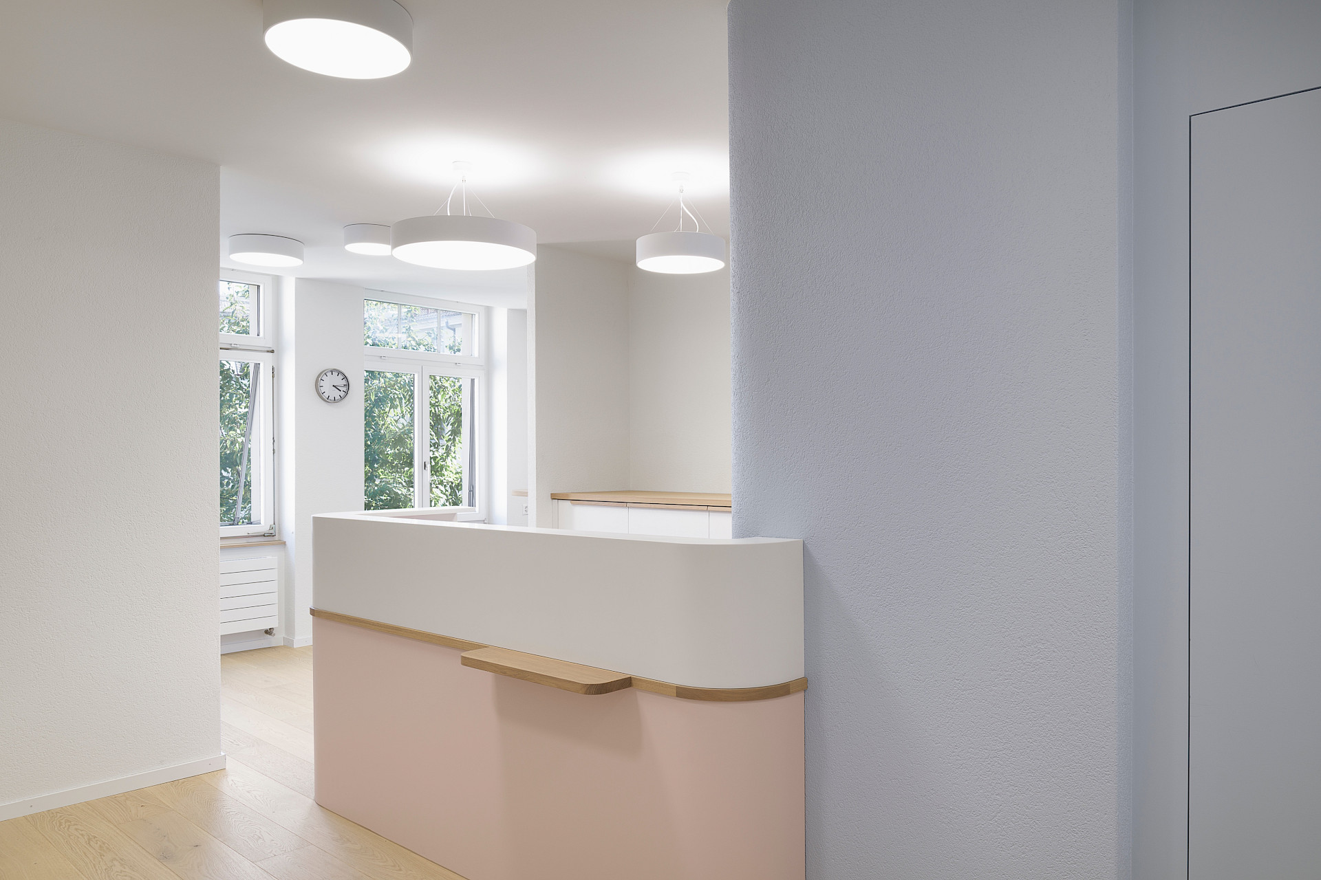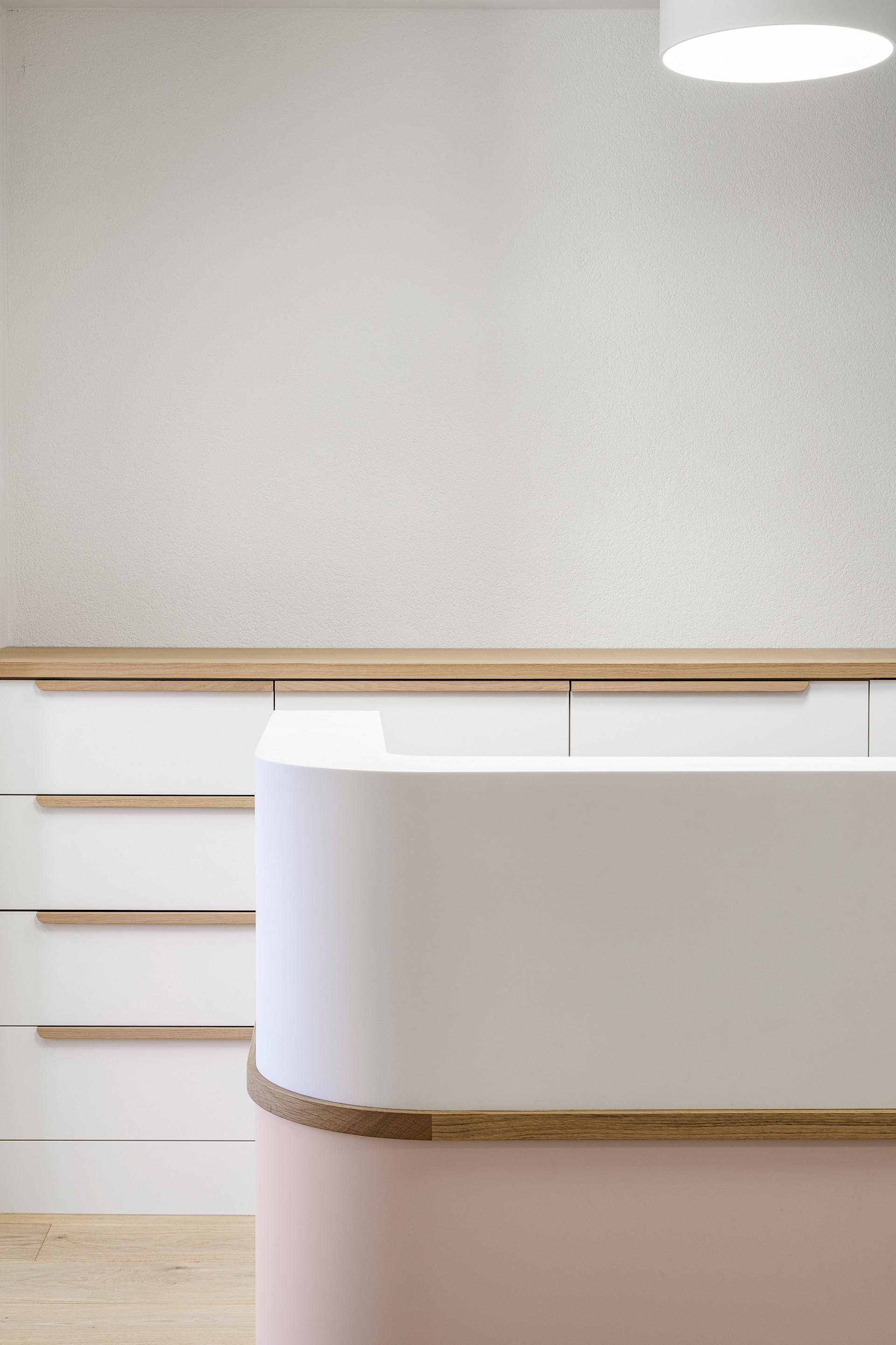 Die gesamte Praxis ist in Weiß gehalten, ergänzt durch Böden und feine Elemente aus hellem Eichenholz. Wenige Elemente in sorgfältig ausgewählten Pastellfarben sorgen für Akzente. Schlichte Möbel mit runden Ecken prägen die Räume, um Verletzungen bei den kleinen Patienten zu vermeiden.