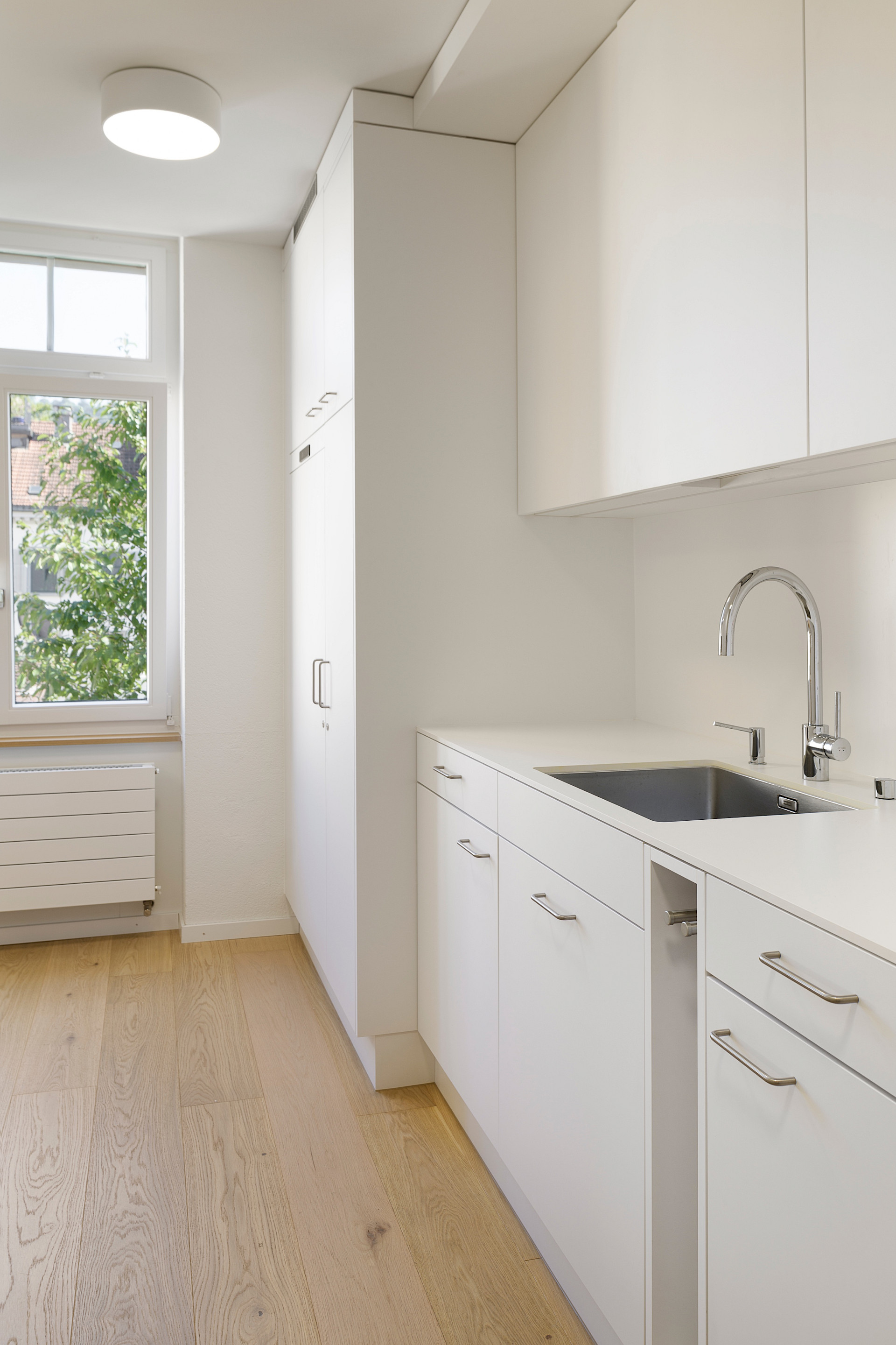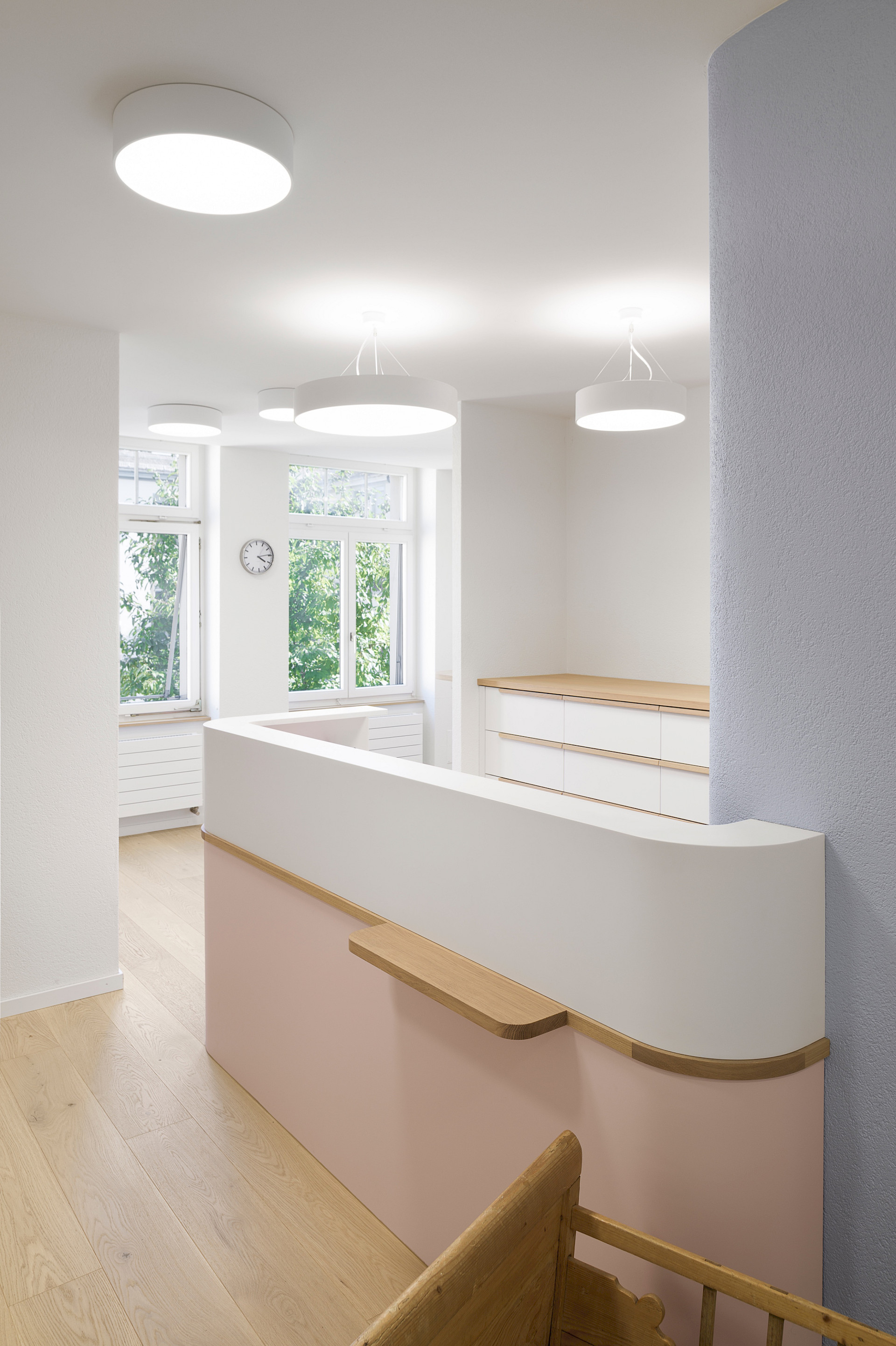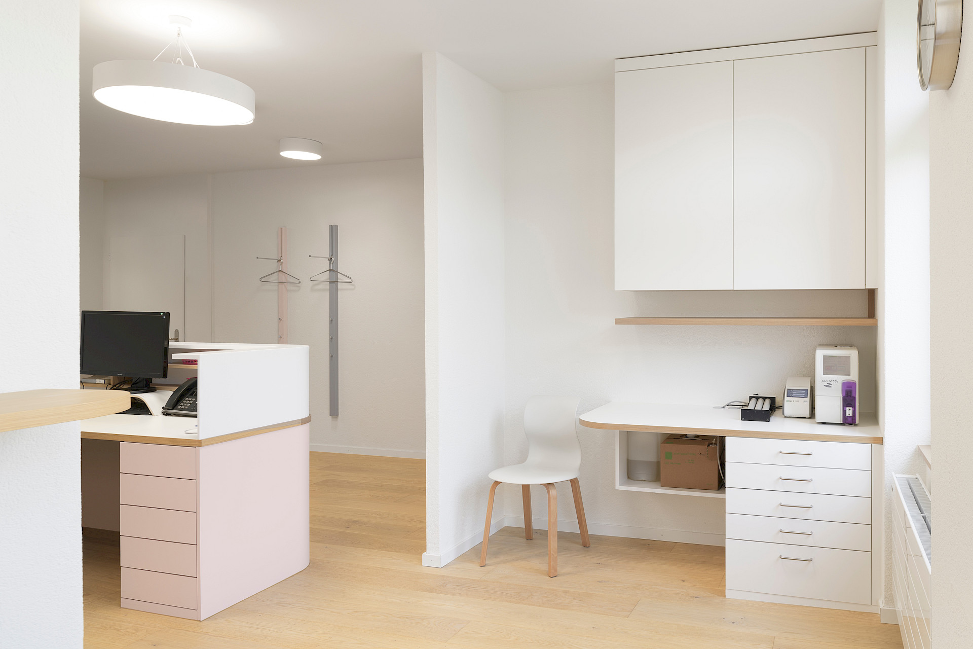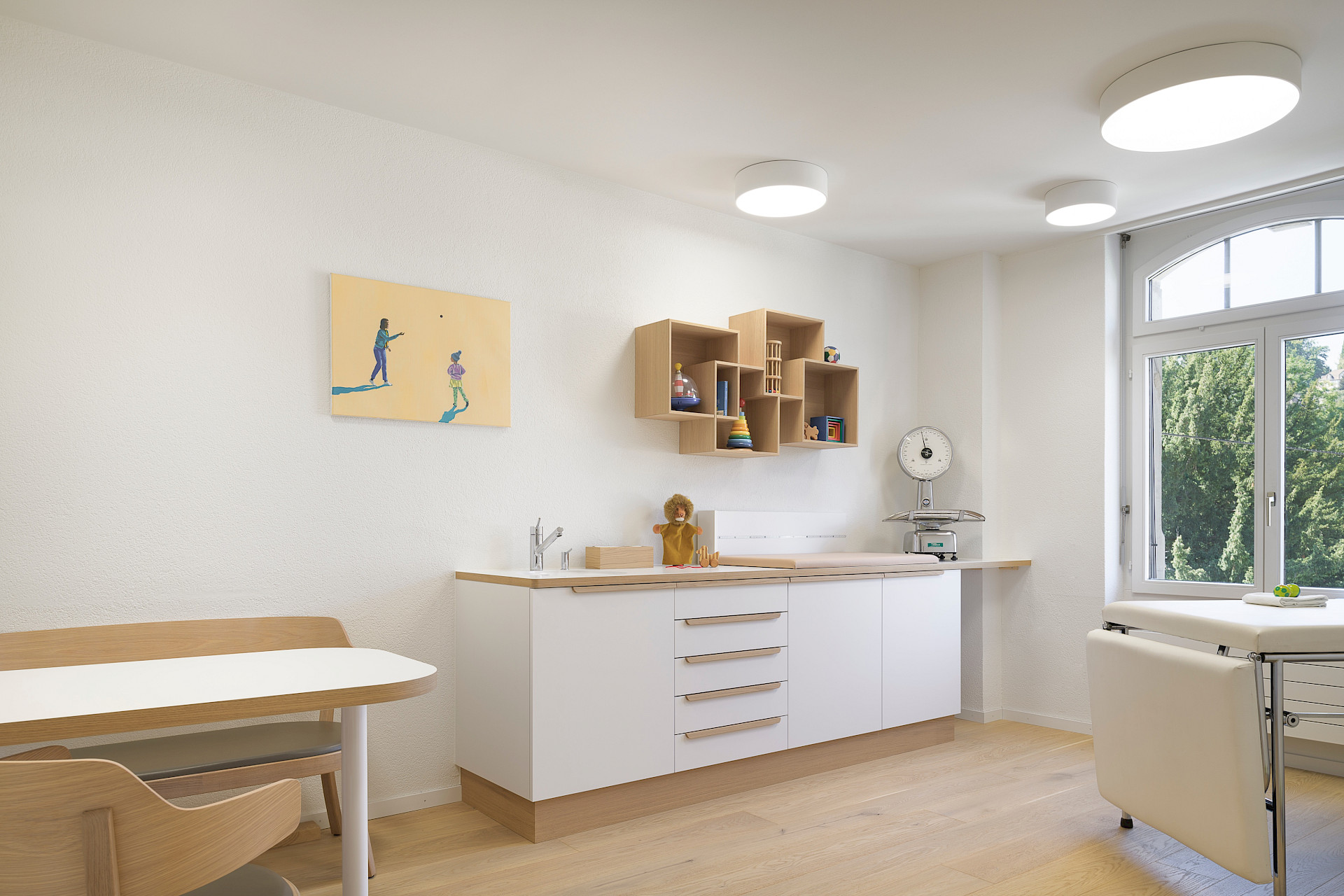 Sämtliche Böden, Decken und die gesamte Möblierung wurden zurückgebaut, von Grund auf neu geplant und in enger Zusammenarbeit mit den beiden Kinderärztinnen optimal auf die Bedürfnisse zugeschnitten. Auch der Brandschutz wurde den heutigen Richtlinien angepasst und die Akustik mit Akustikdecken optimiert.