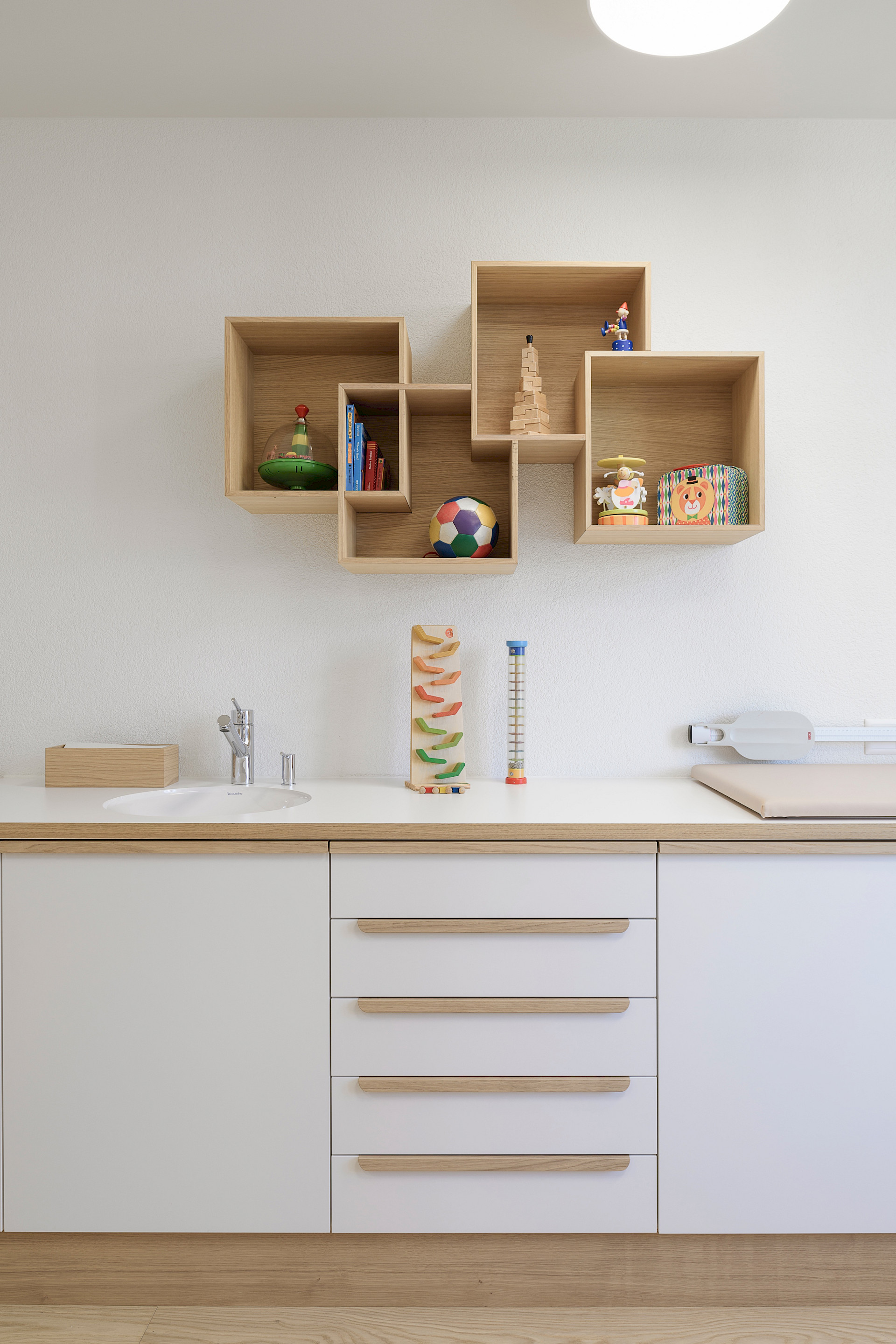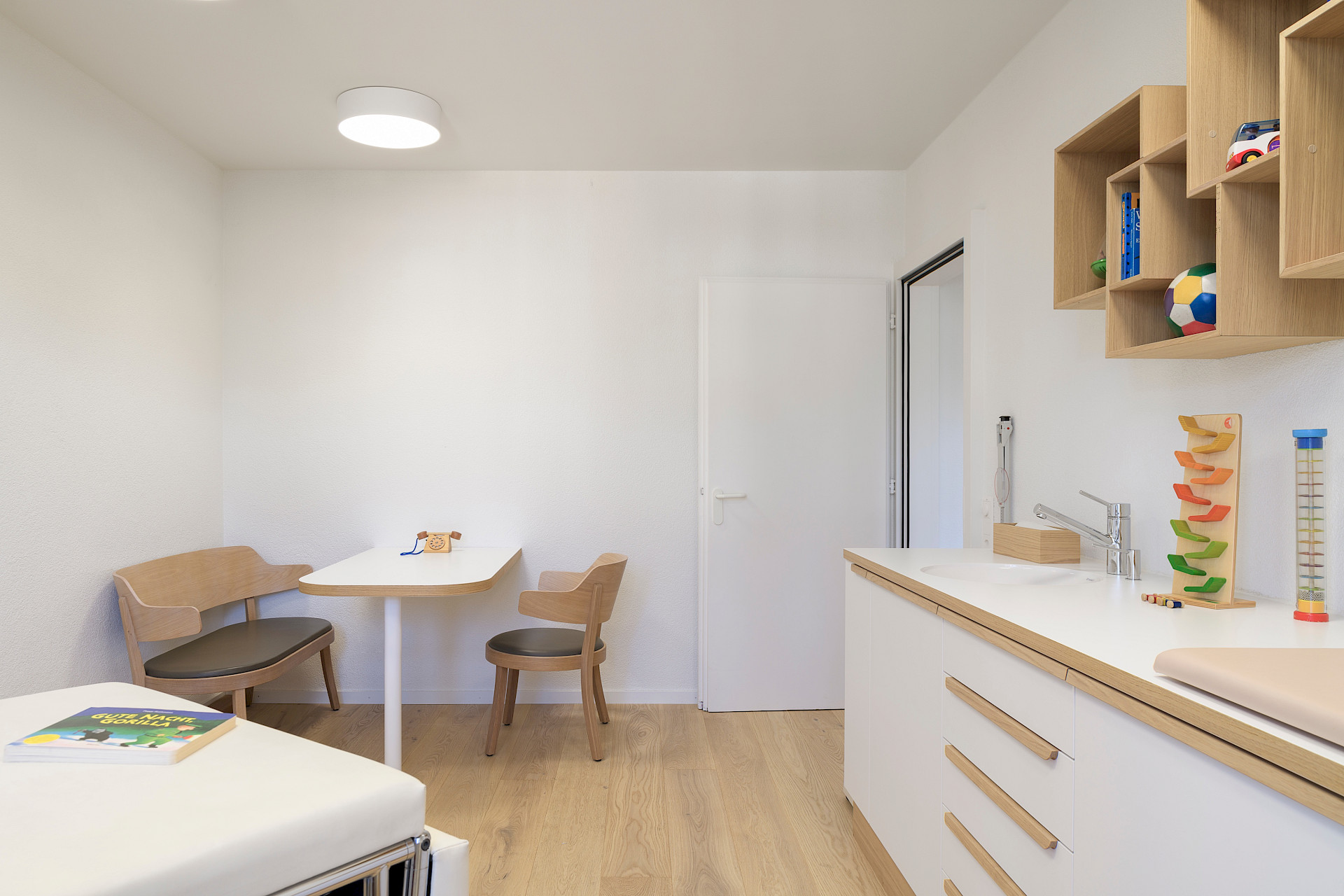 Elegante Griffleisten und verspielte Wandregale aus Eichenholz tragen zur wohnlichen Atmosphäre bei. Zusammen mit bunten Kinderspielzeugen hauchen sie den Behandlungsräumen Leben ein.