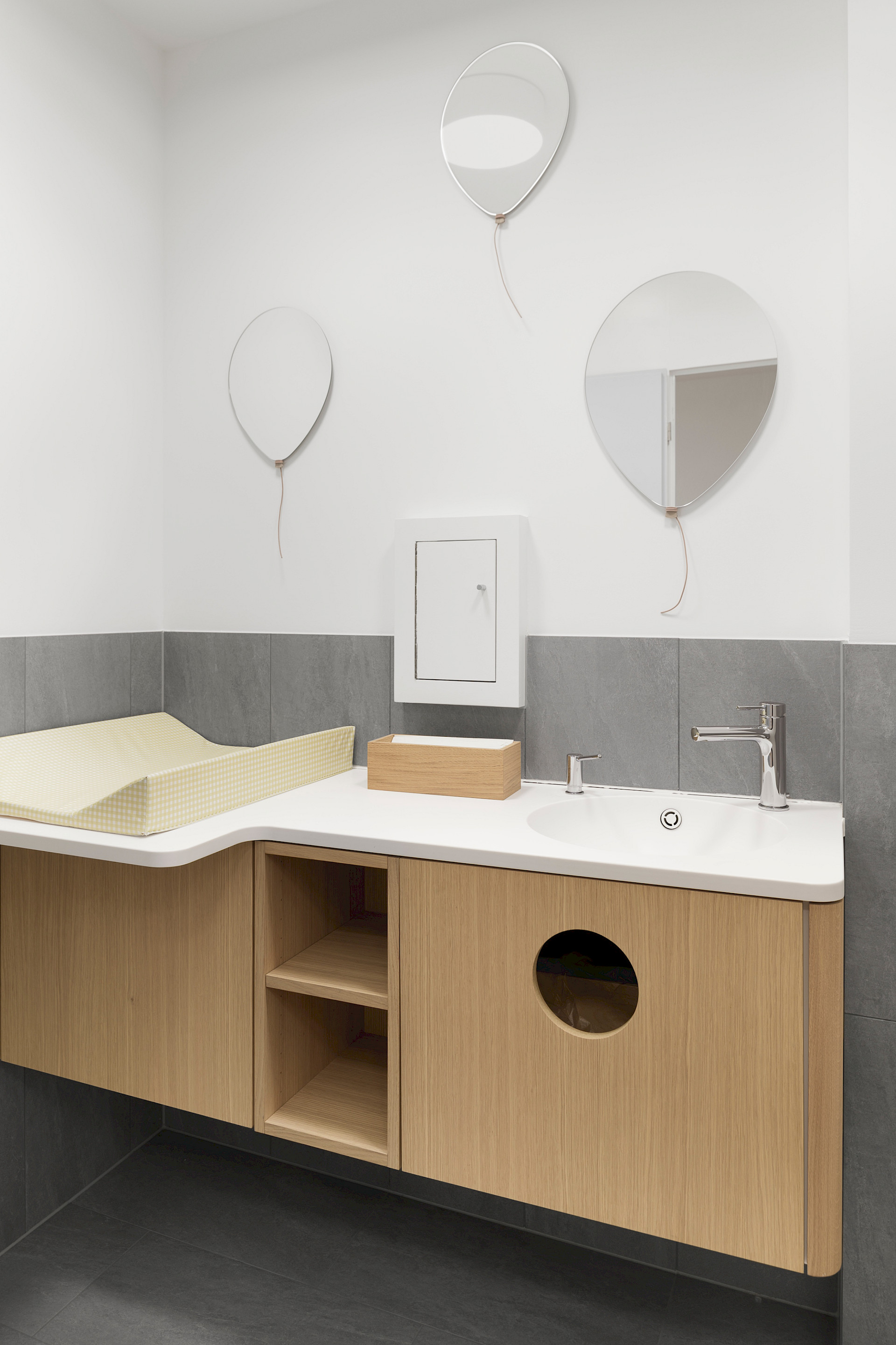 Eichenholz ist auch in der Patiententoilette präsent. Das Badmöbel integriert den Wickeltisch und einen Handtuchabwurf auf charmante Weise. Spielerisch angeordnete Spiegel in Ballonform sind eine subtile Anspielung auf den Namen der Kinderarztpraxis, die nun in neuem Licht erstrahlt.