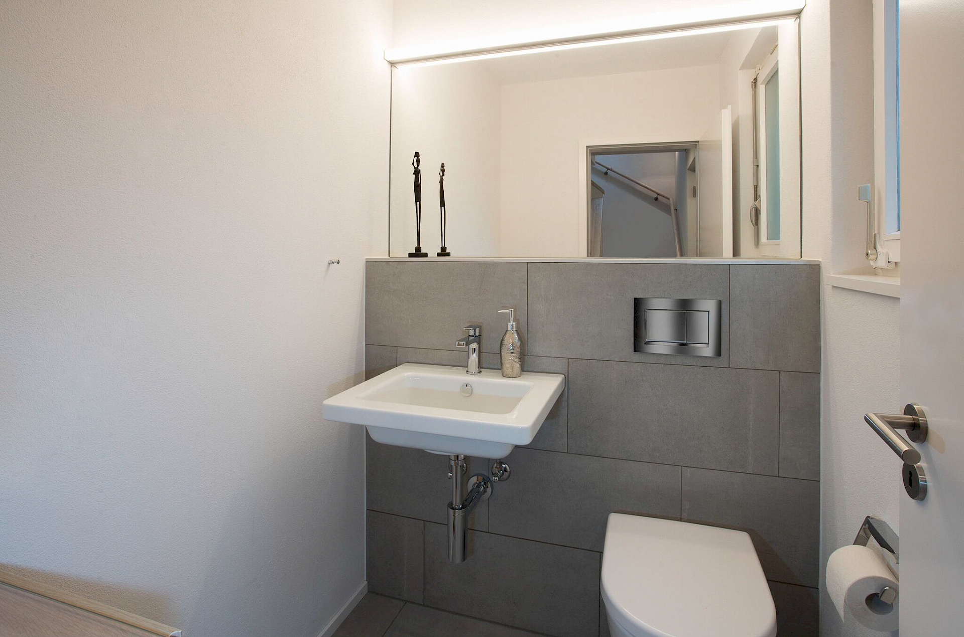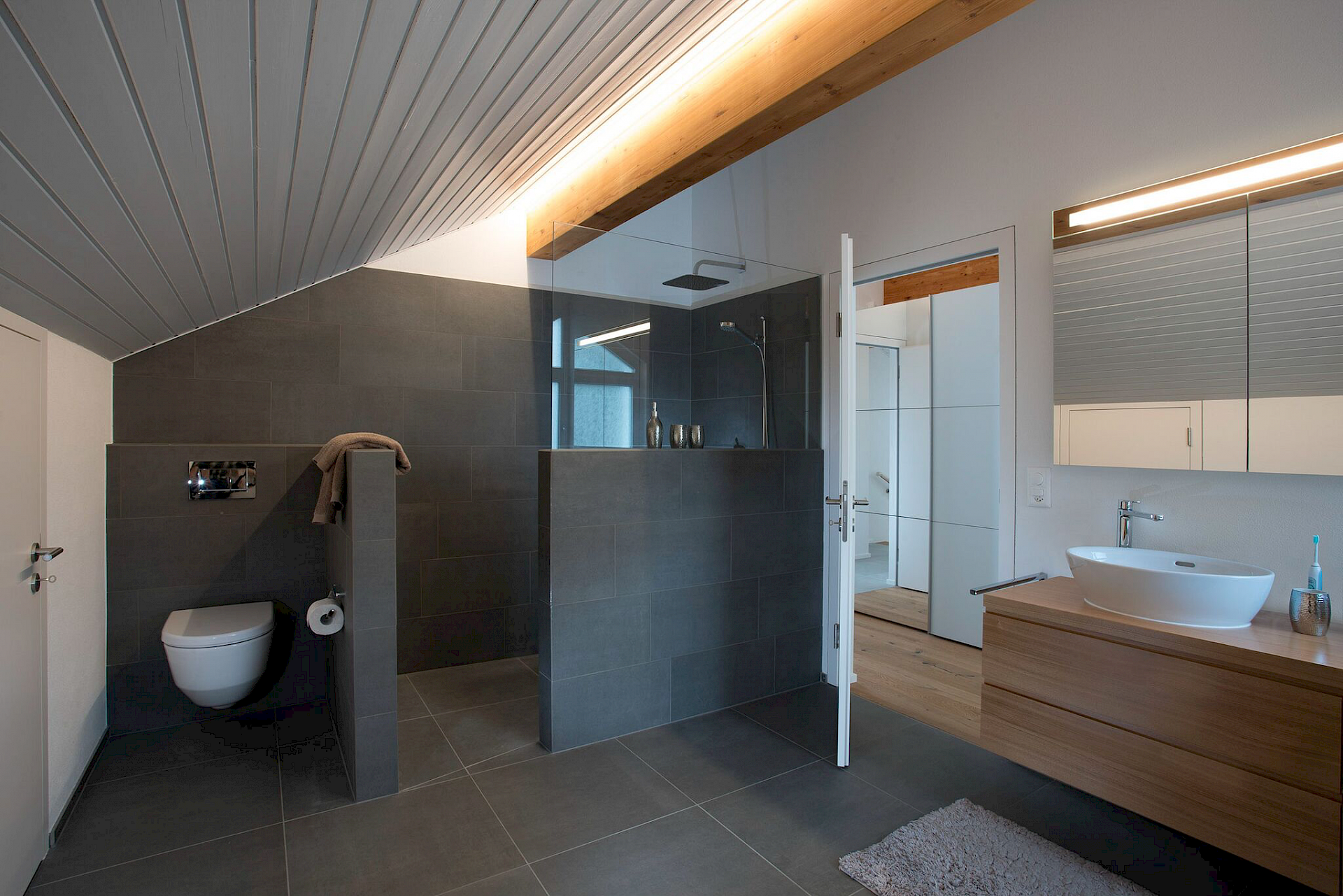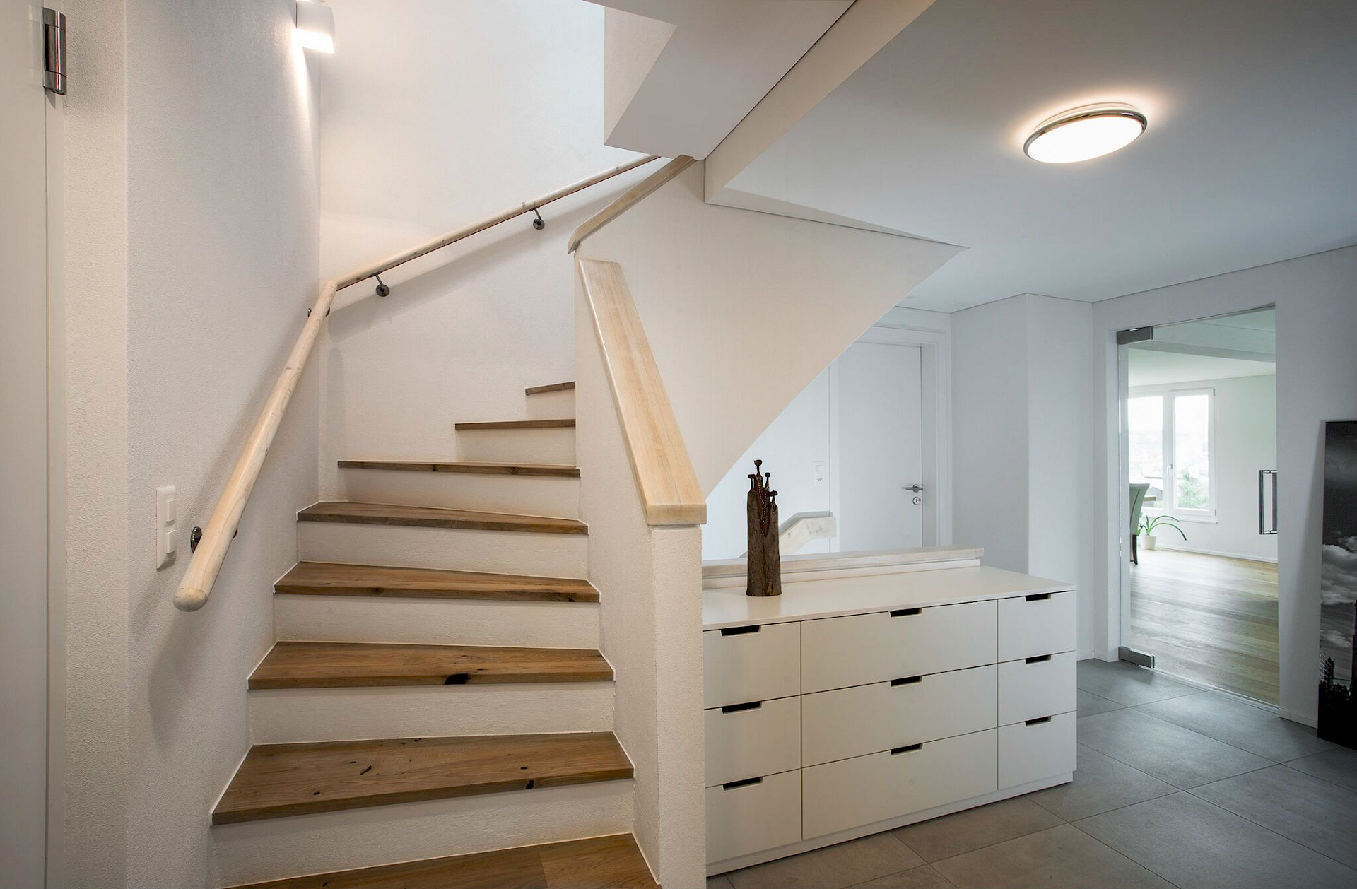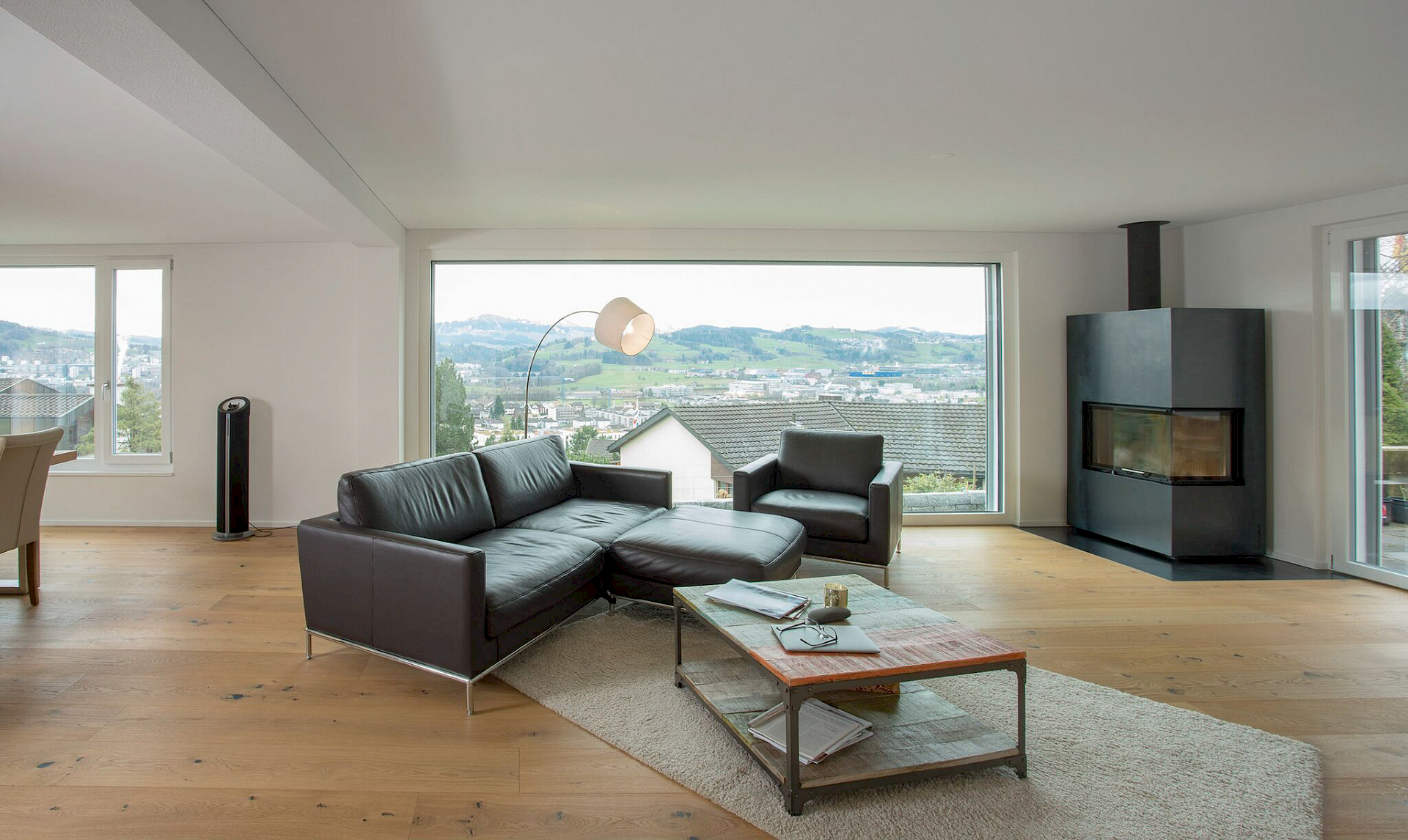 Das Haus aus den 80er-Jahren in Abtwil liegt am Südhang mit wunderschönem Blick auf den Alpstein. Doch viele Materialien wie Wand- und Bodenbeläge waren asbesthaltig. Da das Gebäude bis auf den Kern ausgehölt wurde, musste beim Abbruch aufgrund dessen eine fachliche Asbestentsorgung durchgeführt werden.