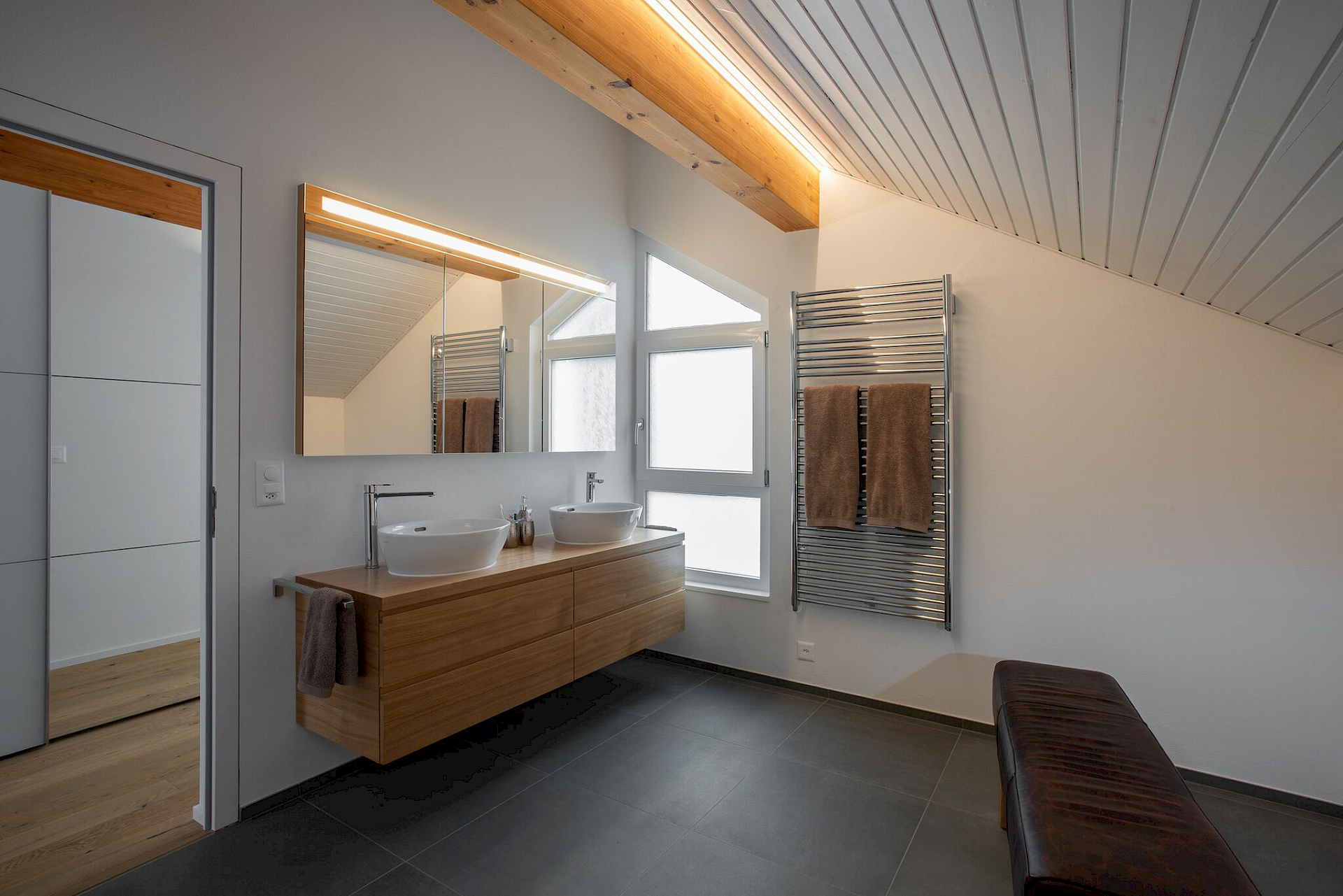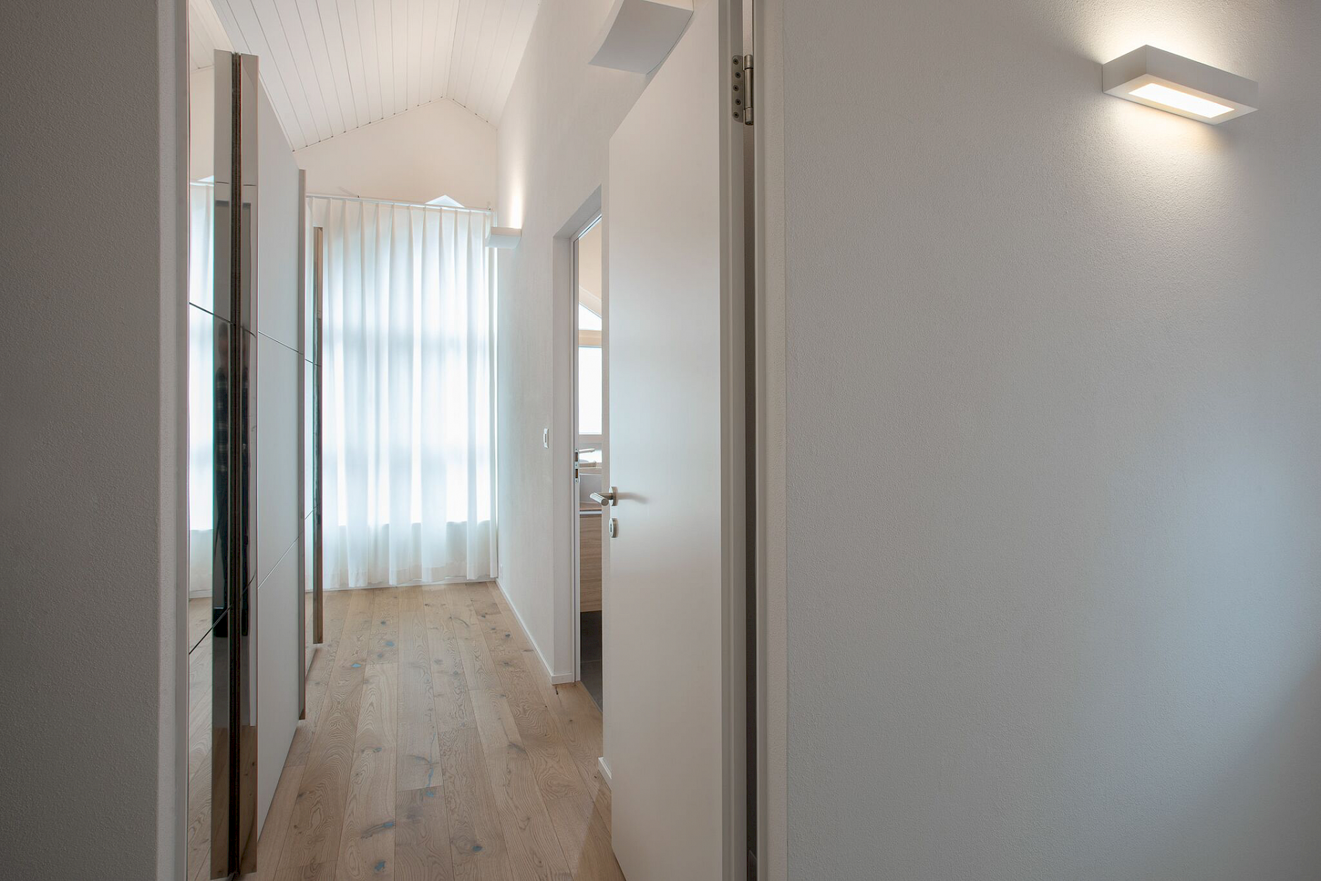 Das Dachgeschoss wurde zum Elternschlafzimmer mit Ankleide und Bad ausgebaut. Auch das Schlafzimmer erhielt eine grosszügige Schleppgaube mit Blick auf den idyllischen Alpstein.