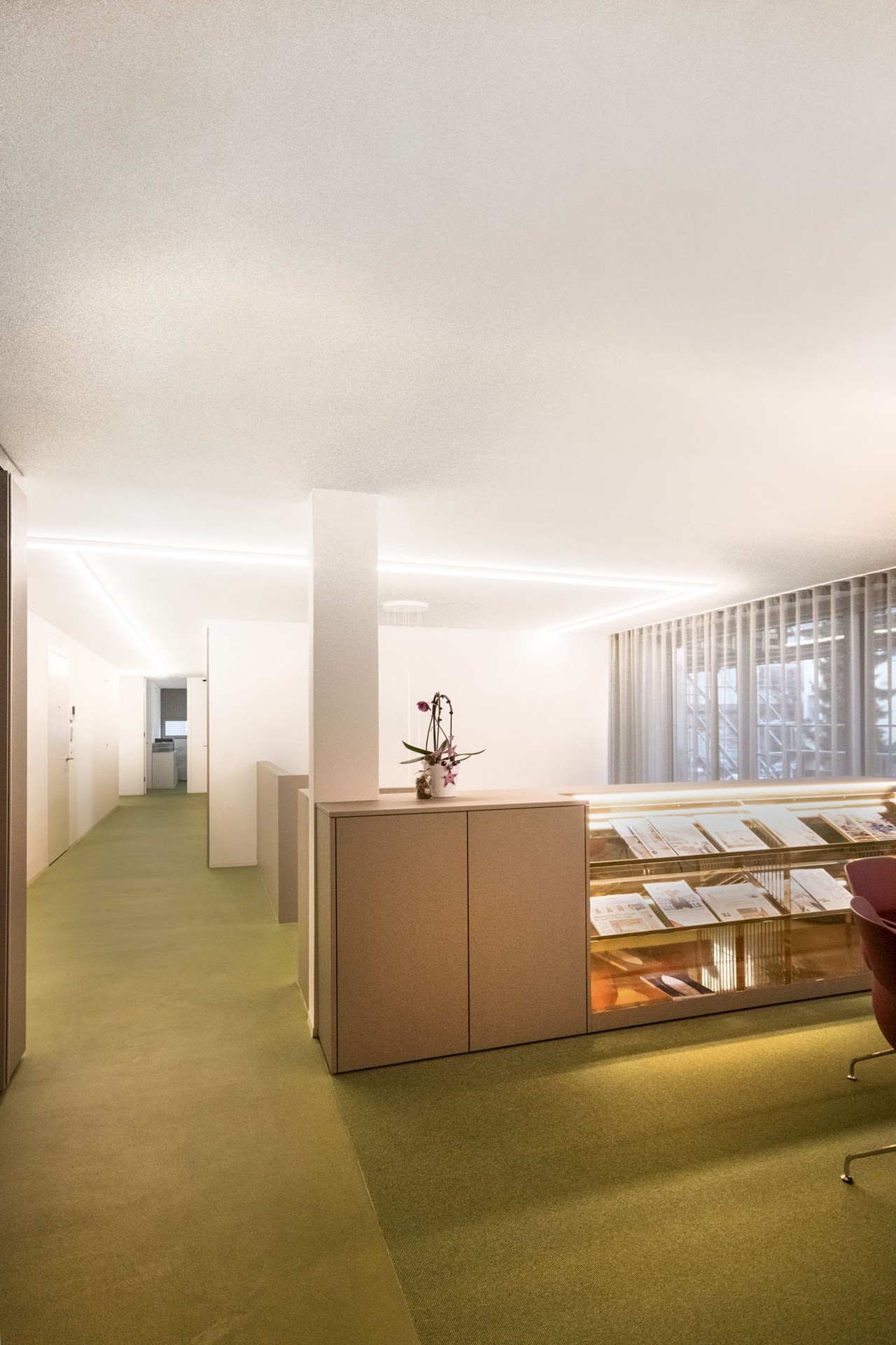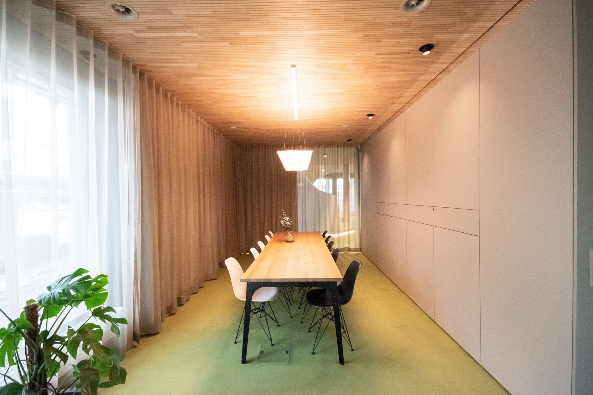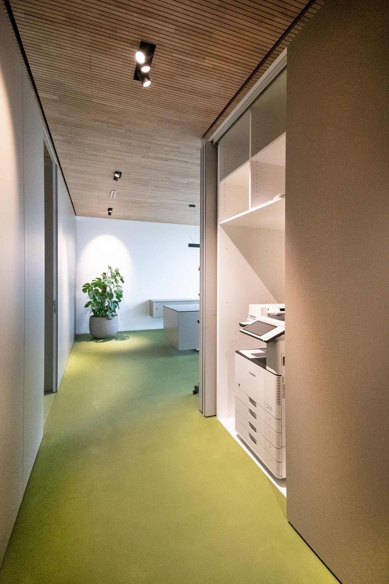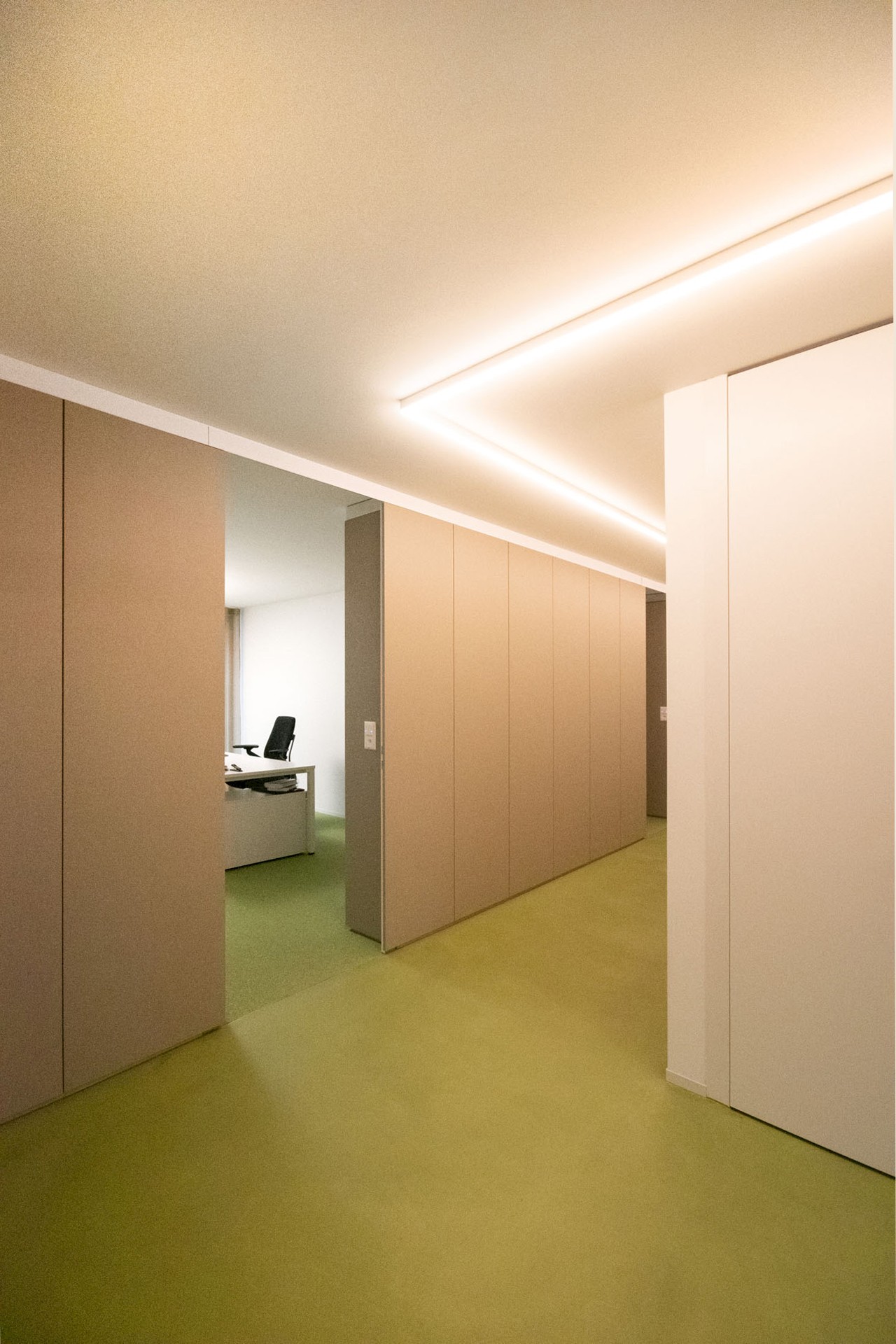 Das mehrgeschossige Bürogebäude in Niederuzwil ist mit viel Liebe zum Detail geplant und umgesetzt worden. Unser Auftrag bestand darin, sämtliche Deckenverkleidungen in Eichenholz, Nasszellen in Acrylstein, Möbel farblackiert und in Messing und raumhohe, farblackierte Wandverkleidungen umzusetzen. Im geschlossenen Zustand dieser Wandverkleidungen ist nicht zu erahnen, was sich dahinter verbirgt: Ob Druckernischen, Schränke, Räume wie Duschen oder Toiletten oder ganze Küchen, die sich bei Bedarf entfalten lassen.