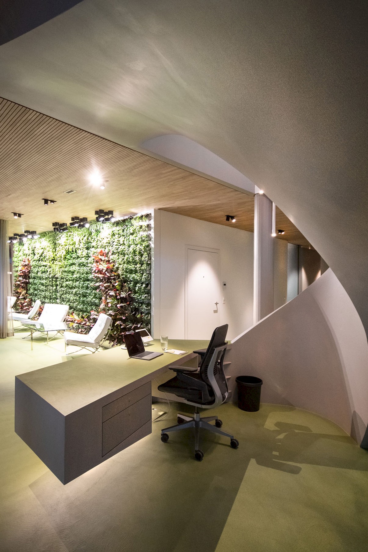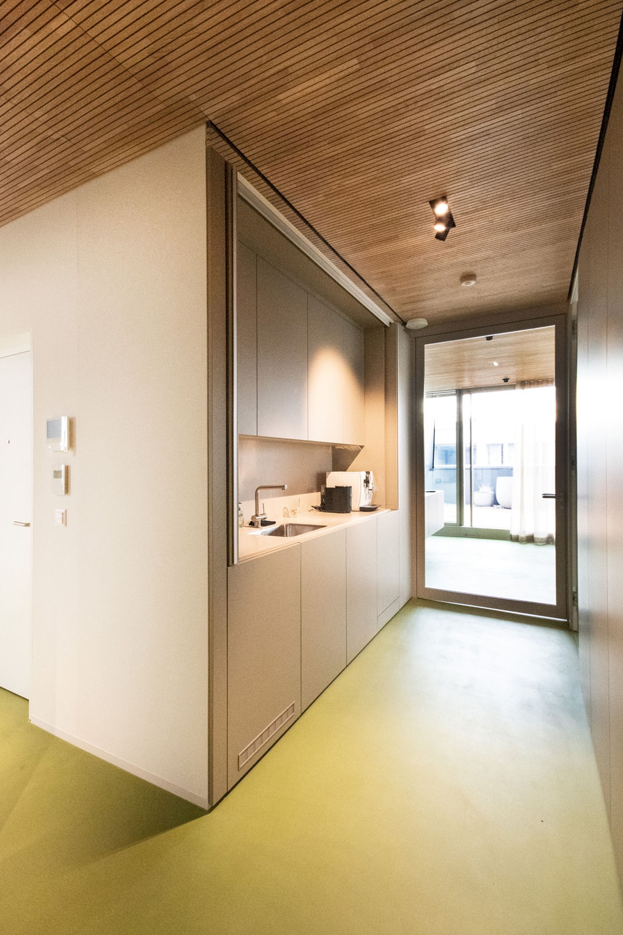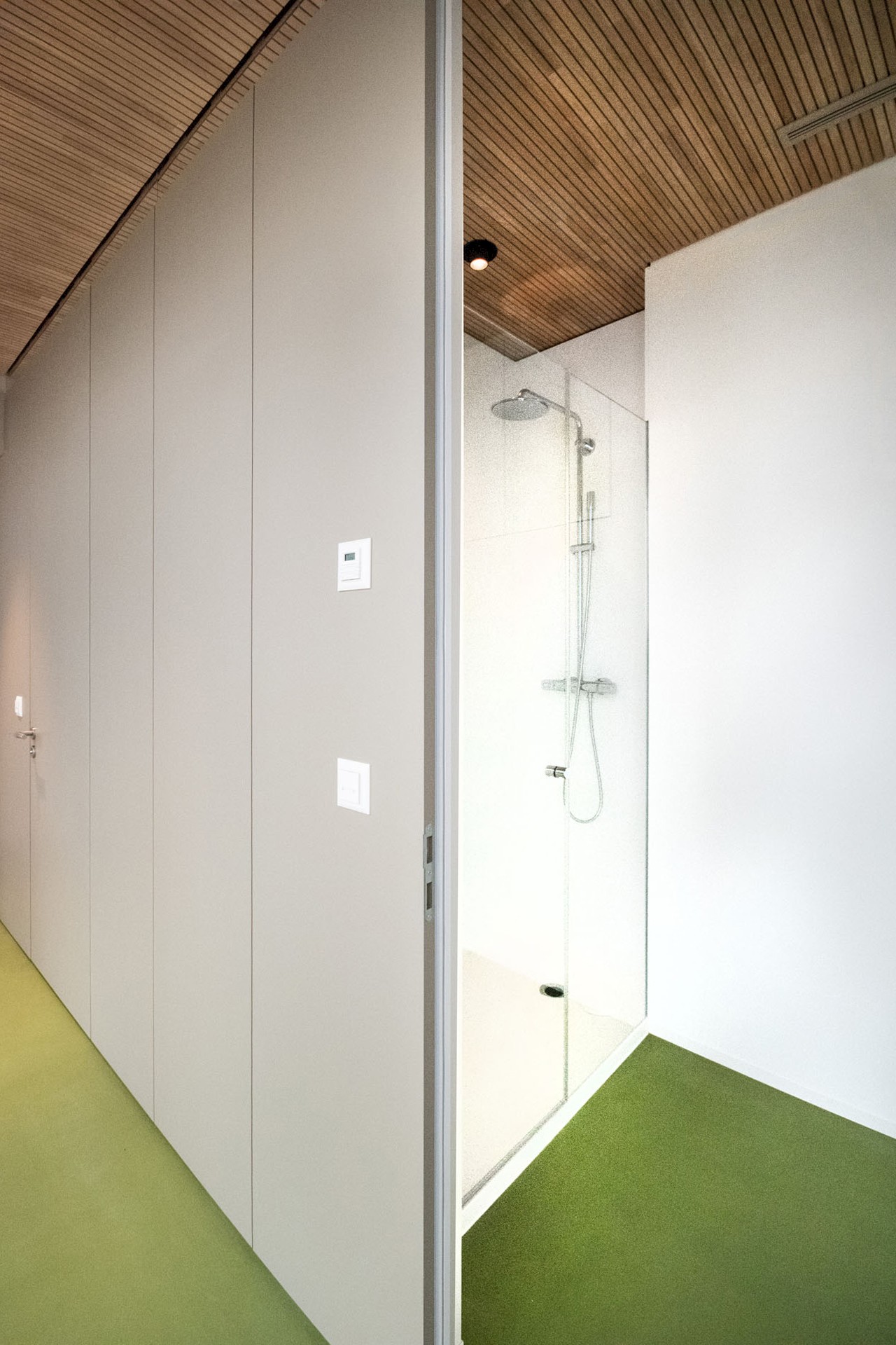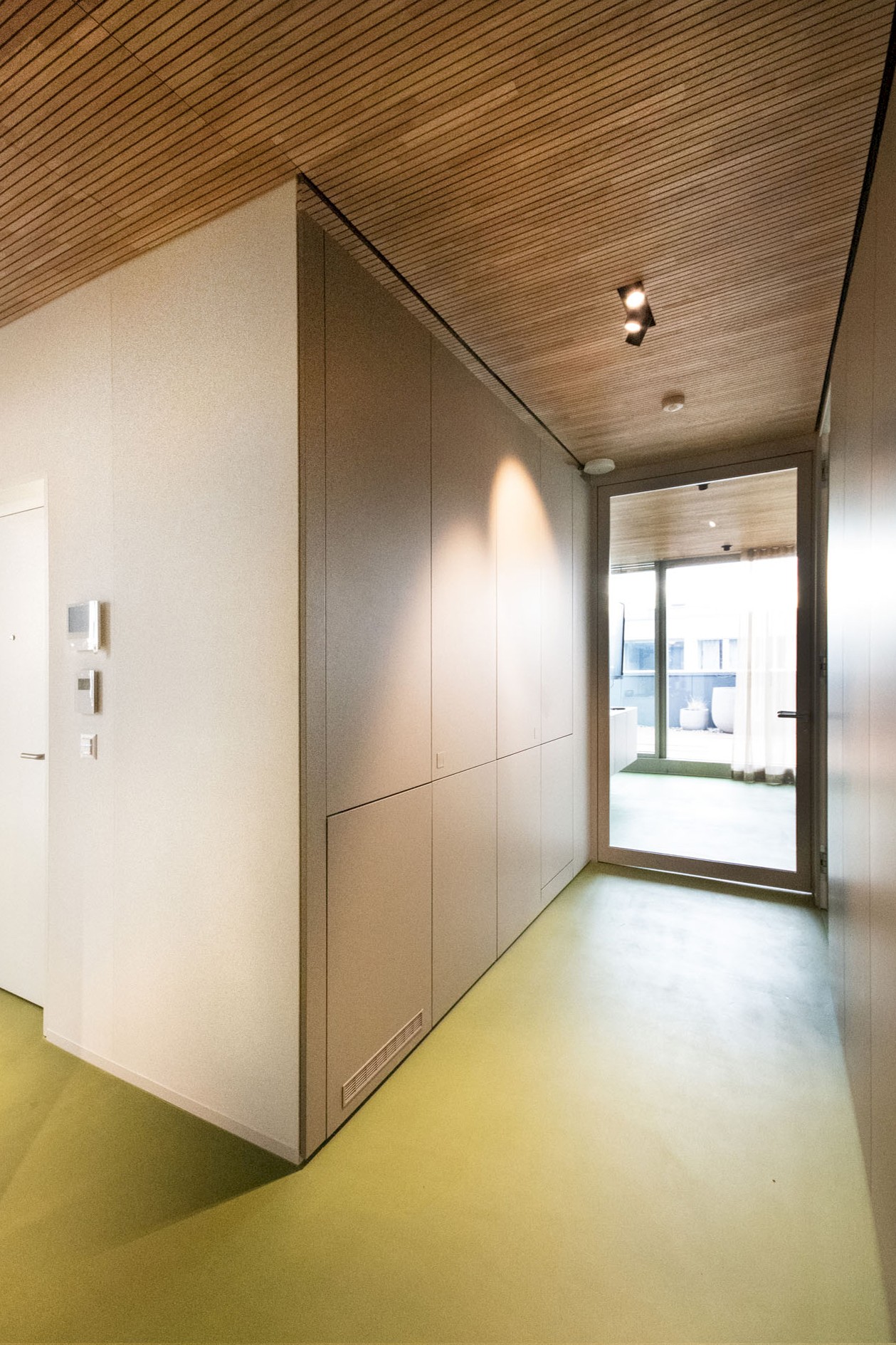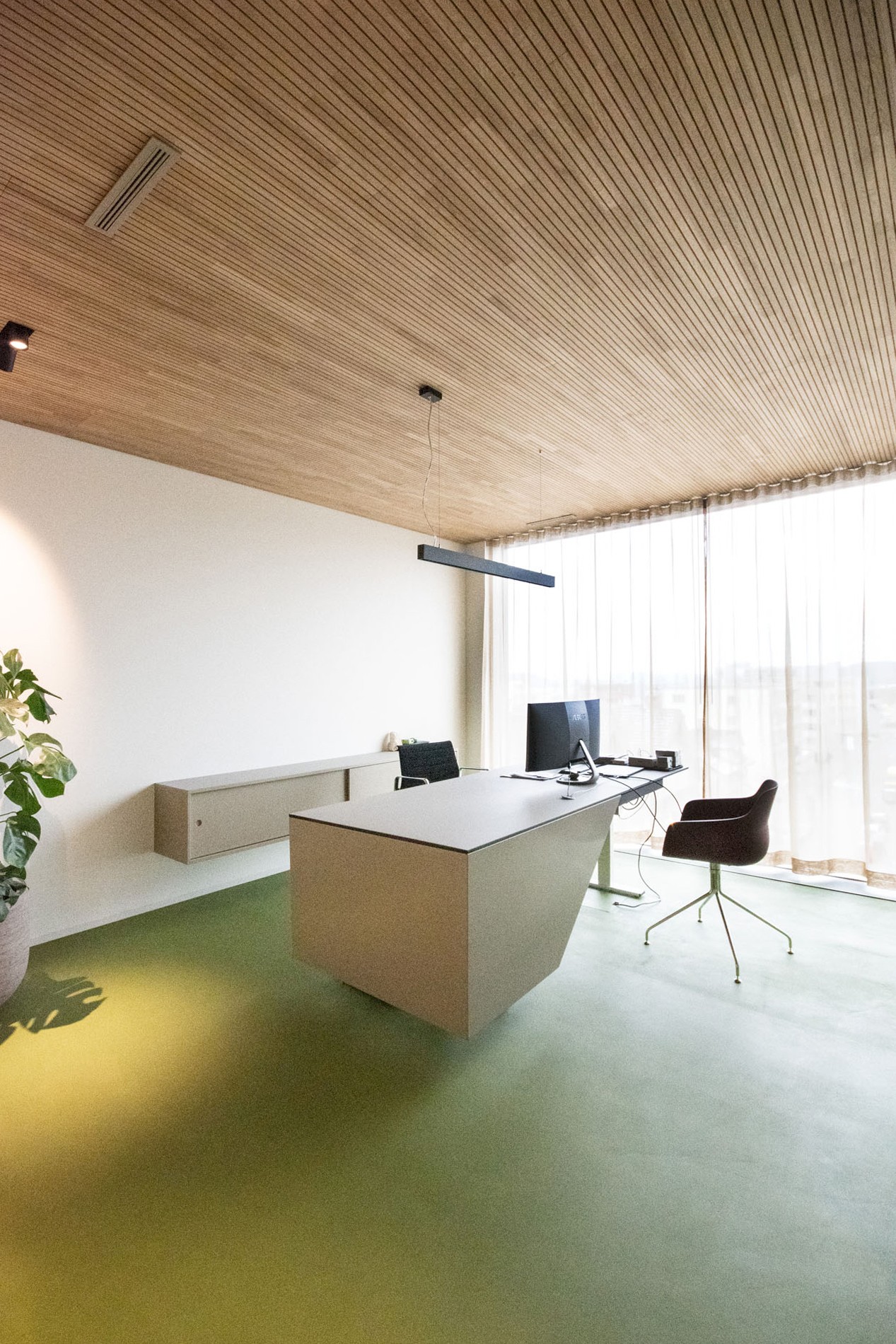 Das mehrgeschossige Bürogebäude in Niederuzwil ist mit viel Liebe zum Detail geplant und umgesetzt worden. Unser Auftrag bestand darin, sämtliche Deckenverkleidungen in Eichenholz, Nasszellen in Acrylstein, Möbel farblackiert und in Messing und raumhohe, farblackierte Wandverkleidungen umzusetzen. Im geschlossenen Zustand dieser Wandverkleidungen ist nicht zu erahnen, was sich dahinter verbirgt: Ob Druckernischen, Schränke, Räume wie Duschen oder Toiletten oder ganze Küchen, die sich bei Bedarf entfalten lassen.