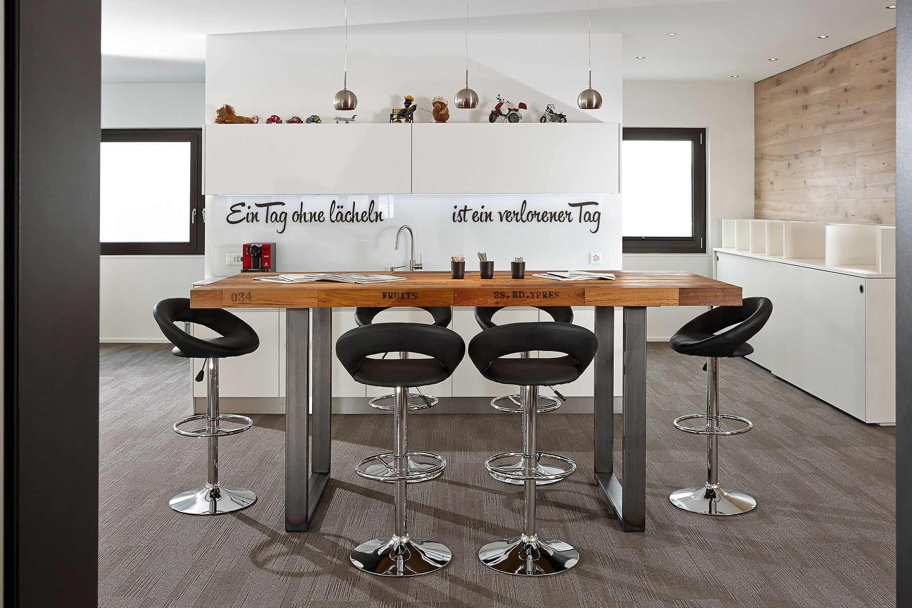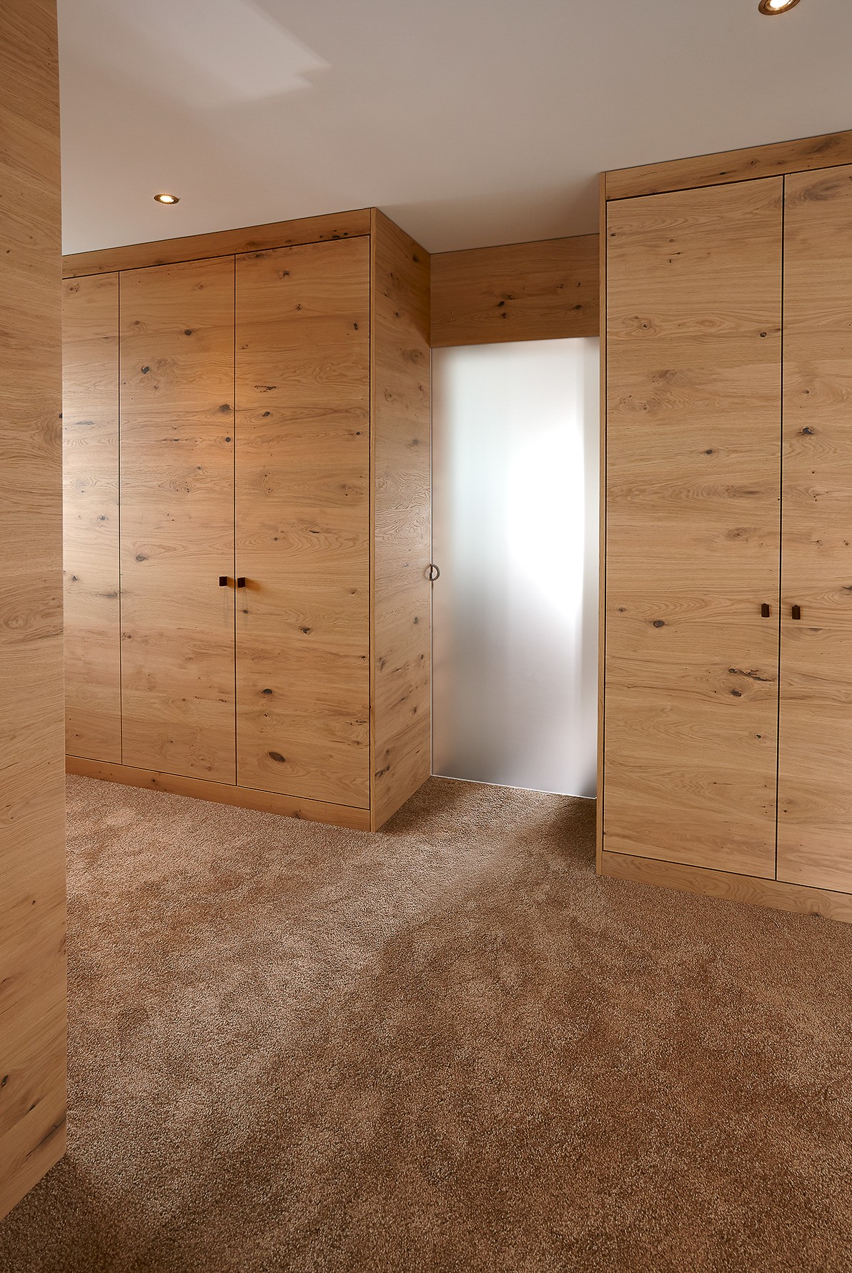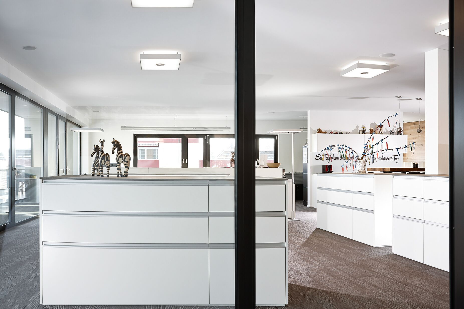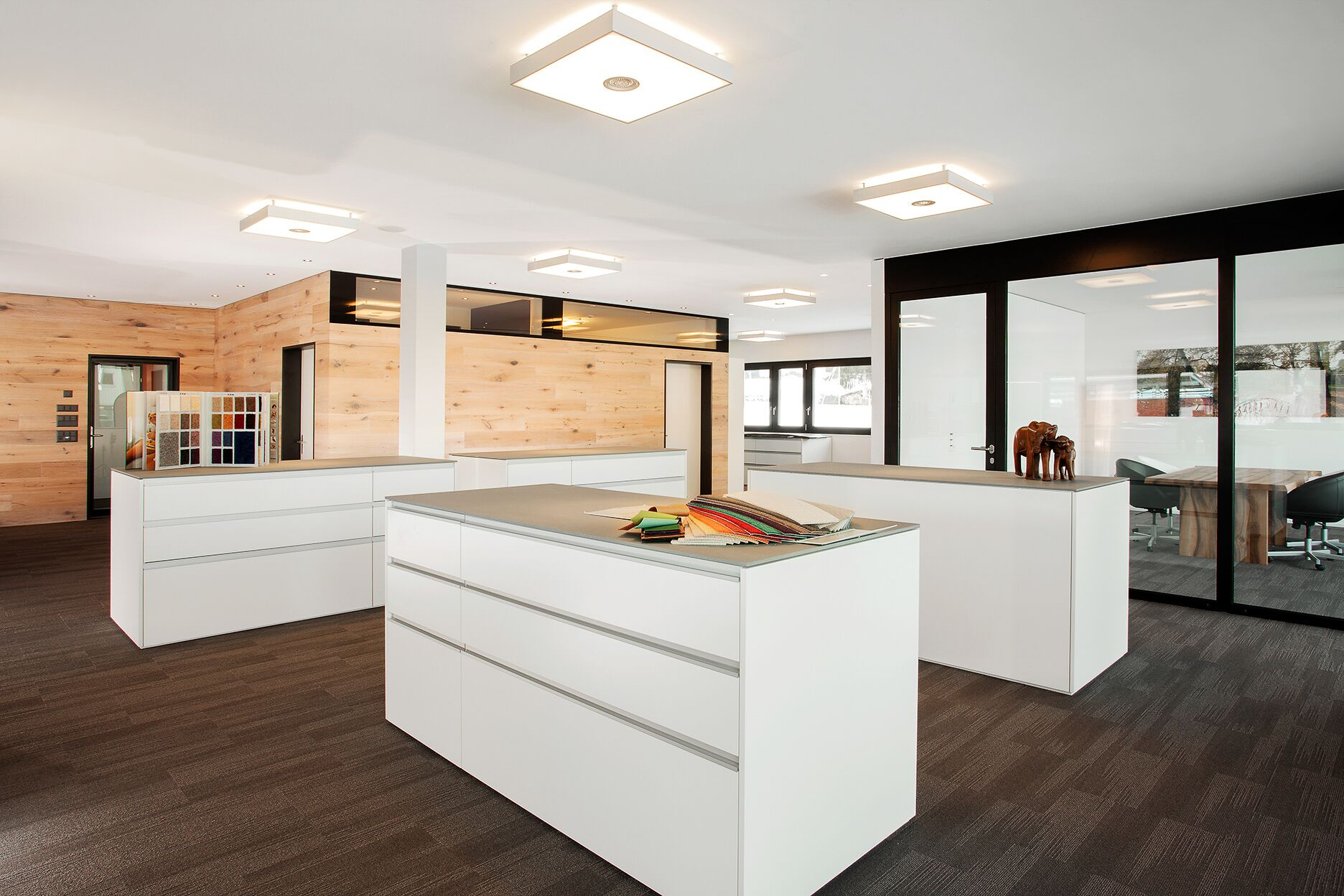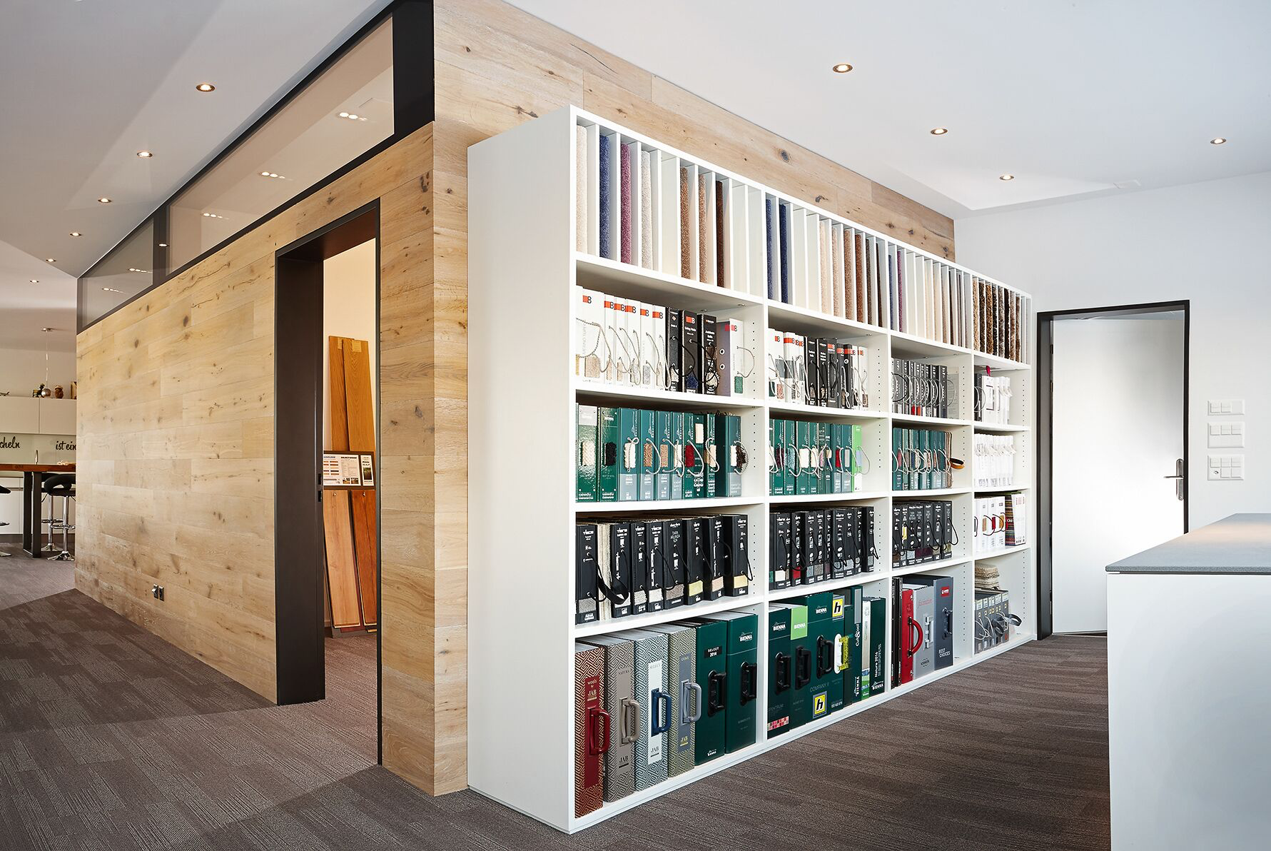 Warme Materialien wie textile Bodenbeläge und Parkett an den Wänden dominieren den Raum. Eine exakt auf die Bedürfnisse abgestimmte Möblierung mit Wandregalen und Musterkorpussen hebt sich optisch vom Bodenbelag ab und sorgt für ein konstruktives Klima.