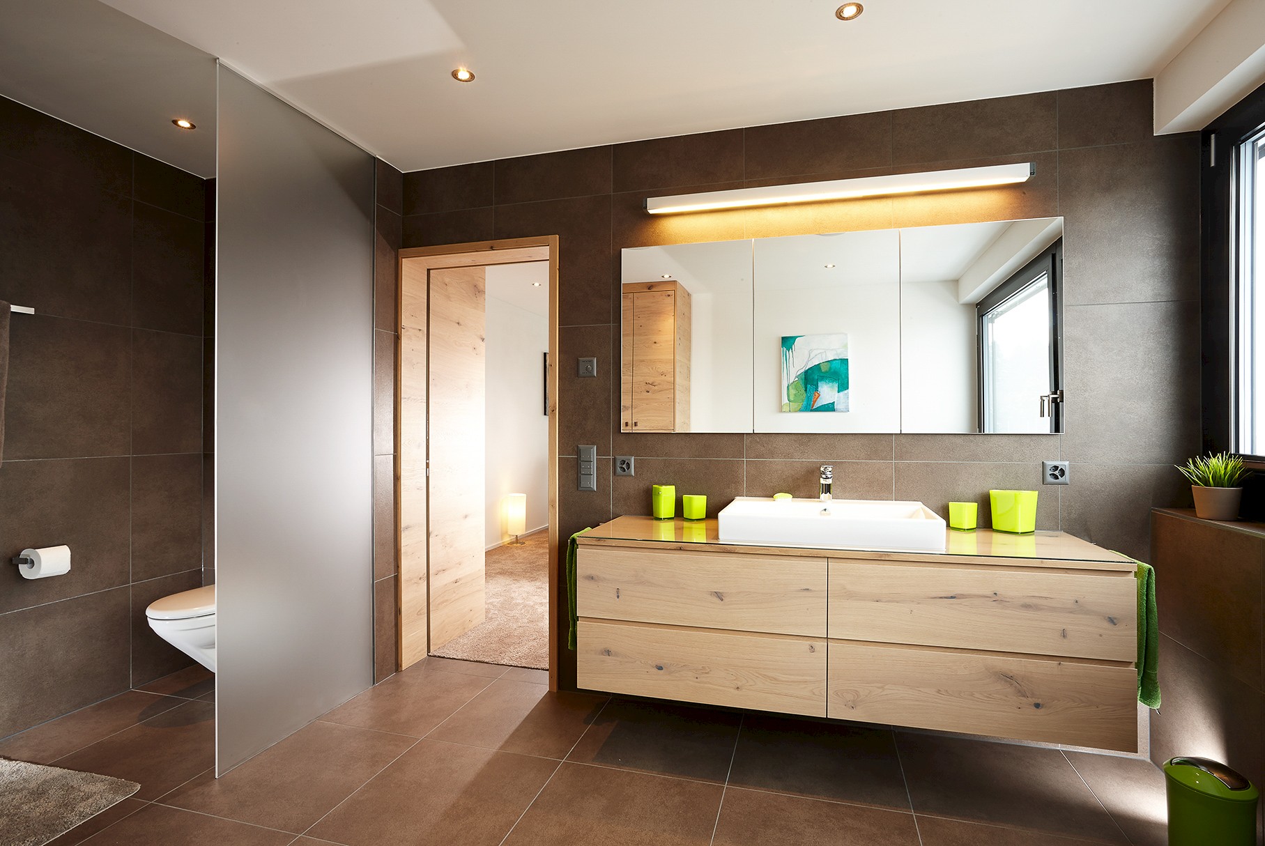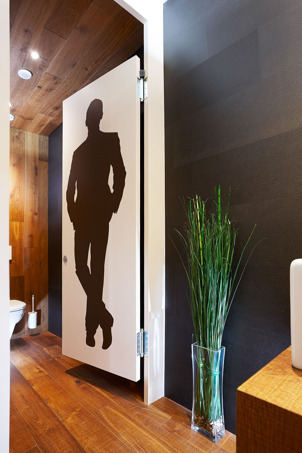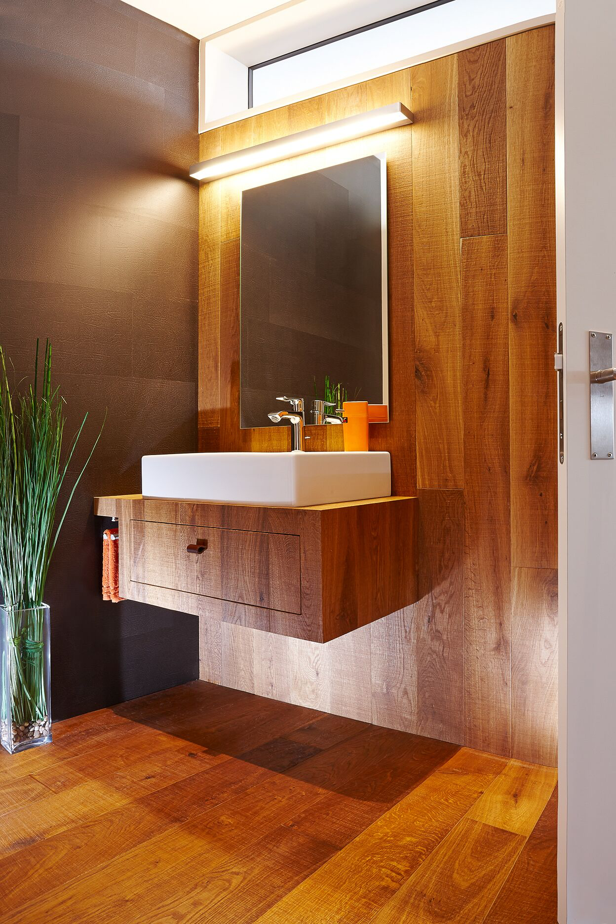 Die Gästetoiletten sind ganz dem Bodenleger entsprechend in Parkett aufgeführt. Neben dem Boden sind auch die Wände, Decken und Möbel aus Parkett gestaltet.