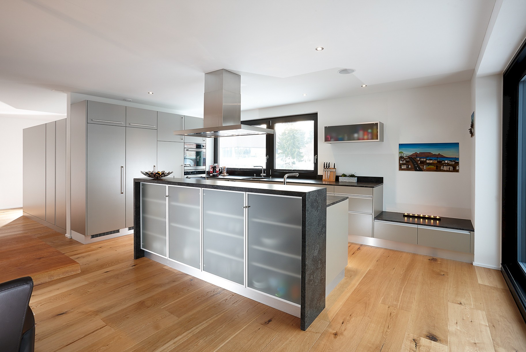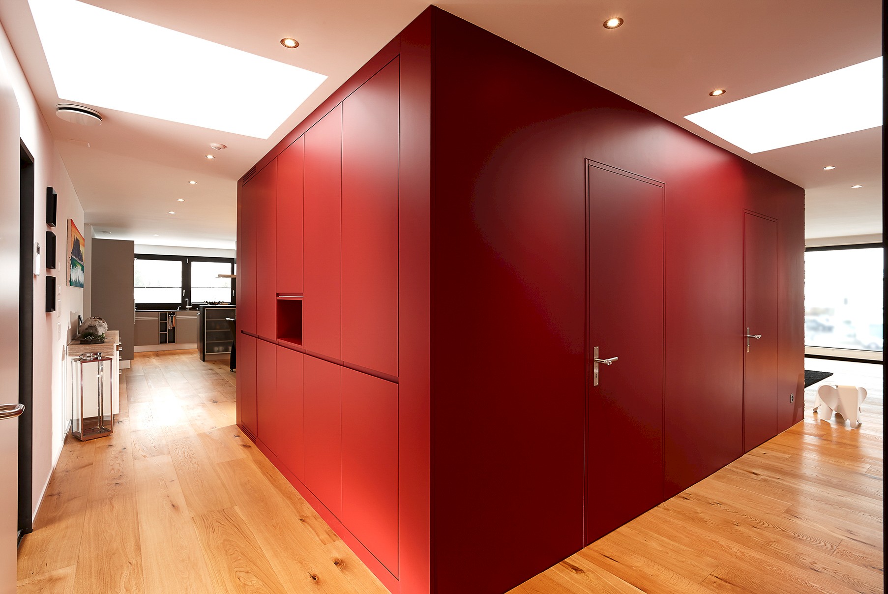 Auch im Wohngeschoss darüber dominiert Parkett, raffiniert kombiniert mit Steinbelägen, farbigen Wänden und Textilien. Der zentrale Kubus beinhaltet neben dem Cheminée auch ein Reduit und eine Toilette und sorgt im sonst sehr offenen Küchen- und Wohnraum für den nötigen Halt.