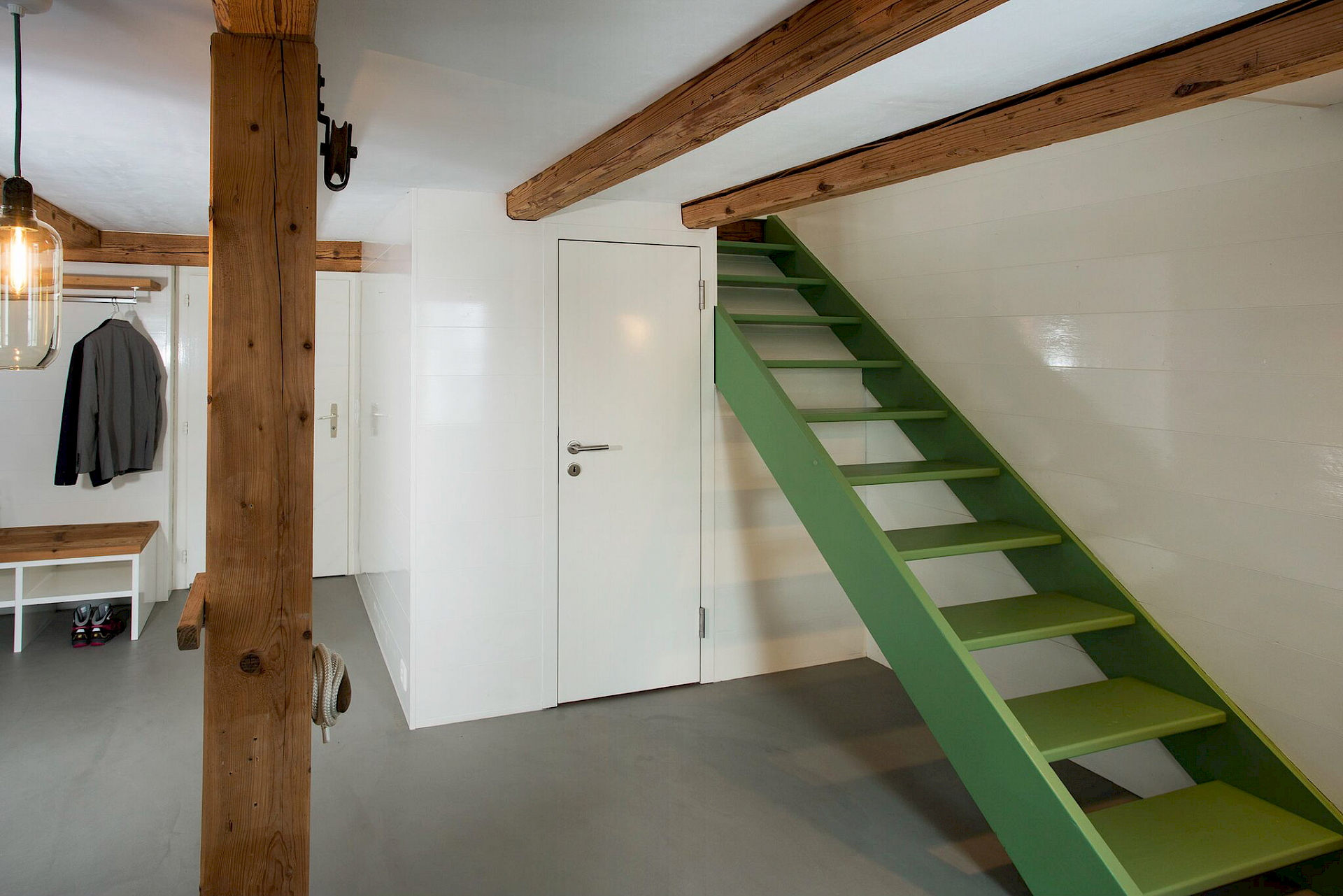 grosszügiger Garderobe und einem kleinen Gästebad platziert. Durch die grüne Holztreppe gelangt man ins