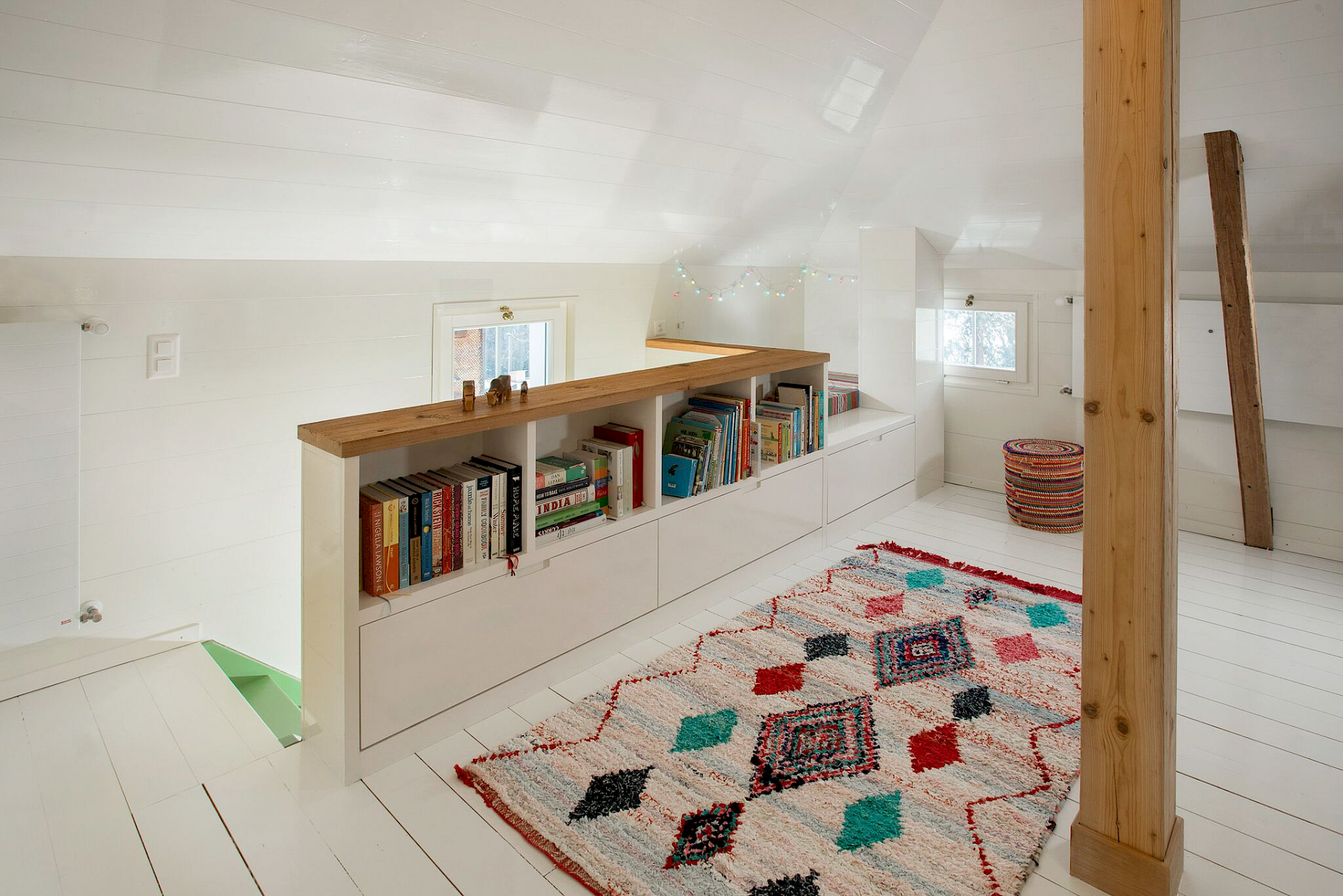 gezügelt, Bücherregale und eine Sitznische auf Mass für den neu entstandenen Raum produziert. Die bestehende
