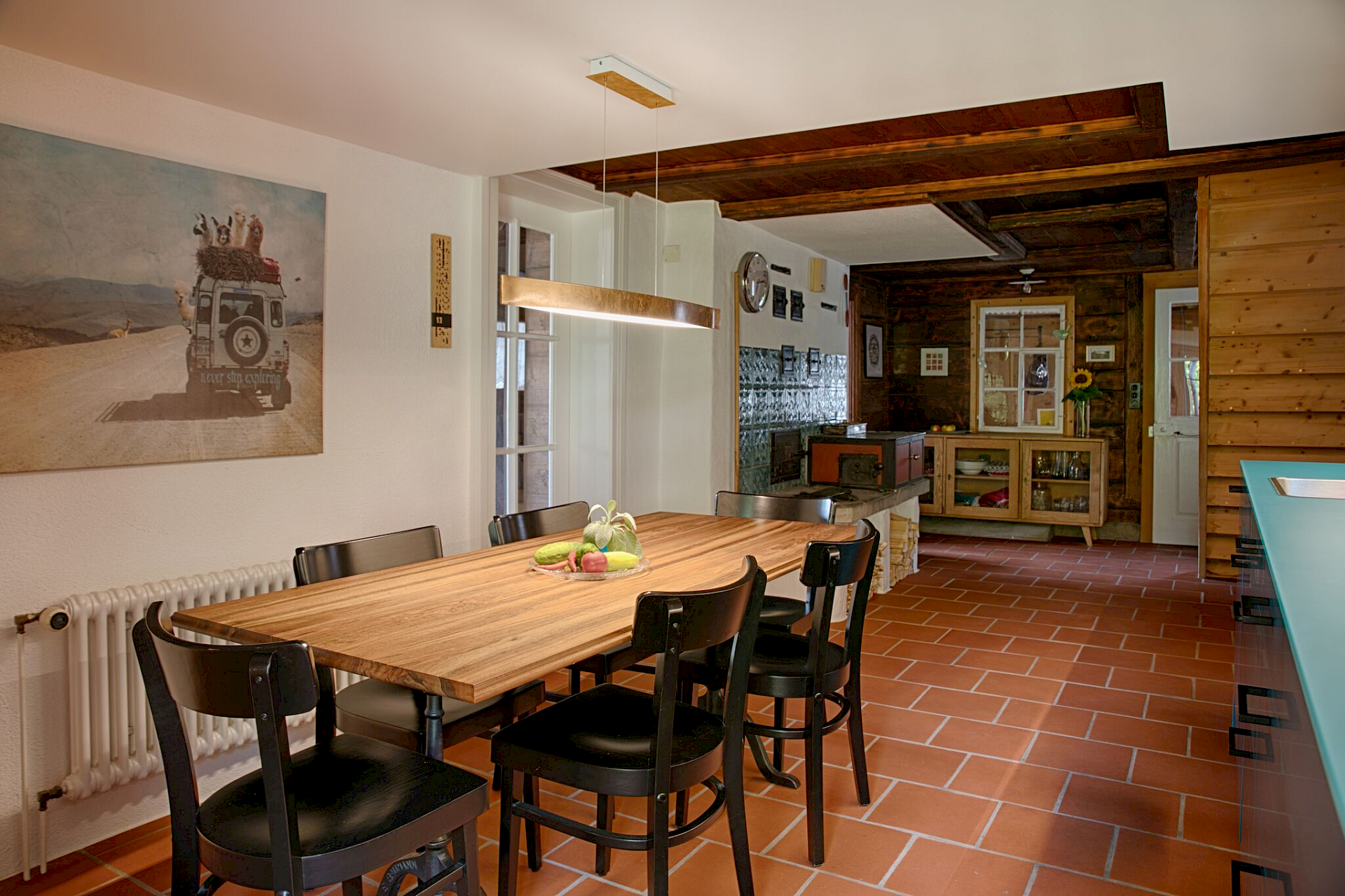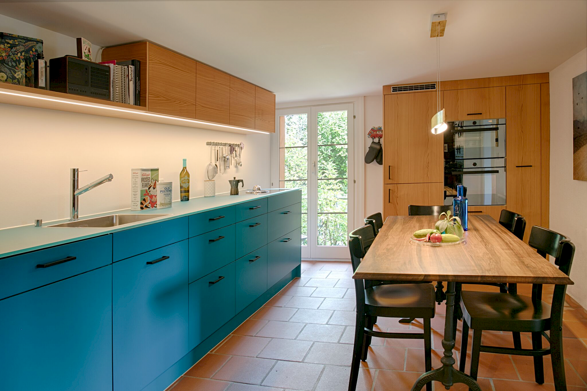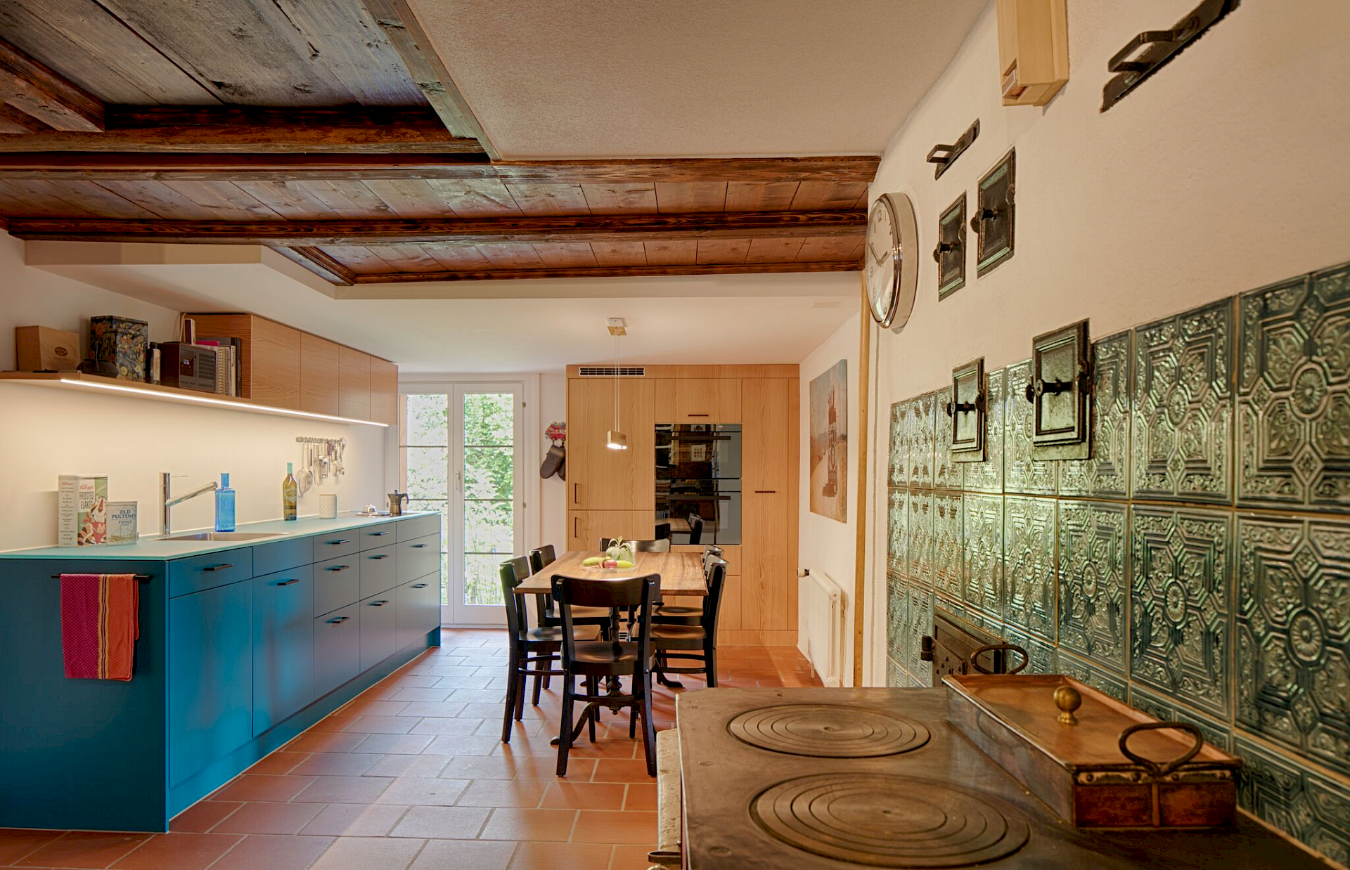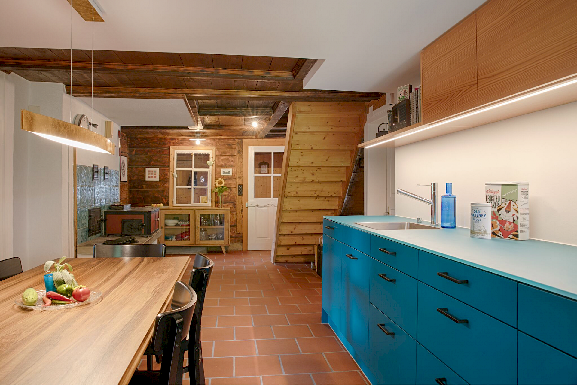 bestehenden Wandfliessen im Bereich des Ofens dienten als Inspiration für die Farbgebung der Küchenfronten.