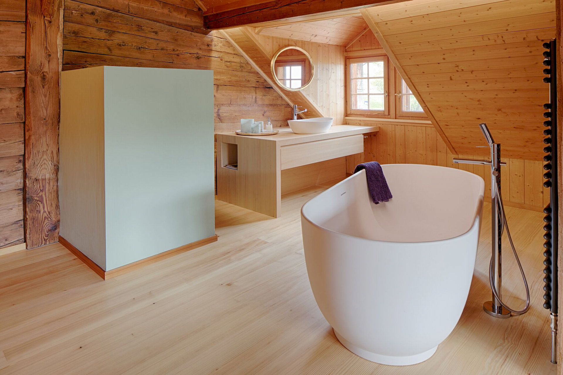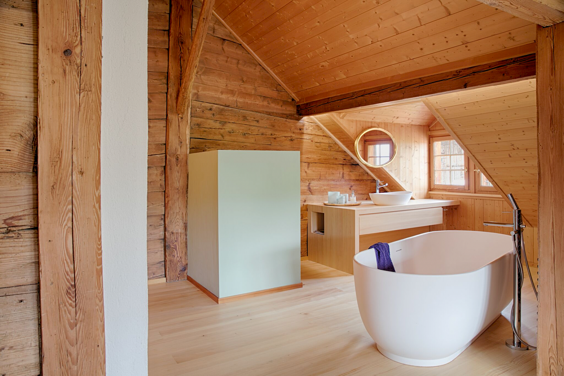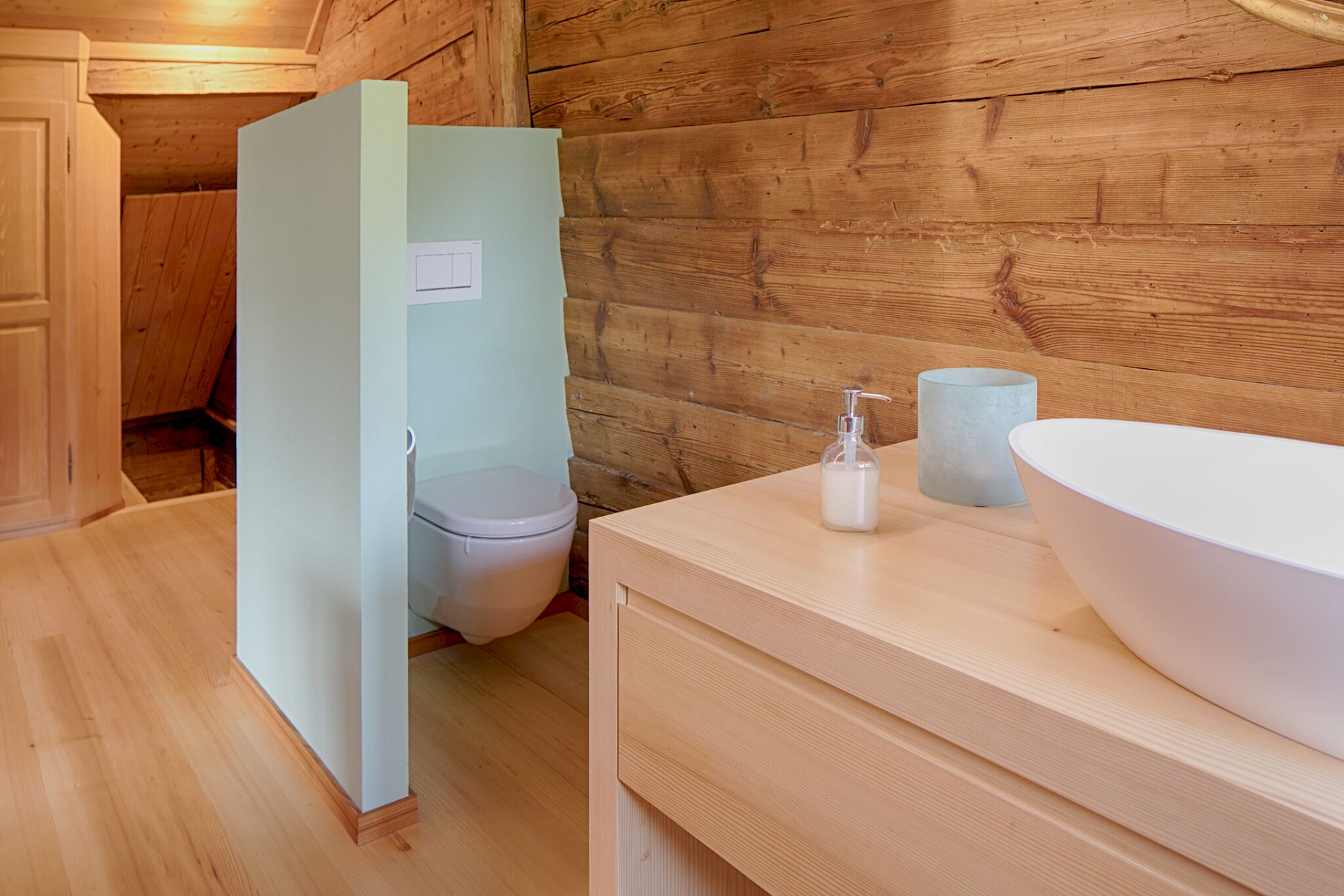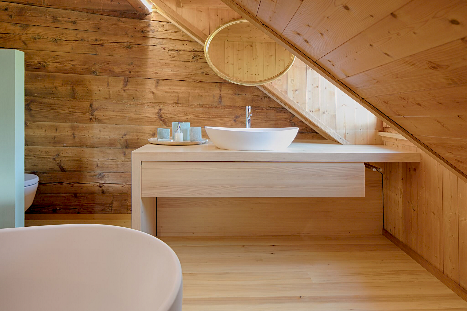 Waschtischmöbel, Toilettennische und Badewanne ist ein atmosphärischer Raum mit viel ursprünglichem Holz