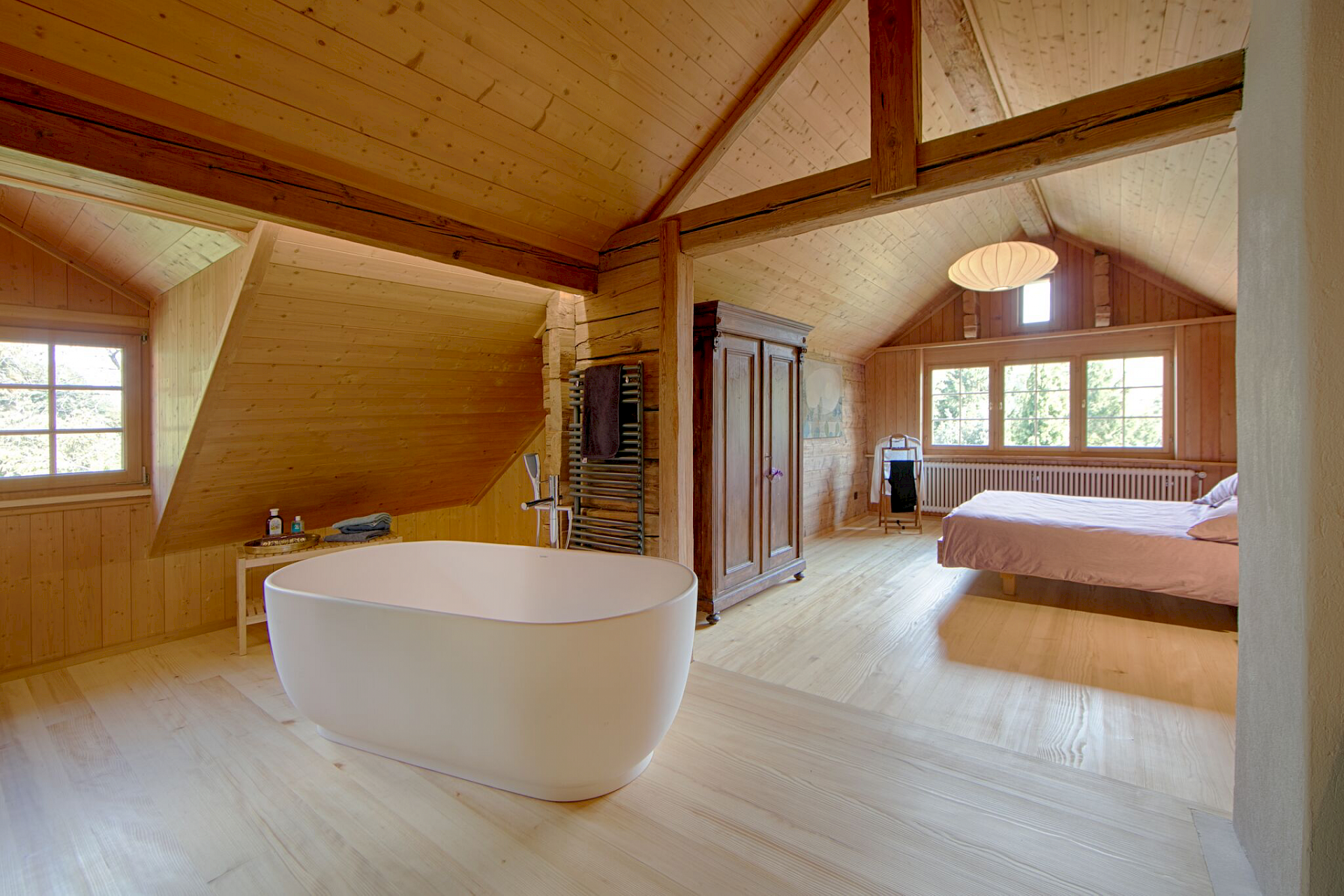 Offenes Bad und Schlafzimmer im Dachgeschoss