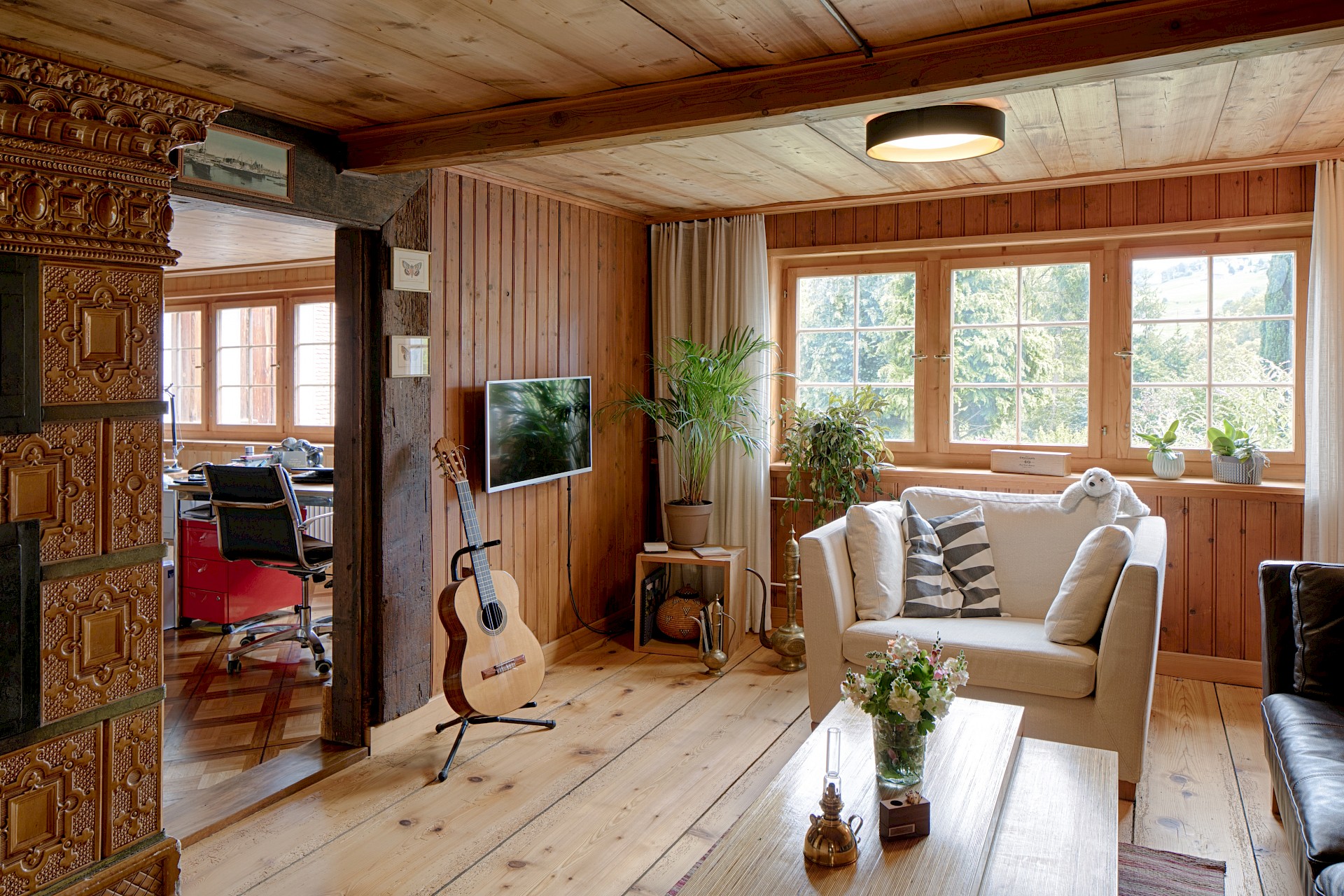 Wohnzimmer wurde nur subtil saniert: die Böden angeschliffen und neu geölt, die Lambrien ersetzt und wie auch