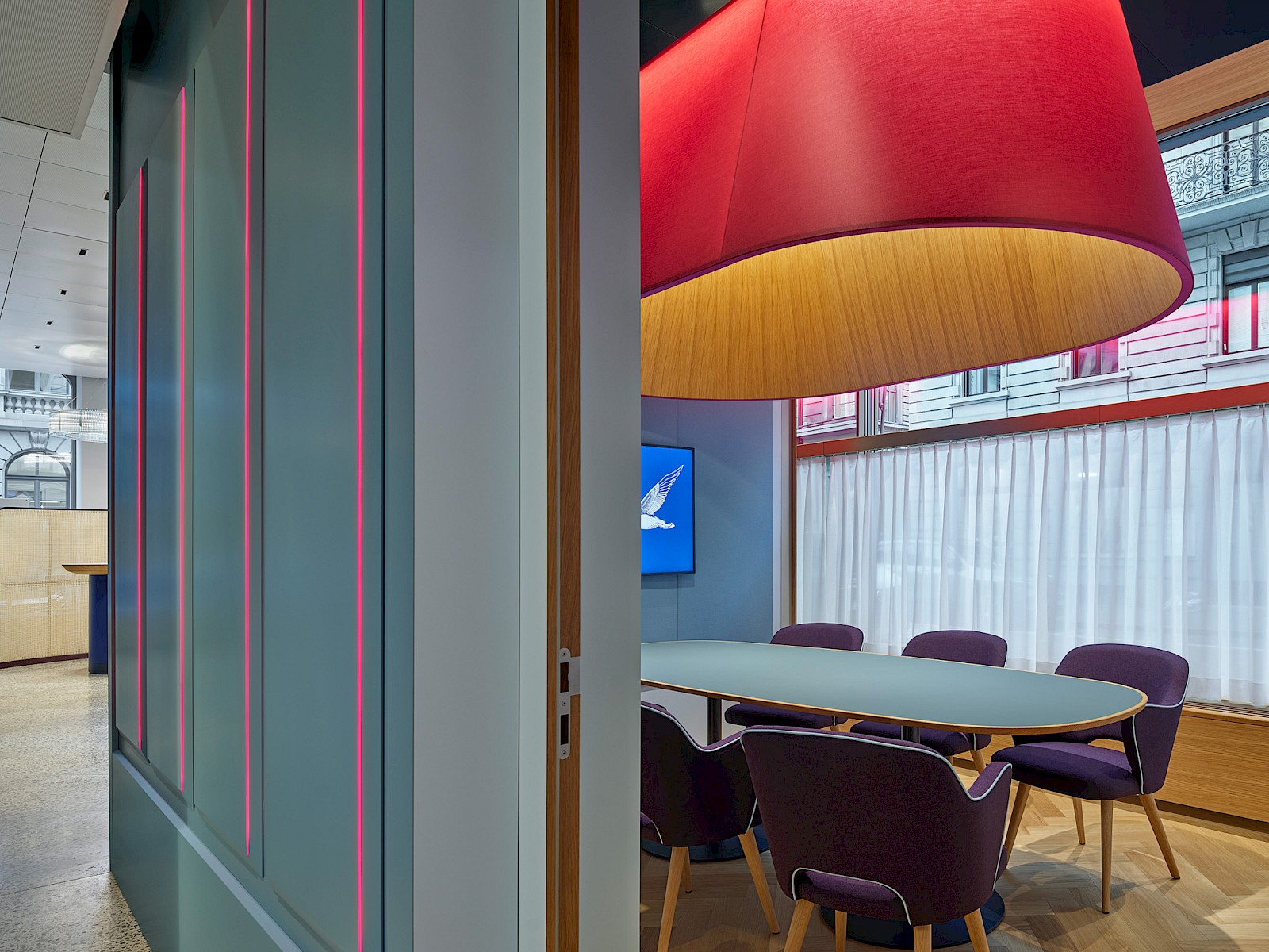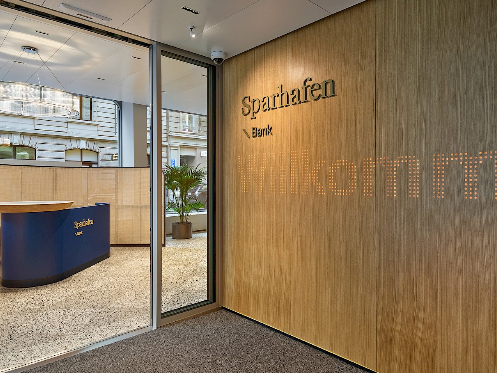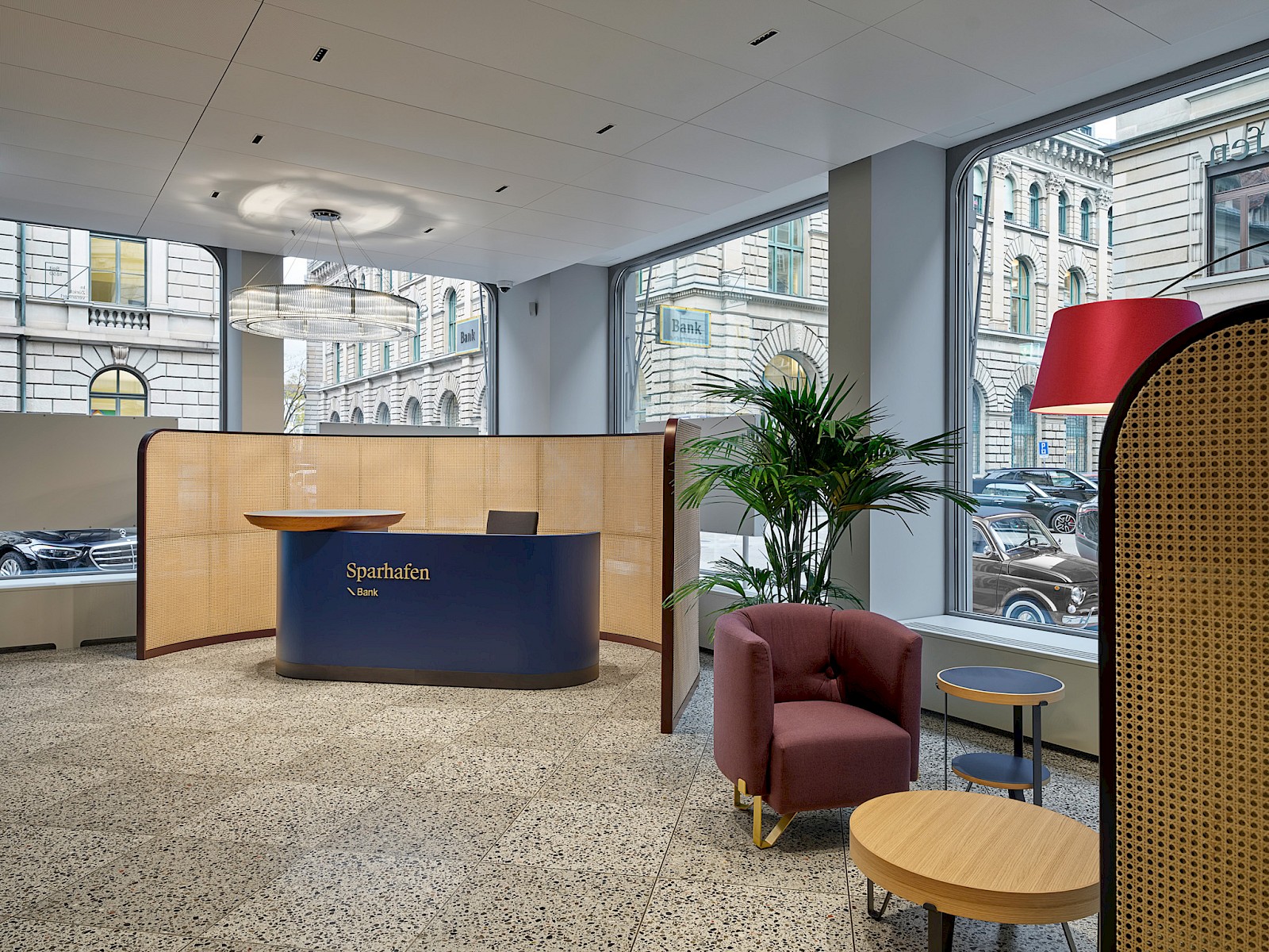 Ein zentrales Element des neuen Raumkonzepts ist die grossflächige Wandverkleidung aus Eiche, die mit rund 13'000 LEDs hinterleuchtet wird. Diese dynamische Lichtinszenierung leitet Besucherinnen und Besucher ins Innere der Bank. Dort wird man von einem formverleimten Empfangsmöbel begrüsst, das vor einem Paravent aus Wiener Geflecht platziert ist. Dieses klassische Handwerkselement knüpft an die Jugendstil-Geschichte des Gebäudes an und setzt gleichzeitig moderne Akzente.