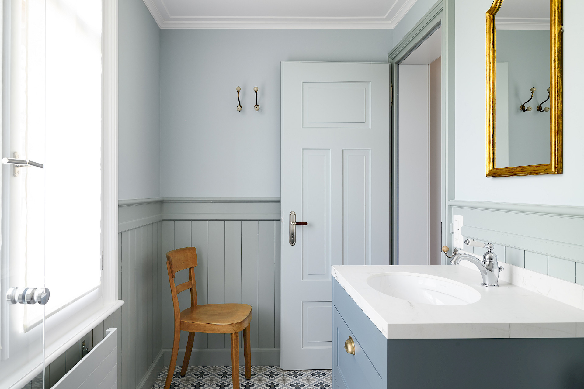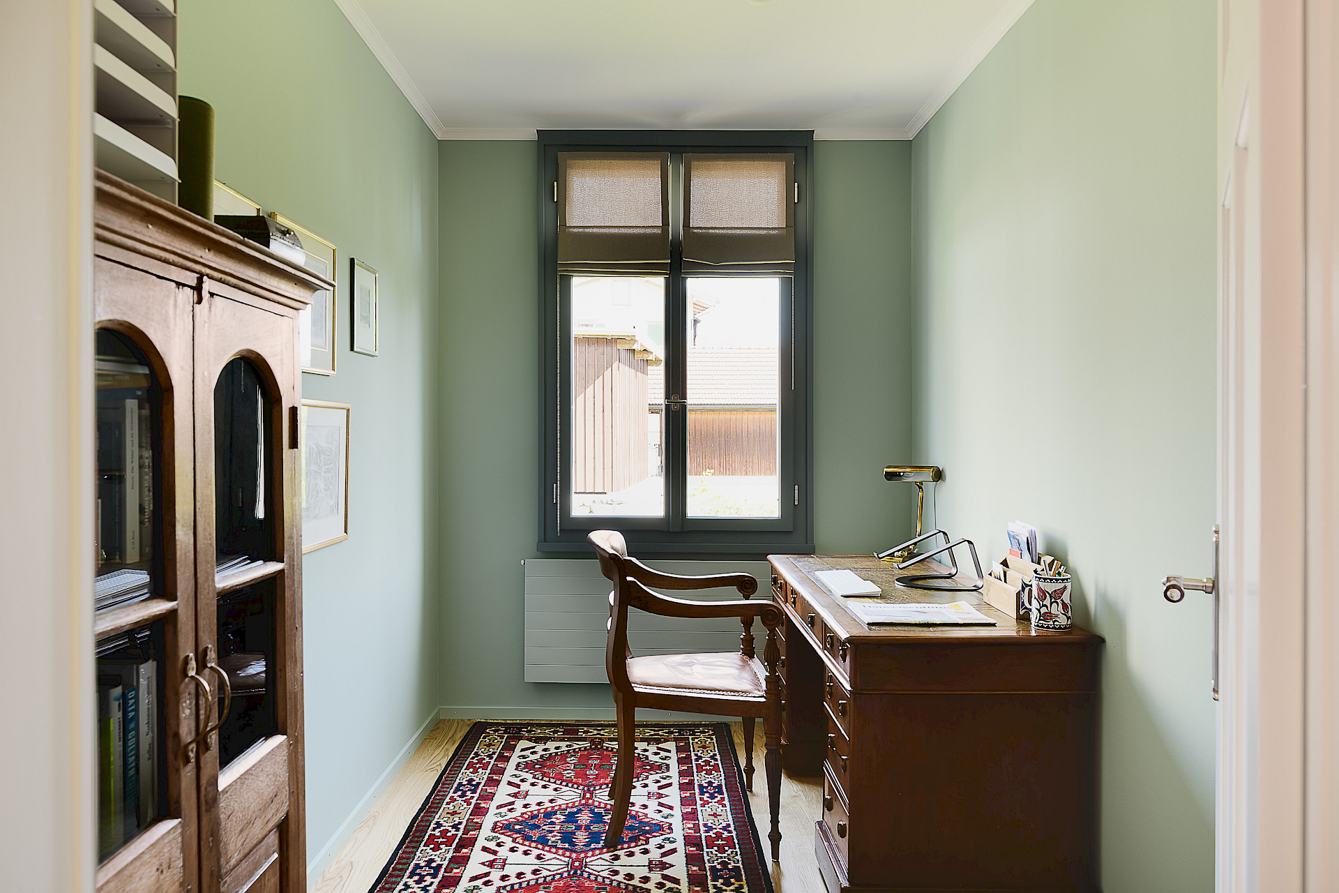 Der sensible Umgang mit dem geschichtsträchtigen Baubestand zeigt sich dabei in allen Räumen – Parkettböden, Deckenprofile, Wandtäfer, Treppentritte oder Heizkörper wurden allesamt aufgefrischt. Ergänzt wurden die baulichen Massnahmen ausserdem mit Einbauten, die sich durch ihren Stil bestens in das Haus einfügen – eine Einbauküche, Badmöbel, Einbauschränke, zum Teil neue Fenster und auf der Ostseite ein stattlicher Balkon mit einer Aufgangstreppe vom Garten her. Wichtig auch: Die Wohnräume wurden durch die Bauherrin mit viel Liebe zum Detail eingerichtet und möbliert – vom Arbeitsstuhl bis hin zum Wasserhahn.